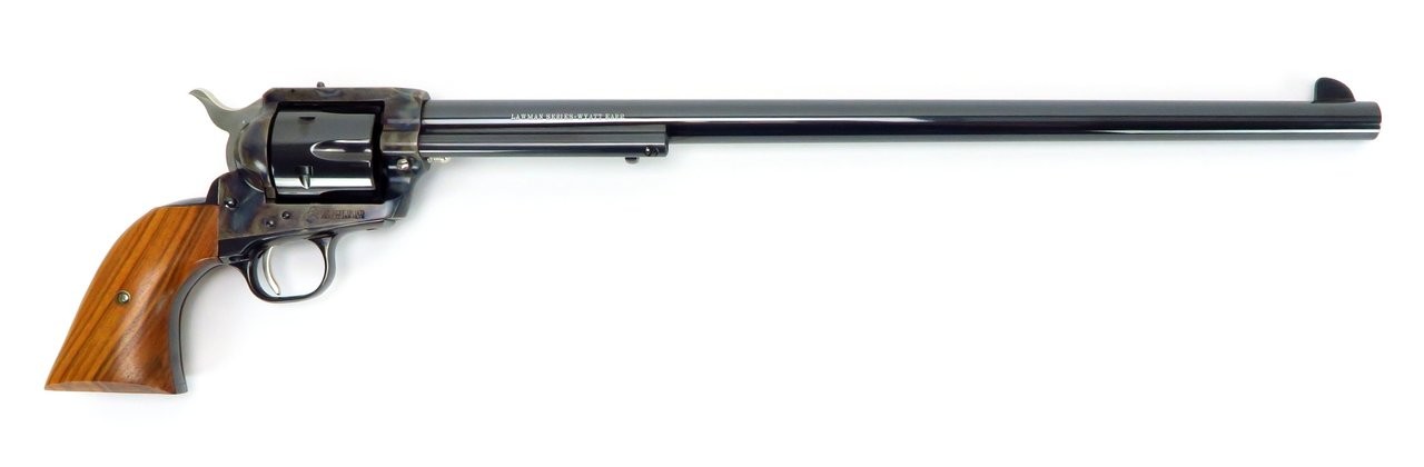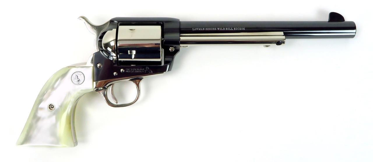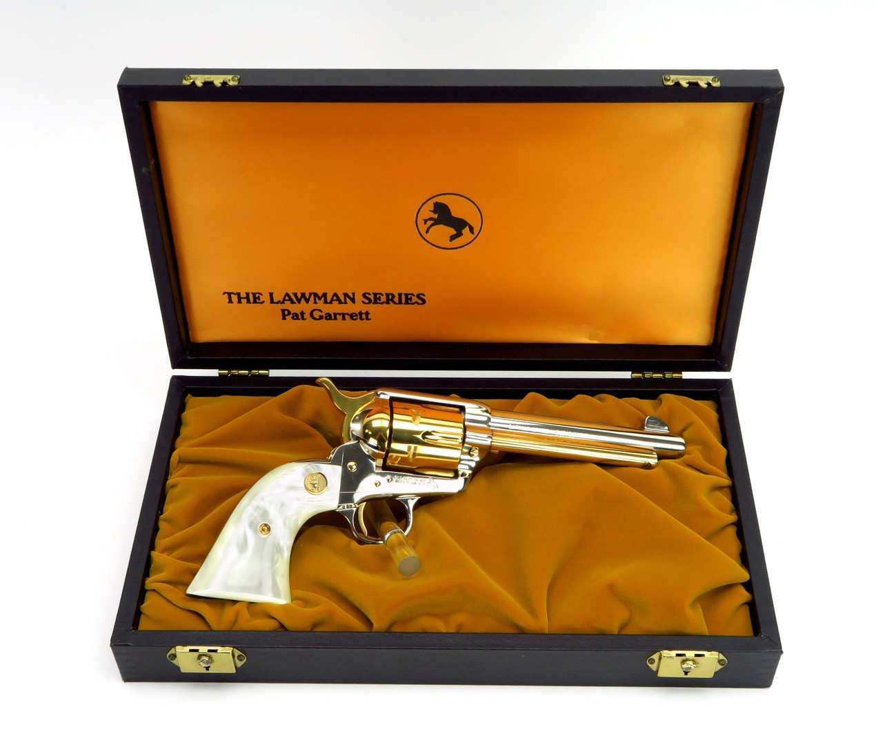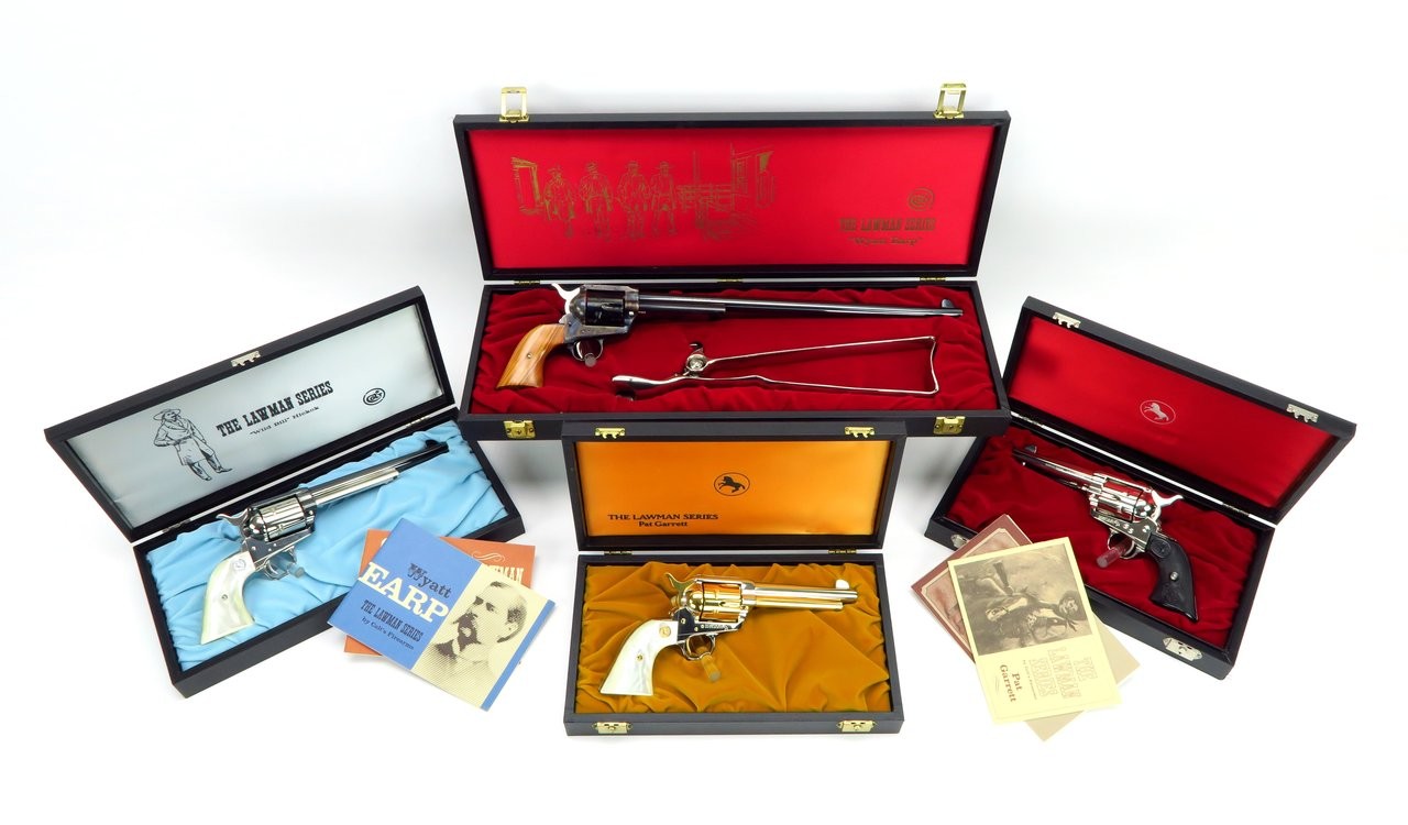 Rare Colt Lawman Series Single Action .45 caliber revolvers. Complete set of four 2nd Gen Single Actions with matching serial numbers, all № 83. Includes the 1964 Wyatt Earp Buntline, 1967 Bat Masterson, 1968 Pat Garret, and 1969 Wild Bill Hickok. Hard to find a complete matching set, this one is in mint condition!