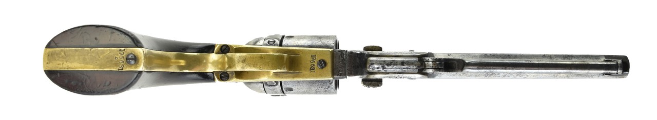 Rare Colt London Navy Revolver with Rare Thuer Conversion. All numbers match except the loading lever which has no number. The exterior of the gun has been pitted and buffed. Amazingly the bore is excellent. Action works perfectly. Grips are very good. Butt serial number has the letter “L” for London. Colt Thuer conversions are very rare. This is a reasonably priced Thuer. You will not find one even close to this price.