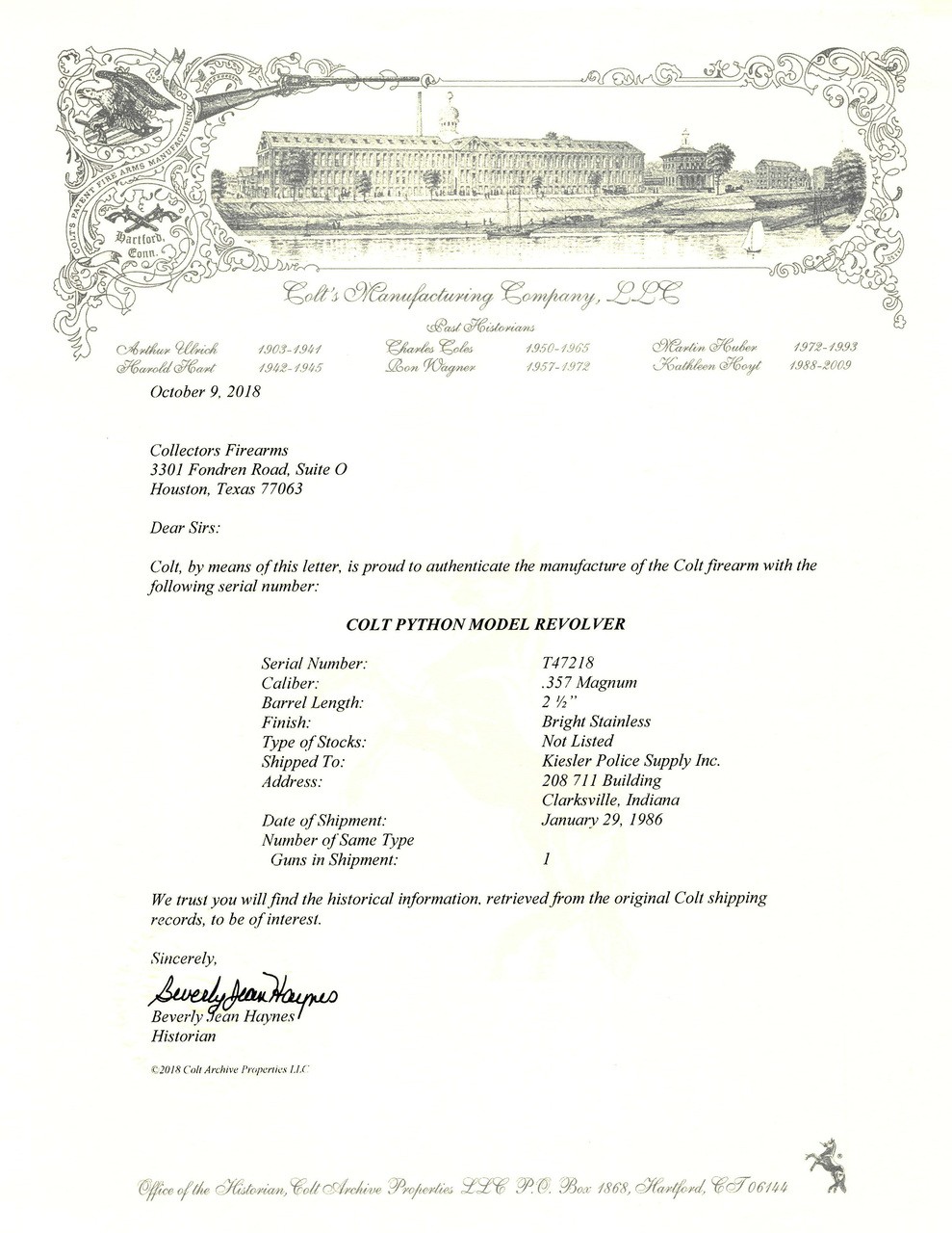 Rare Colt Python 2.5” Bright Stainless .357 Magnum Revolver. A rare and desirable snubnose Python with Bright Stainless finish. Has a factory letter confirming the Bright Stainless finish, made in 1986. The gun is in excellent condition but in our opinion we believe that the gun has been re-polished. Regardless, it’s a factory Bright Stainless gun with letter so there’s no doubt about the authenticity of it. One of the best Colt Snake Guns for your collection.