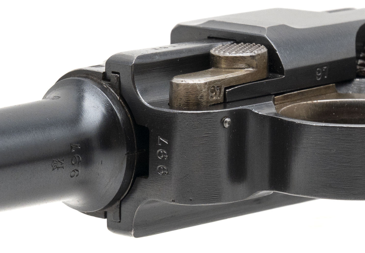 Serial number 997. Made in 1916. 9mm caliber with a 6” barrel. This is a scarce 1916 imperial Navy Luger. This gun is in like new condition as restored. This gun is all matching including the magazine. Most of these guns were destroyed or altered. Very scarce attractive gun!