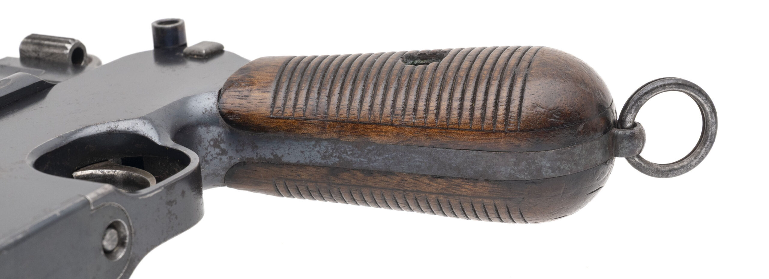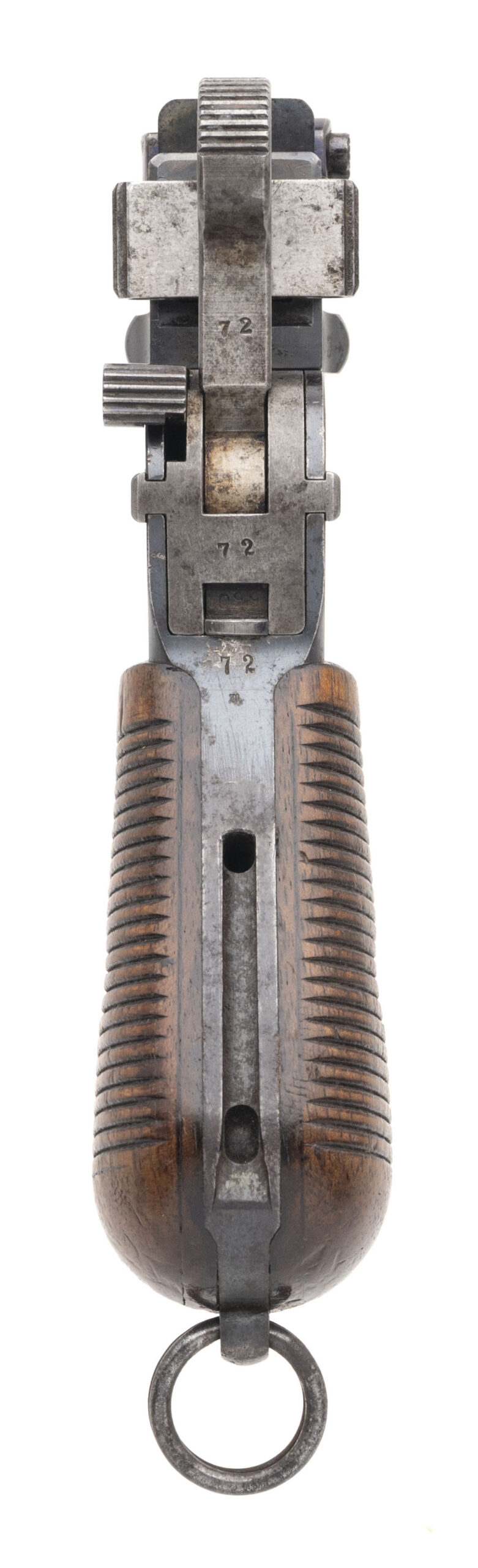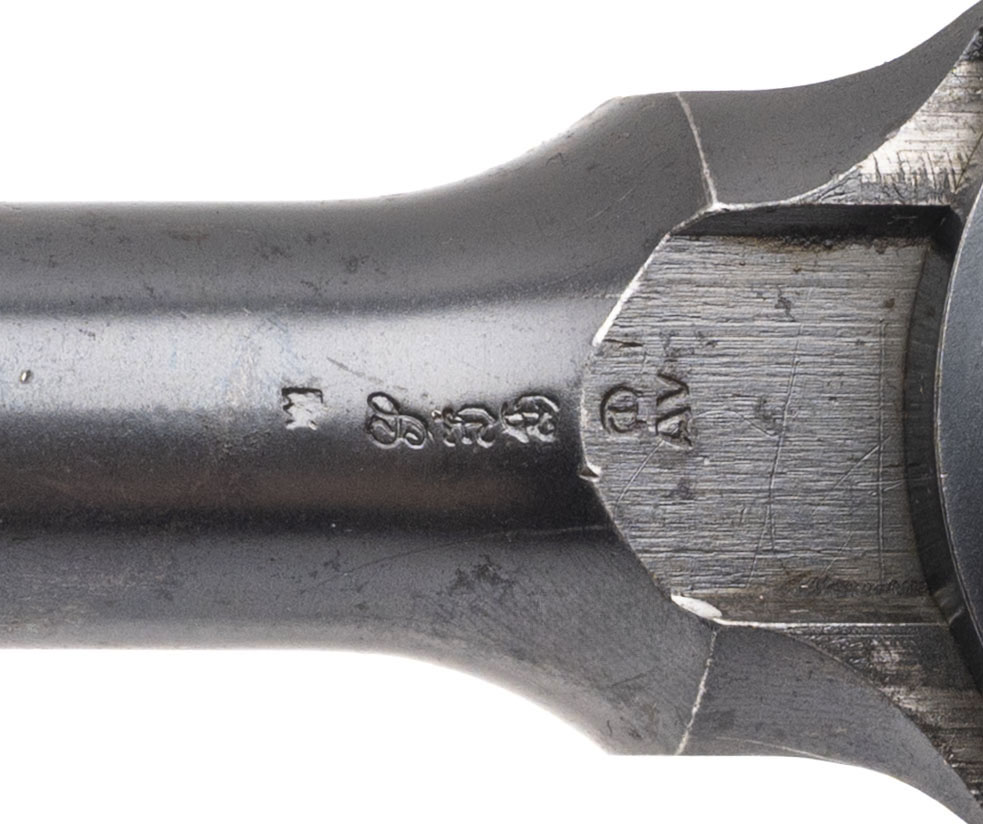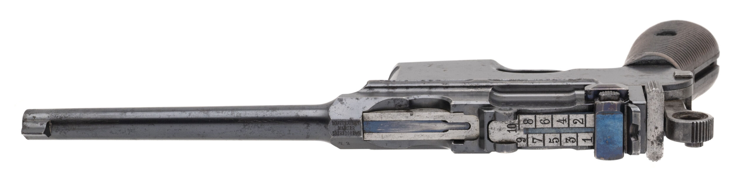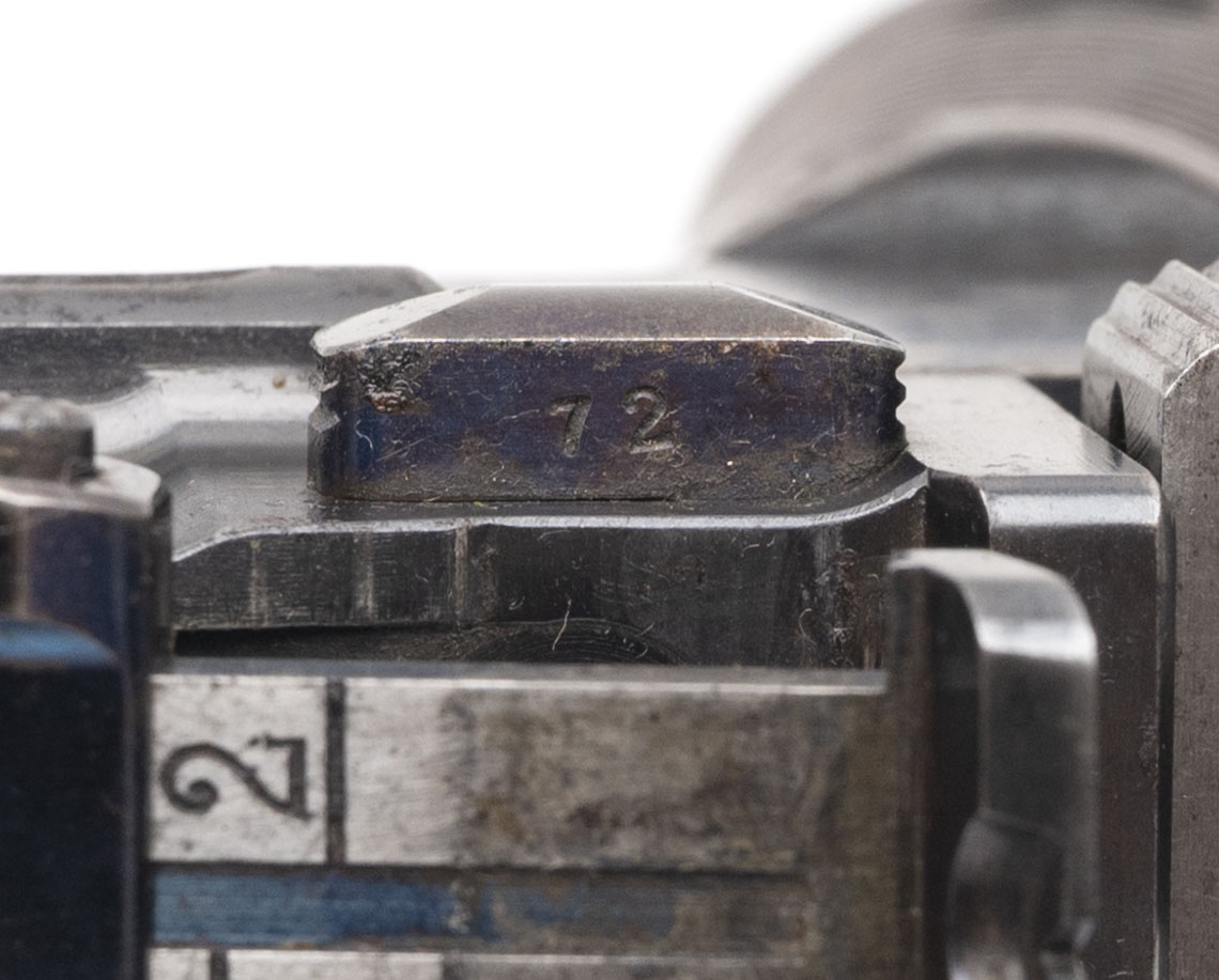SN: 72. Made in 1899. 7.63 Mauser caliber with a 5.5” barrel. Very fine condition with over 70% of the original blue finish. This gun does not have the milled paned and has a flat profile frame hence the collector’s term “flat side” This is an early gun with the large Ring hammer. There is a “DV” mark on the left hand side of the barrel which was the Italian Navy’s acceptance mark. The Italian navy contract guns were in there own serial range starting at serial number 1, so this is the 72nd gun in the contract. There was a total of 5003 in the contract. This is a very fine example and all original.