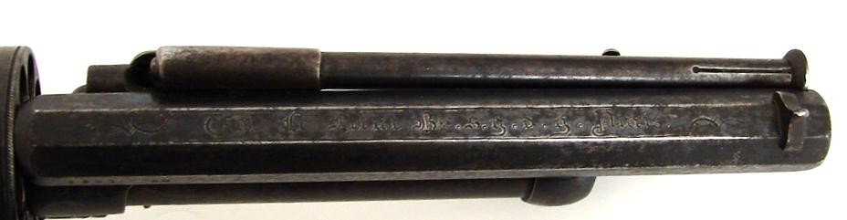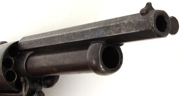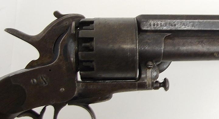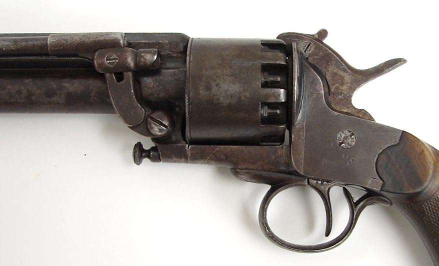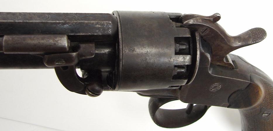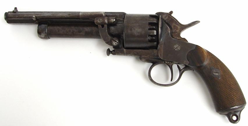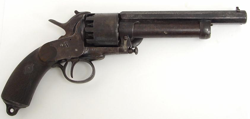 Rare Le Mat 2nd model revolver manufactured in Paris. 8-shot 10.6mm with 16 gauge shotgun barrel below. Popular gun with the Confederacy. Jeb Stuart and Gen. Beauregard both carried them. This gun is in fine condition with about 25-30% blue. Le Mats with any original blue are scarce. One of classic percussion revolvers of the Civil War!