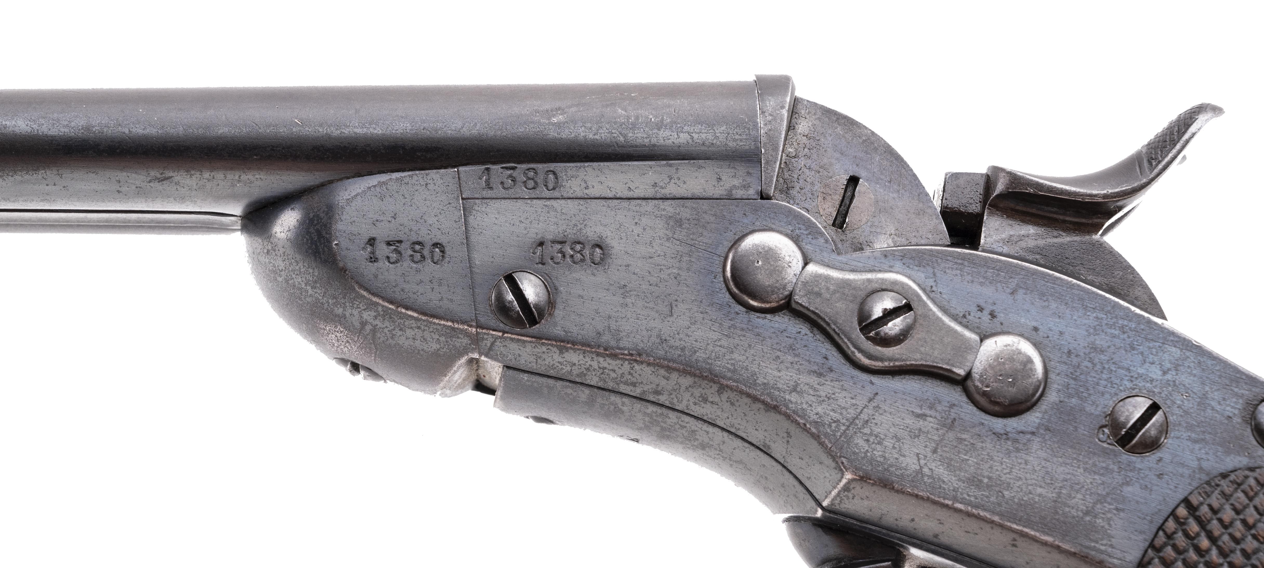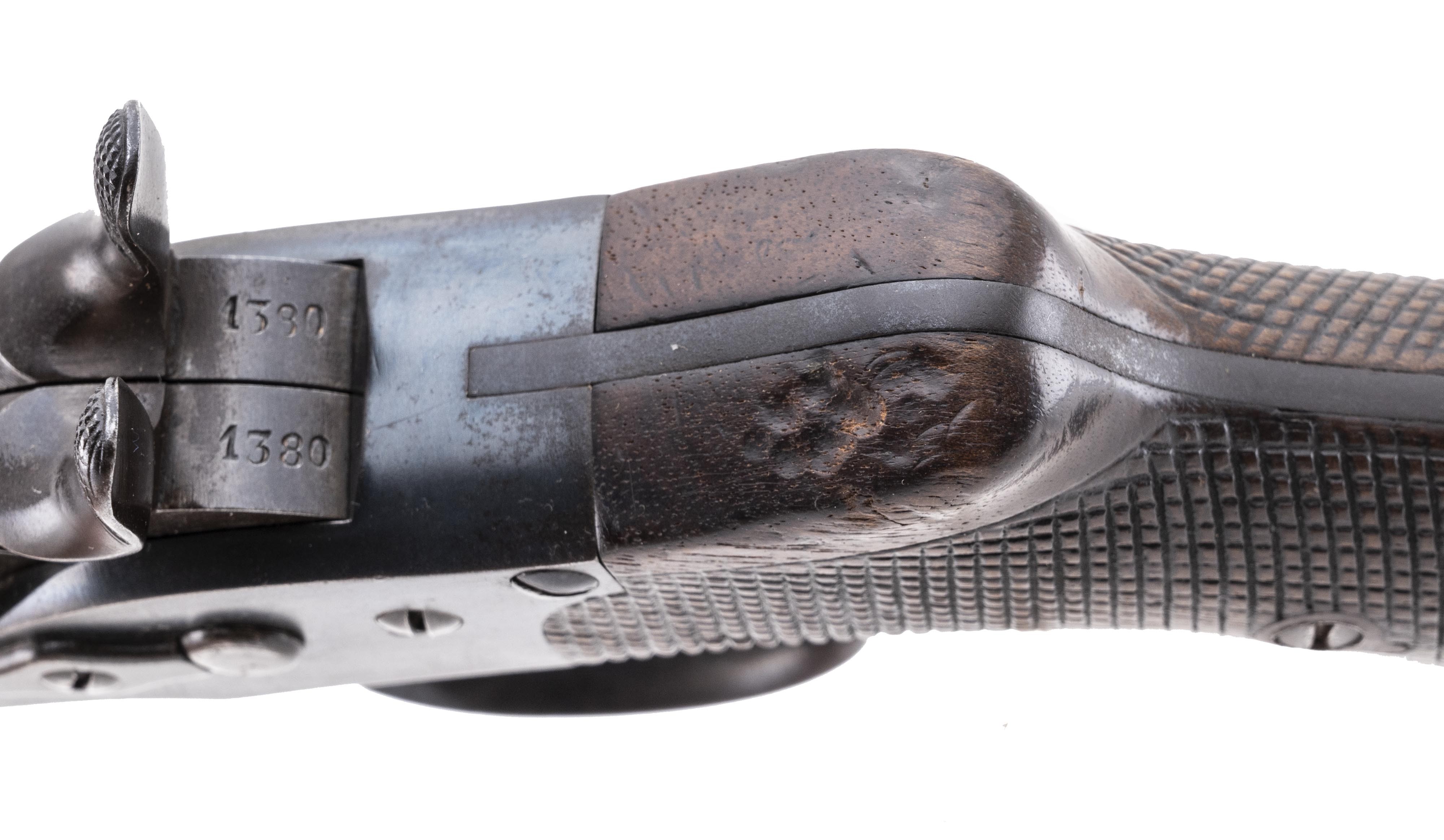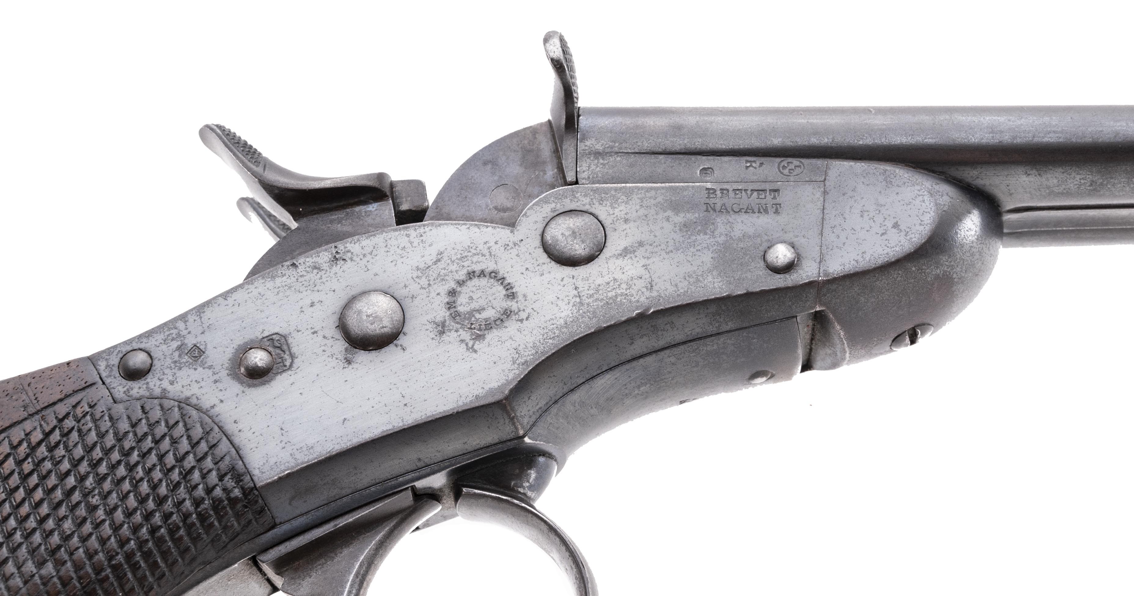 “Nagant” is most often associated with the Model 1895 Russian Nagant revolver and as the second name in the Russian Model 1891 Mosin-Nagant Rifle. Despite the general assumption by most arms collectors that “Nagant” was a Russian, it is actually the last name of a pair of Belgian brothers, Emile and Leon Nagant. Sometime around 1867 the Nagant brothers met Samuel Remington during his visit to Europe and entered into a licensing arrangement to produce Remington’s Rolling Block designs. In 1877, the brothers received a patent for a single trigger, double hammer lock work that allowed a single trigger to be pulled twice, tripping the right and then left hammer sequentially with each successive pull. This patent along with two prior Belgian issued patents was utilized in the design of a new pistol for the Belgian mounted police. The Belgian Model 1877 Nagant Gendarmerie Pistol is a double-barreled, single trigger, double hammer, 9.4mm center fire metallic cartridge pistol based upon the Remington Rolling block design. In 1877, the Belgian government contracted for 2,000 pistols and made Nagant the exclusive supplier of police pistols through 1901. These pistols would remain in service through the turn of the century until they were replaced by Browning Model 1899 semi-automatic pistols in 1901. This pistol has a 5.5” pair of rifled barrels with excellent bores, joined by central rib and is about 10.5” in overall length. It has a somewhat awkwardly shaped, long grip with checkered walnut grips and a lanyard ring in the butt. The sights are simple and fixed, with the rear sight being a small notch in the top of the pivoting breech plate and the front sight a small blade. Once the hammers were cocked, it takes a very long and heavy trigger pull to release the right hand hammer, while the left hand hammer is released by a somewhat shorter and lighter trigger pull. They were carried in pommel holsters on the saddle, thus the holster wear found on most examples is usually fairly significant and the fact that the leather holsters often absorbed moisture means that most examples suffer from “poor storage” as well. However, with only 2,000 pistols produced, these guns are extremely scarce, particularly on the American firearms collecting market. This pistol is a fine condition example. It remains 100% complete, correct and original and has all matching serial numbers of 1380. This number appears on the left side of the barrel, the barrel web, the frame, both hammers, the breech block, both hammers, and the butt cap. It retains about 40% of the original blue finish, with the remainder turning a smooth, dull plum patina that blends well with the blue. The right side of the frame is stamped with the circular legend EM & L NAGANT LIEGE and with a small Lion Passant cartouche. It is also stamped under the barrel on the right side of the frame BREVET over NAGANT. The right breech of the barrel is stamped with the oval ELG* Liège proof mark, along with a * over K controller’s mark and an additional small inspection mark. The controller's mark is also found forward of the trigger guard. The bottom of the grip cap is stamped with the serial number and the W police issue marking. The markings are clear and legible. The pistol is in perfect mechanical condition and the action remains fine and crisp. The grips are solid and free of any breaks, cracks or repairs. The grips do show scattered bumps and dings with more moderate dings on the left grip panel. Overall, this is a solid, attractive all complete and correct example of a Belgian Model 1877 Nagant Gendarmerie Pistol. These are scarce guns with only 2,000 manufactured and are fairly rare on the collector market. They fall into multiple handgun collector categories, including police pistols, secondary Remington handguns and rolling block firearms, Nagant pattern arms and curiosa, as double-barreled cartridge pistols like this are somewhat uncommon. No matter what your area of collecting, this is a relatively uncommon pistol with a unique silhouette which will certainly be a nice addition to your collection.