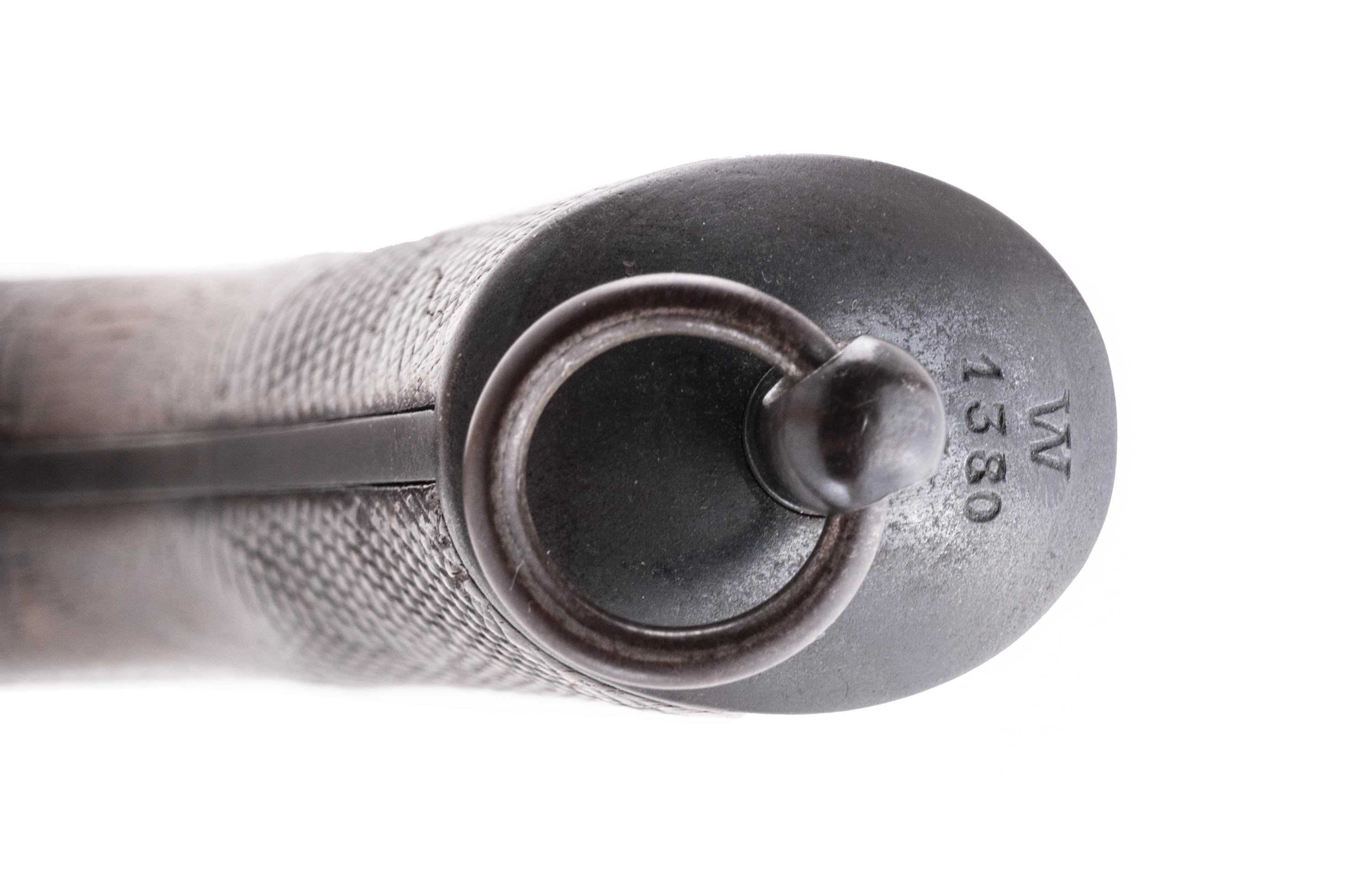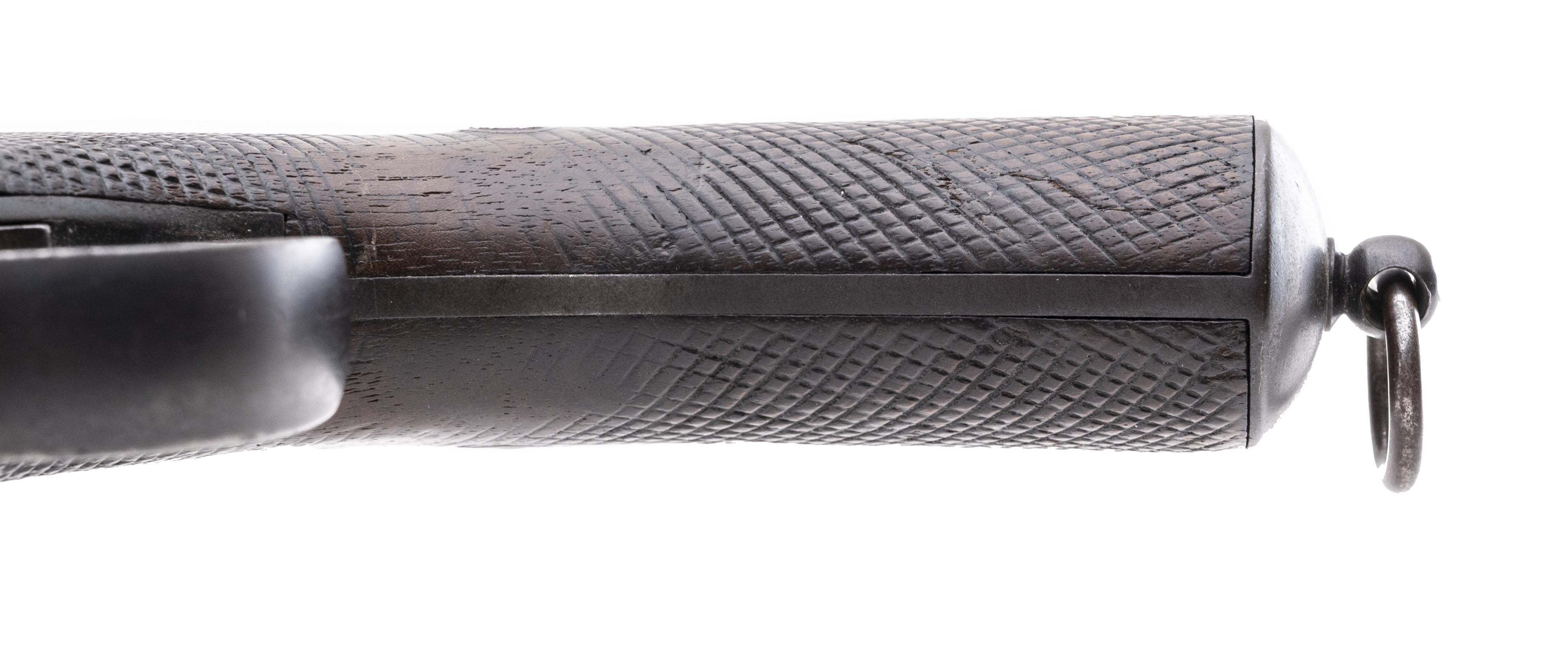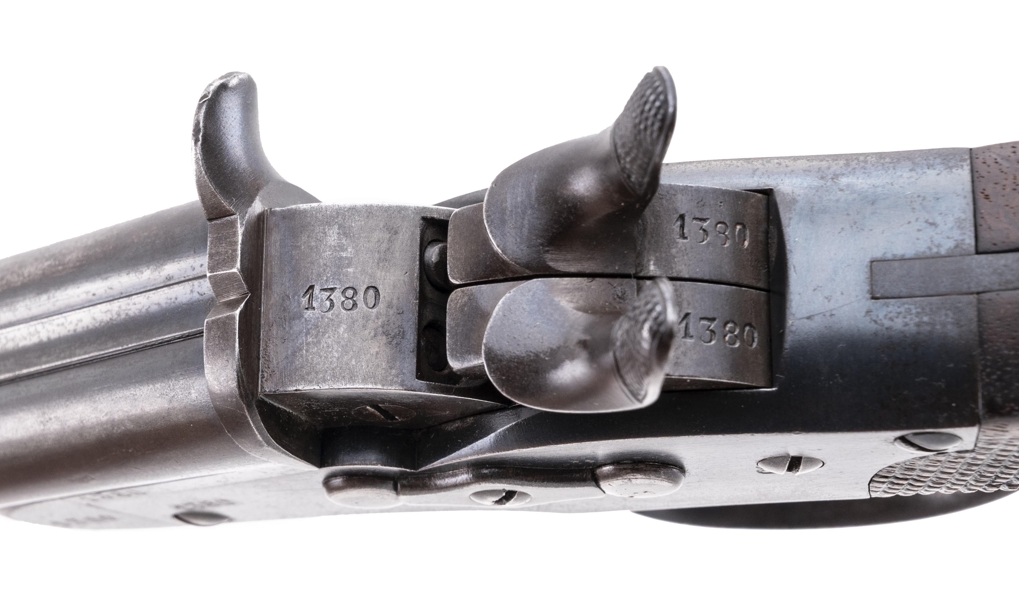 “Nagant” is most often associated with the Model 1895 Russian Nagant revolver and as the second name in the Russian Model 1891 Mosin-Nagant Rifle. Despite the general assumption by most arms collectors that “Nagant” was a Russian, it is actually the last name of a pair of Belgian brothers, Emile and Leon Nagant. Sometime around 1867 the Nagant brothers met Samuel Remington during his visit to Europe and entered into a licensing arrangement to produce Remington’s Rolling Block designs. In 1877, the brothers received a patent for a single trigger, double hammer lock work that allowed a single trigger to be pulled twice, tripping the right and then left hammer sequentially with each successive pull. This patent along with two prior Belgian issued patents was utilized in the design of a new pistol for the Belgian mounted police. The Belgian Model 1877 Nagant Gendarmerie Pistol is a double-barreled, single trigger, double hammer, 9.4mm center fire metallic cartridge pistol based upon the Remington Rolling block design. In 1877, the Belgian government contracted for 2,000 pistols and made Nagant the exclusive supplier of police pistols through 1901. These pistols would remain in service through the turn of the century until they were replaced by Browning Model 1899 semi-automatic pistols in 1901. This pistol has a 5.5” pair of rifled barrels with excellent bores, joined by central rib and is about 10.5” in overall length. It has a somewhat awkwardly shaped, long grip with checkered walnut grips and a lanyard ring in the butt. The sights are simple and fixed, with the rear sight being a small notch in the top of the pivoting breech plate and the front sight a small blade. Once the hammers were cocked, it takes a very long and heavy trigger pull to release the right hand hammer, while the left hand hammer is released by a somewhat shorter and lighter trigger pull. They were carried in pommel holsters on the saddle, thus the holster wear found on most examples is usually fairly significant and the fact that the leather holsters often absorbed moisture means that most examples suffer from “poor storage” as well. However, with only 2,000 pistols produced, these guns are extremely scarce, particularly on the American firearms collecting market. This pistol is a fine condition example. It remains 100% complete, correct and original and has all matching serial numbers of 1380. This number appears on the left side of the barrel, the barrel web, the frame, both hammers, the breech block, both hammers, and the butt cap. It retains about 40% of the original blue finish, with the remainder turning a smooth, dull plum patina that blends well with the blue. The right side of the frame is stamped with the circular legend EM & L NAGANT LIEGE and with a small Lion Passant cartouche. It is also stamped under the barrel on the right side of the frame BREVET over NAGANT. The right breech of the barrel is stamped with the oval ELG* Liège proof mark, along with a * over K controller’s mark and an additional small inspection mark. The controller's mark is also found forward of the trigger guard. The bottom of the grip cap is stamped with the serial number and the W police issue marking. The markings are clear and legible. The pistol is in perfect mechanical condition and the action remains fine and crisp. The grips are solid and free of any breaks, cracks or repairs. The grips do show scattered bumps and dings with more moderate dings on the left grip panel. Overall, this is a solid, attractive all complete and correct example of a Belgian Model 1877 Nagant Gendarmerie Pistol. These are scarce guns with only 2,000 manufactured and are fairly rare on the collector market. They fall into multiple handgun collector categories, including police pistols, secondary Remington handguns and rolling block firearms, Nagant pattern arms and curiosa, as double-barreled cartridge pistols like this are somewhat uncommon. No matter what your area of collecting, this is a relatively uncommon pistol with a unique silhouette which will certainly be a nice addition to your collection.