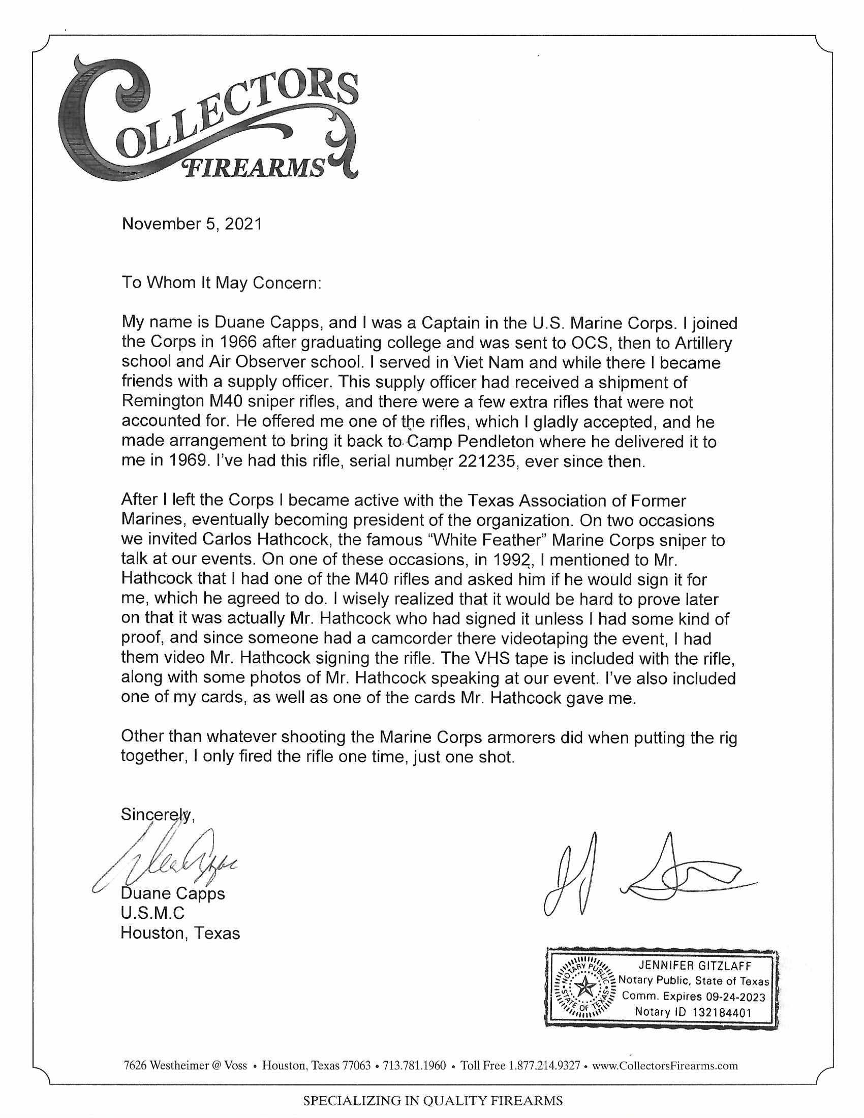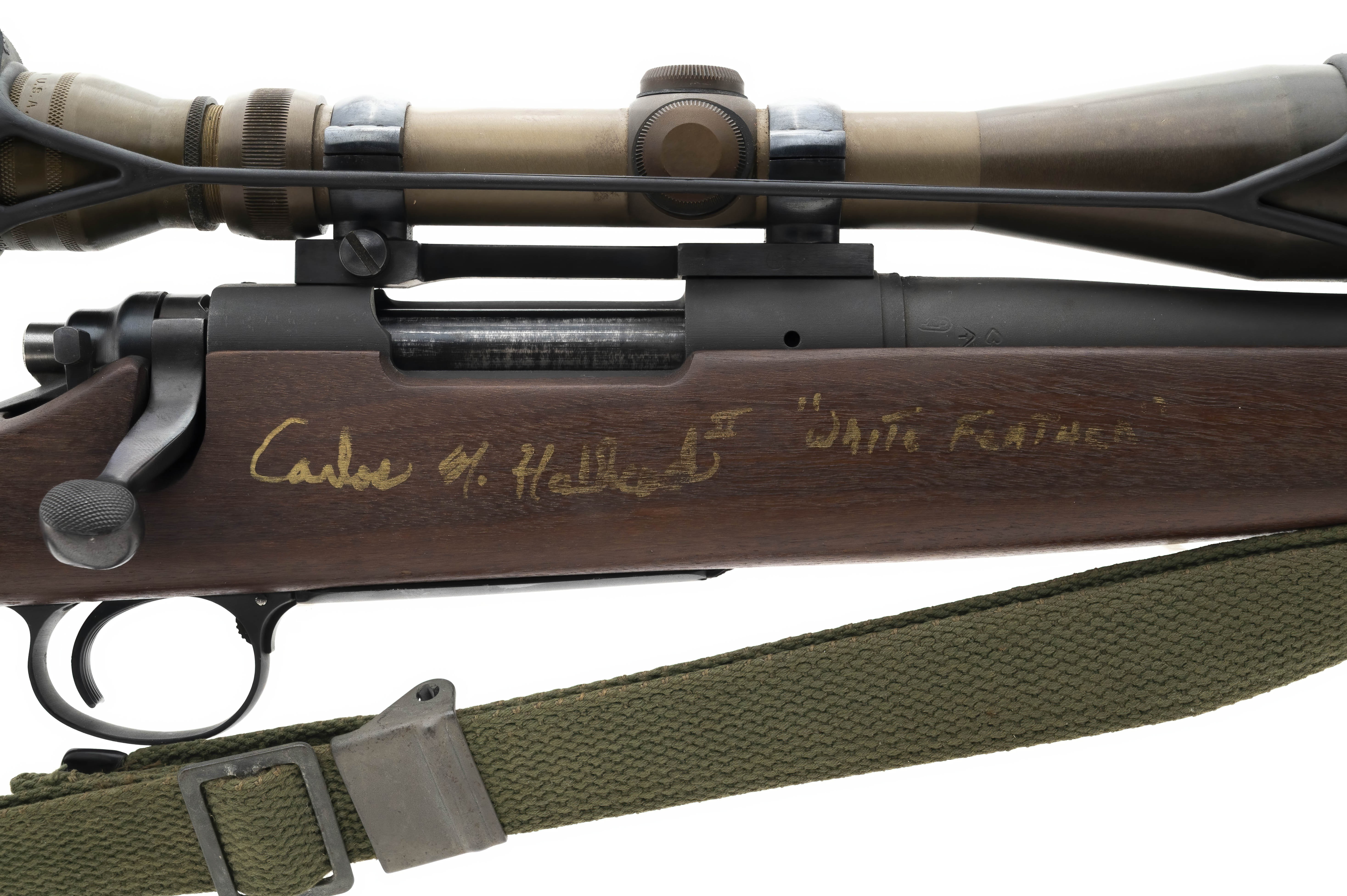 A one of a kind rifle! This is an original military issue Remington M40 sniper rifle brought back from Vietnam by a Marine officer, who later had it signed by Carlos “White Feather” Hathcock in 1992 at a Former Marine Association event. The rifle is in excellent condition showing only handling wear. The rifle, bolt, mount and scope are all matching numbered, as issued by the Marine Corps. Finding one of these historic rifles in this kind of condition is practically impossible, and having it signed by the famous White Feather sniper himself makes it an amazing collectible.