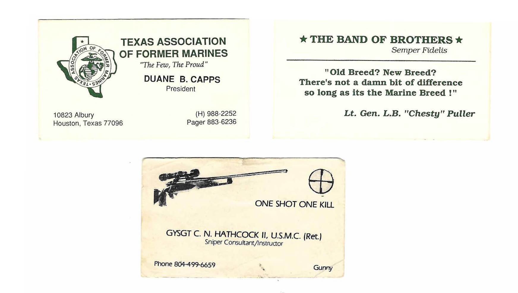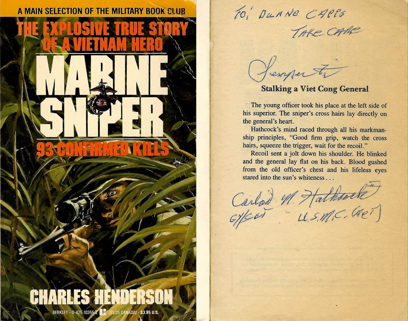 In addition to the VHS tape and DVD, included with this set is a letter from the Marine captain who owned the rifle explaining his history with it and how it came to be signed by Carlos Hathcock. Also included are photos of Hathcock speaking at the event, one of Hathcock’s cards, one of the original owner’s cards as president of the Former Marine Association, and a copy of Henderson’s book “Marine Sniper” inscribed by Hathcock to the owner of the rifle. A fantastic and historical set of items.