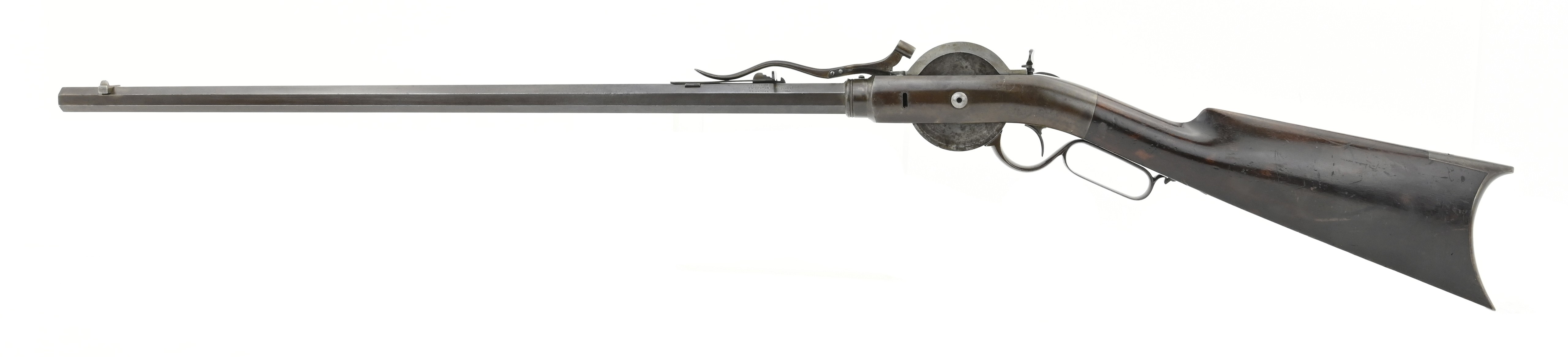 Rare P.W. Porter Second Model revolving turret rifle. In fine condition, the overall length is 46½”. The 28” octagon .50 caliber barrel has a very good bore with scattered pits. These percussion revolving turret rifles made for P.W. Porter, by G.P. Foster of Taunton, MA. The barrel is marked address “P.W. Porter/ New York” and “P.W. Porter’s / Patent/ 1851”. Metal has a smooth brown patina. Stock is very good, no cracks or chips with a few storage/ use dents and dings. The serial number, “442”, is on all major parts. This rifle has it all: action works correctly; removable u-shape turret cover is present (usually missing); percussion cap mechanism is complete. Front and rear sights are offset to the left, to clear the cylinder. The action is operated by a lever. Cycling the lever cocks the side mounted mule-ear hammer, revolves the turret into firing position, and moves a percussion cap into alignment with the hammer. The turret holds nine shots. This is a marvelous example of an early American revolving rifle and a tribute to P.W. Porter’s mechanical genius. Missing from all but the most advanced collections, especially given that it has the turret cover!