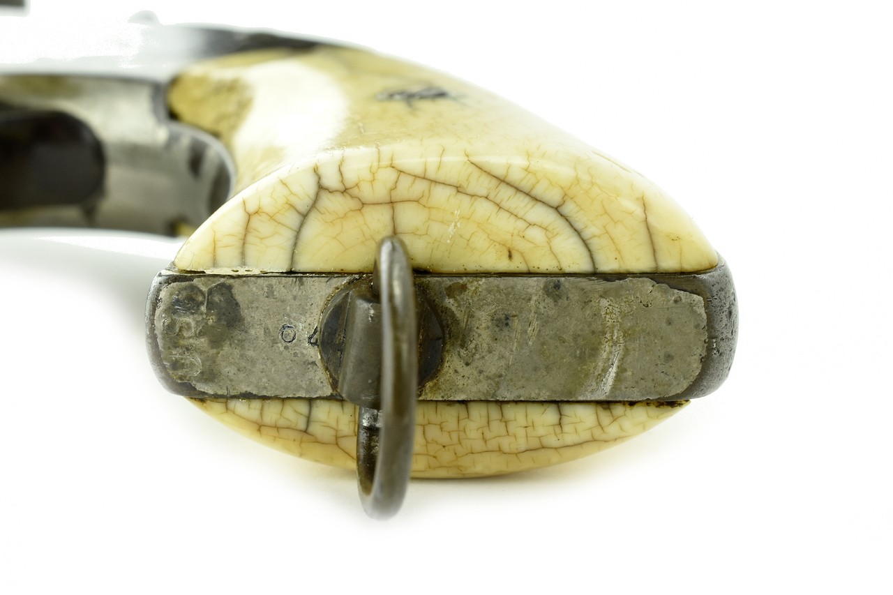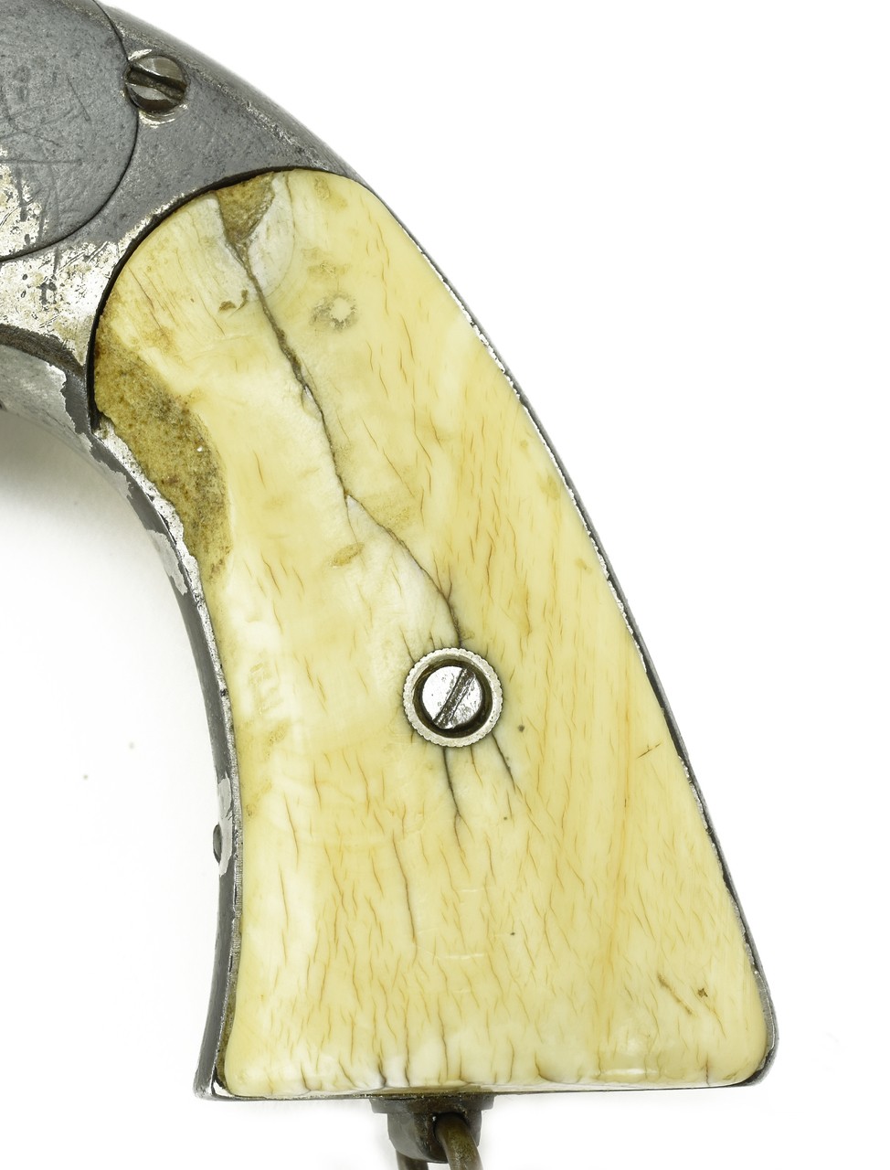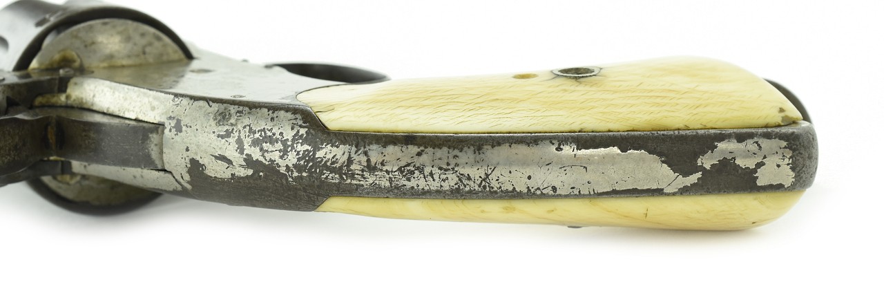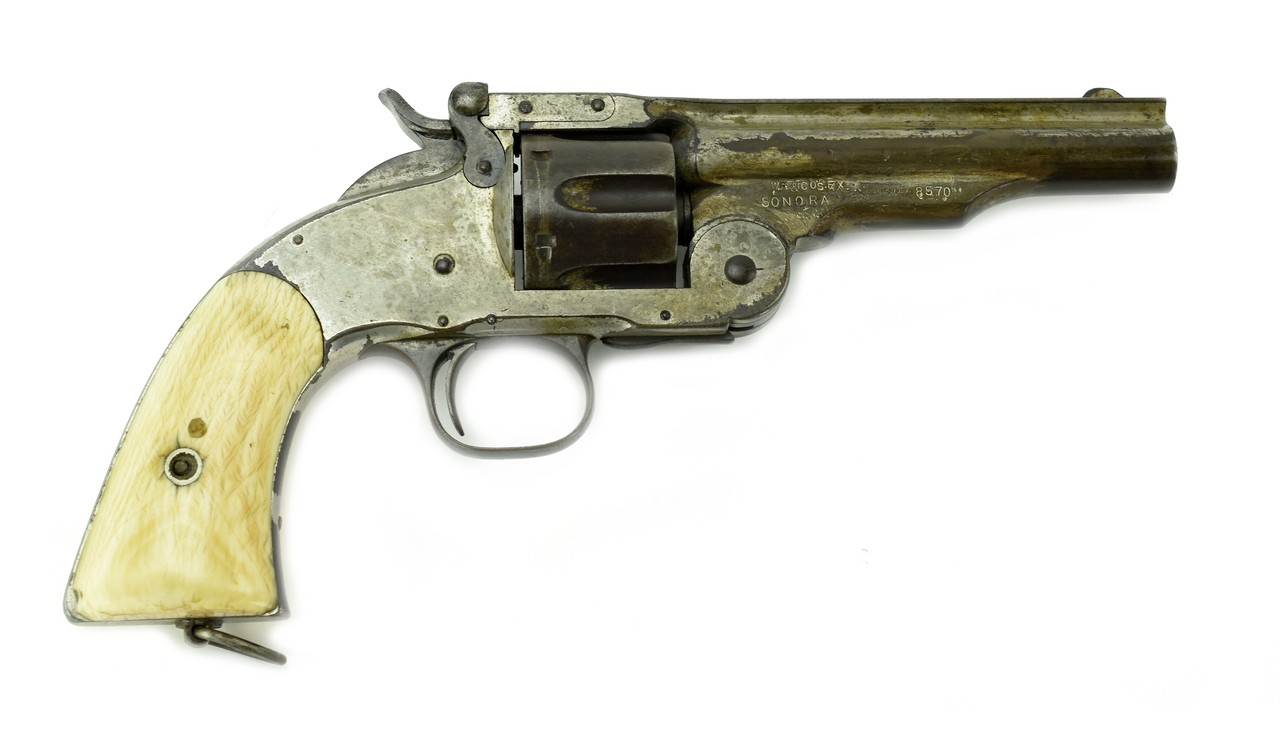 Rare Smith & Wesson Schofield Revolver marked “Wells Fargo & Co’s Ex”. This rare example is also marked “Sonora”. These Schofields were surplused after government use and sold to New York dealers such as Schuyler Hartley and Graham. They were shortened to 5” barrel length and sold to Wells Fargo with nickel plating for Wells Fargo messengers protection. The action works perfectly. The gun has a mellow pair of old ivory grips. The nickel on the cylinder and sides of the barrel is from holster wear and the metal shows a dark smooth patina. The cylinder likewise shows matching holster wear. We have owned many Wells Fargo Schofields but this one is certainly the most colorful and interesting of them all! This revolver has seen some real action. A lanyard ring has been added, most certainly by the owner. This is a very Old West Wells Fargo revolver, with western use with the “Sonora” mark and WF & Co. property mark 8570. Untouched original condition and should remain that way.