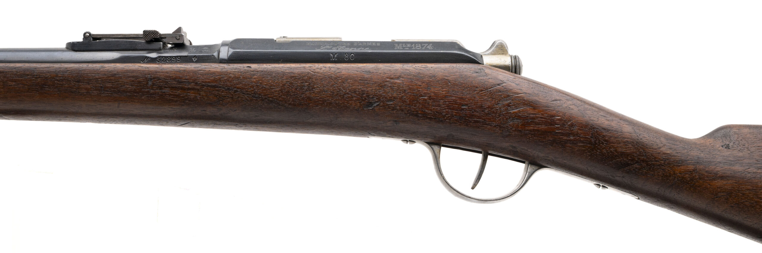 Serial number n52899, originally manufactured in 1878. This rifle was later arsenal-converted to .22 caliber and fitted with a 28” round barrel. The bore is bright and shiny with strong, well-defined rifling, making it an excellent example of a military trainer conversion. The rifle remains in very good overall condition and was arsenal re-blued at the time of conversion, with the finish presenting evenly throughout. The stock shows only light handling impressions and retains a handsome cartouche, adding to its visual appeal and historical character. The action is smooth and functions correctly, making this a desirable and uncommon training variant of the classic French Gras system.