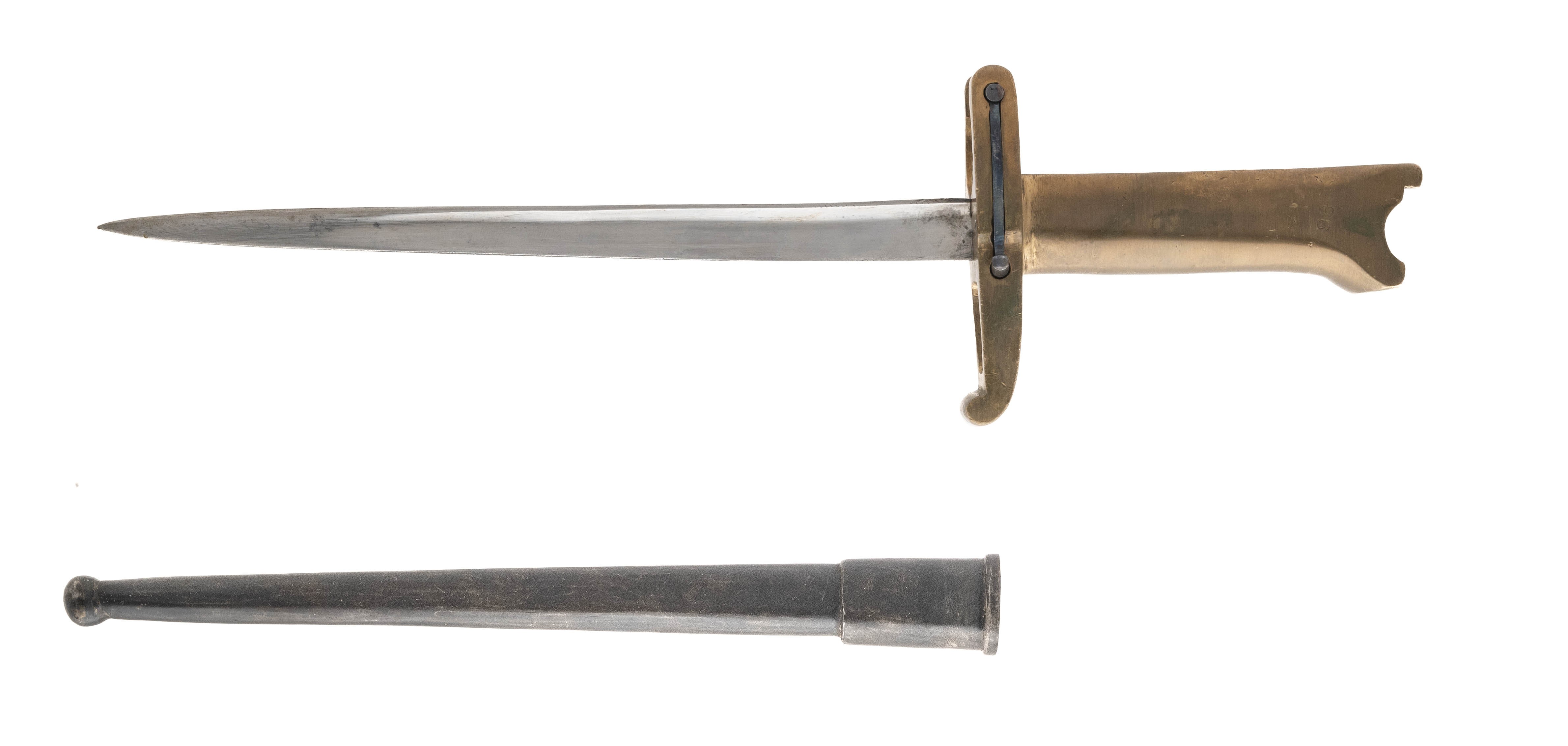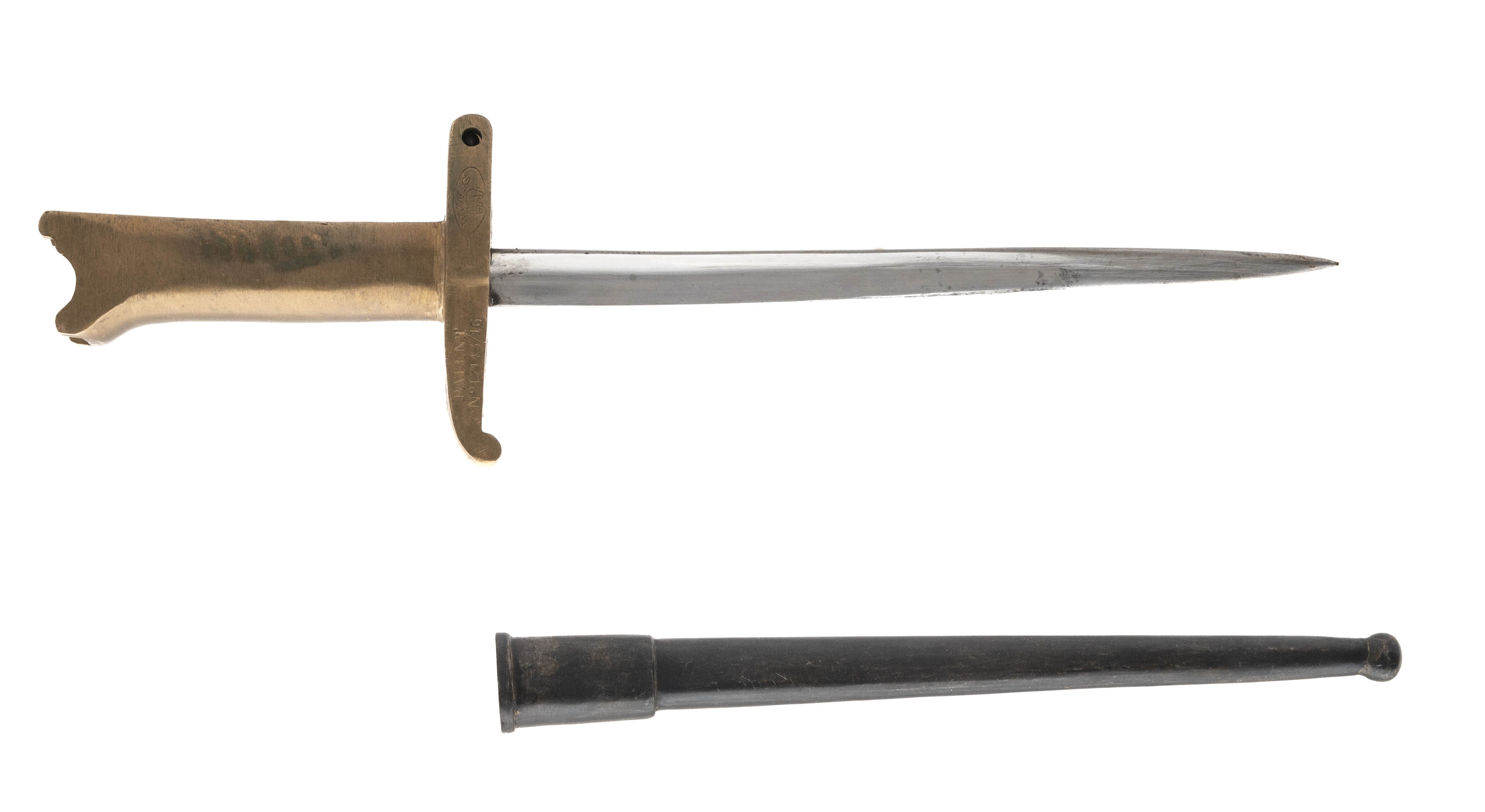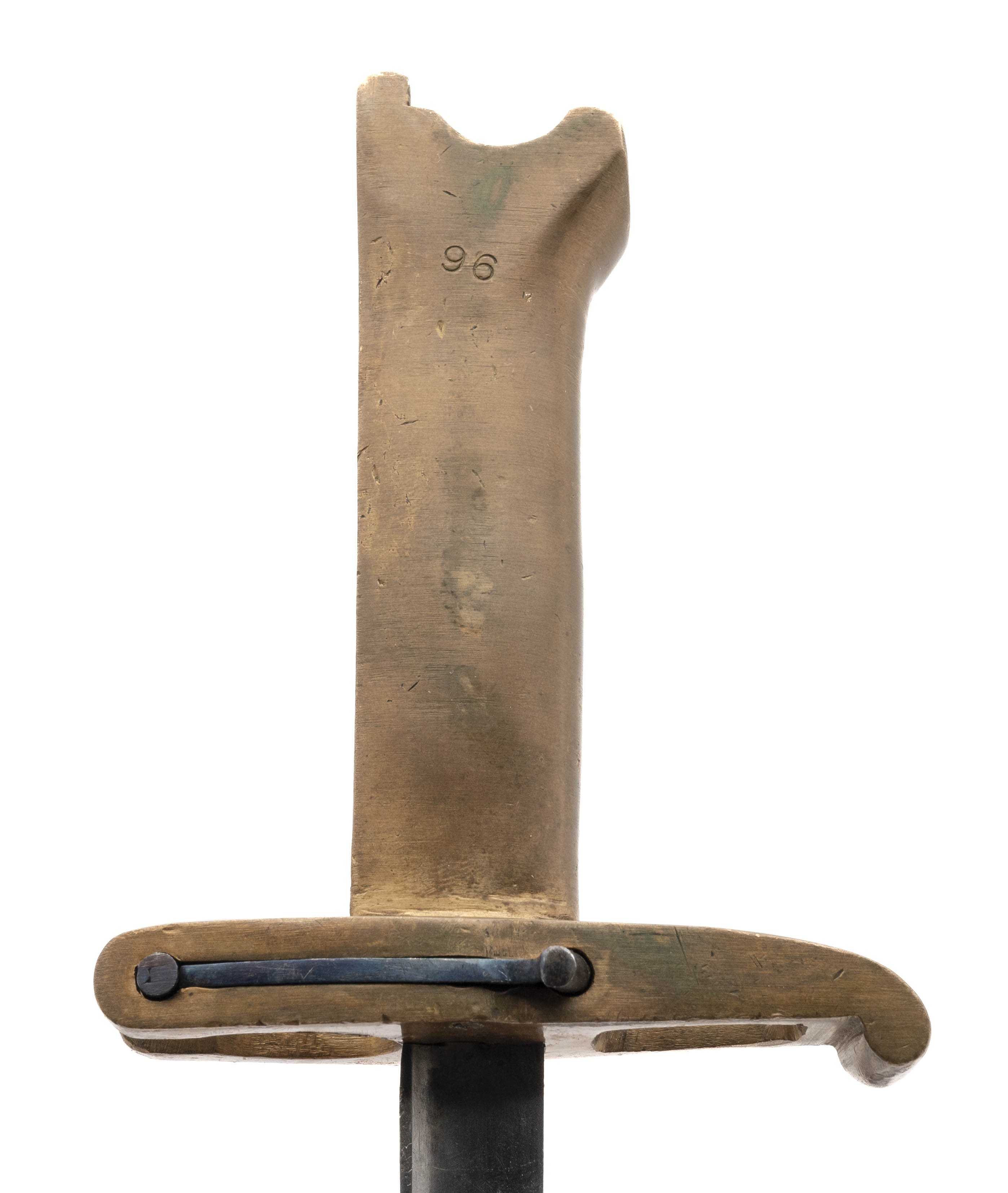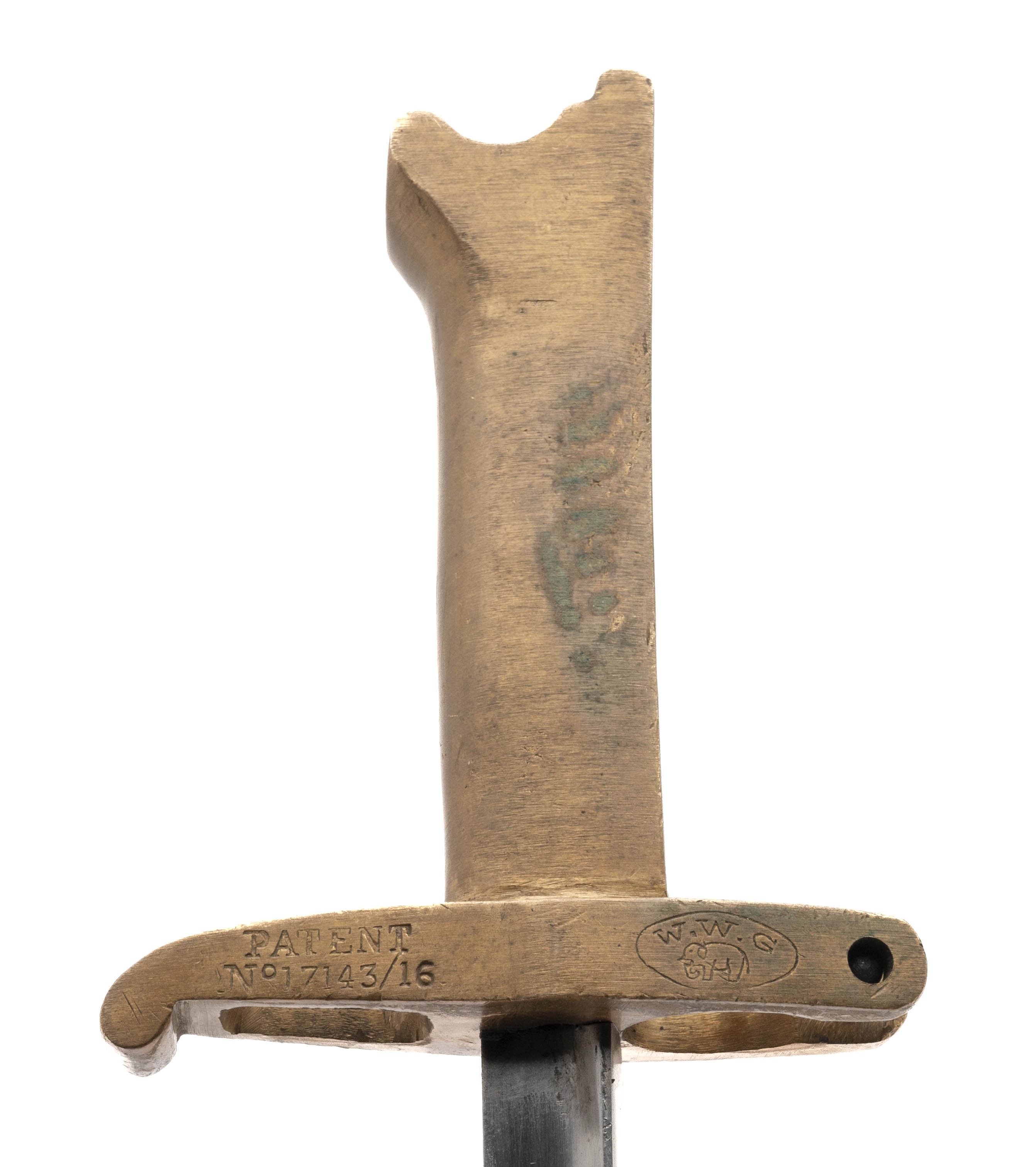 One of the Rarest pieces for any Webley Collector is the Webley Mark VI bayonet. Brass Cross guard is marked with "Patent/No17143/16 next to "W.W.G./Elephant" inside an oval. Guard is also marked with the number "96". Blade measures 8.25" in length, scabbard retains traces of original blue. Only 200 of these bayonets were made.