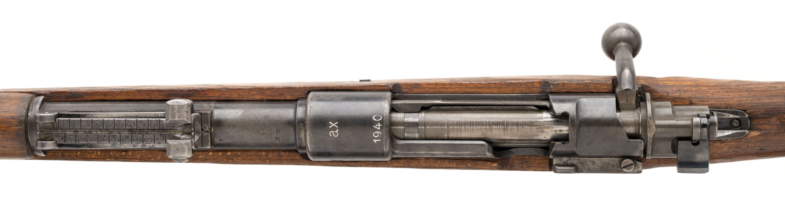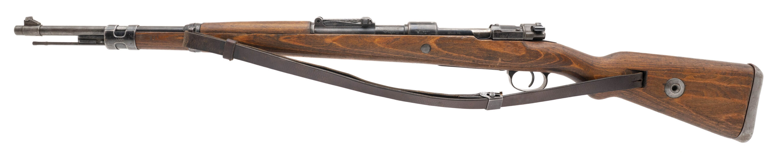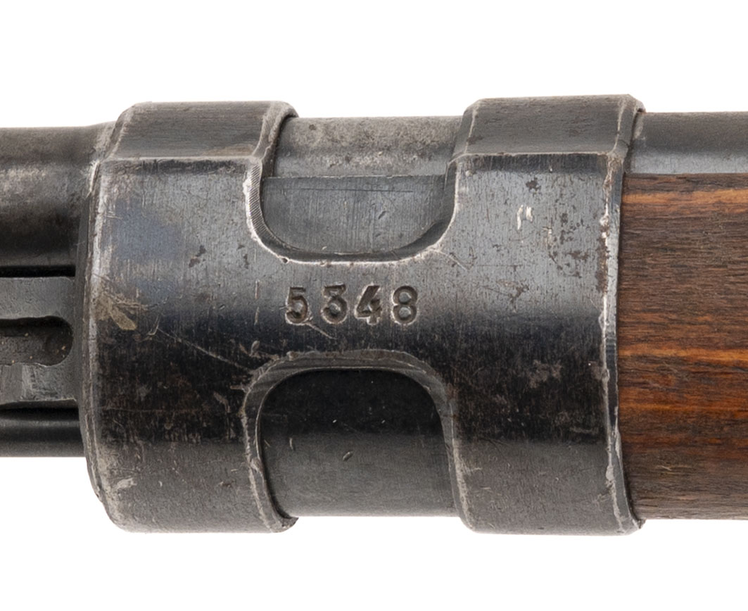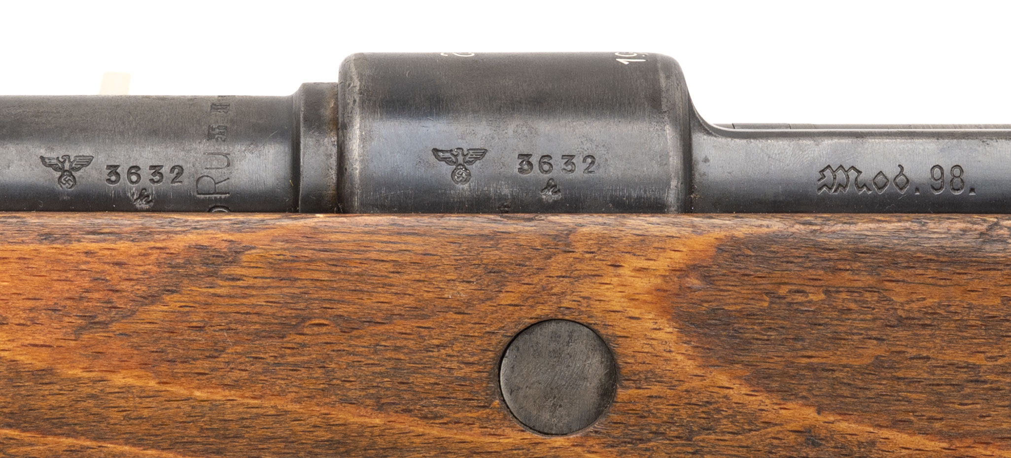 Serial No. 3632k, manufactured in 1940 by Erfurter Maschinenfabrik (ERMA) under the ordnance code “AX”, chambered in 8mm Mauser with a 24-inch round barrel. This rifle represents one of the rarest K98k production variants of the Second World War. The “AX” code was assigned to Erma for a brief production run in late 1940 through 1941, during which only an estimated 0.03% of all K98k rifles were produced at this facility. Production was soon discontinued as Erma shifted its full capacity toward the manufacture of the MP38 and MP40 submachine guns, leaving “AX”-coded rifles exceptionally scarce. All serial numbers are matching throughout. Metal surfaces have thinned to a smooth light grey patina, with factory markings and Waffenamt acceptance stamps remaining sharp and legible. The stock is very good, showing only light handling impressions consistent with limited-service use. Action is smooth and functions correctly. The rifle is accompanied by its original wartime sling.
