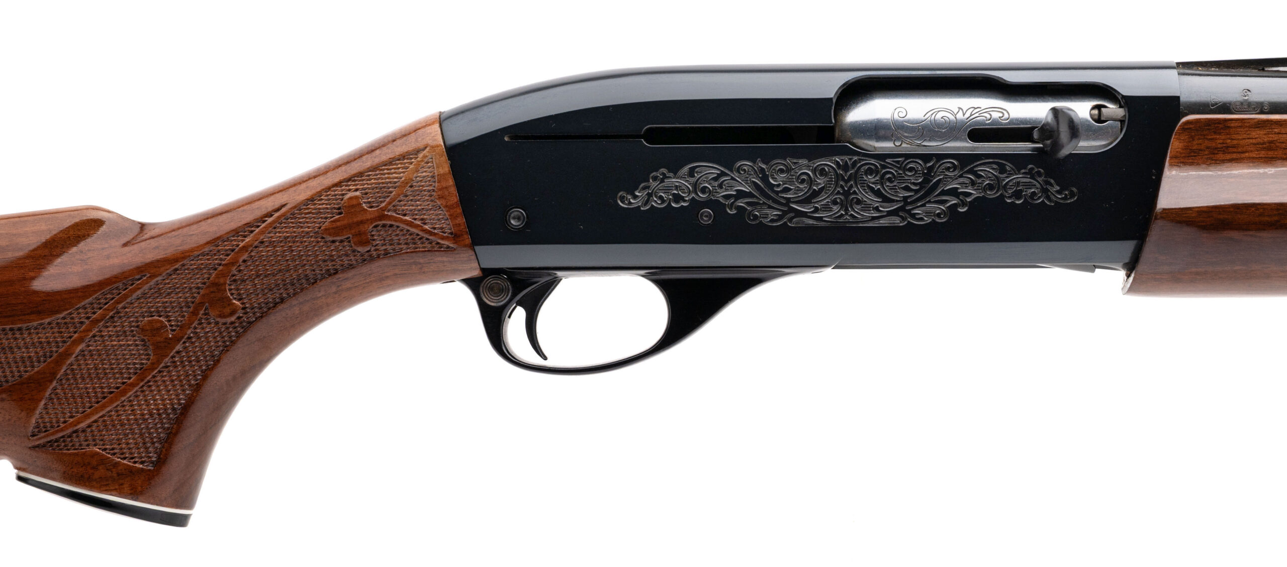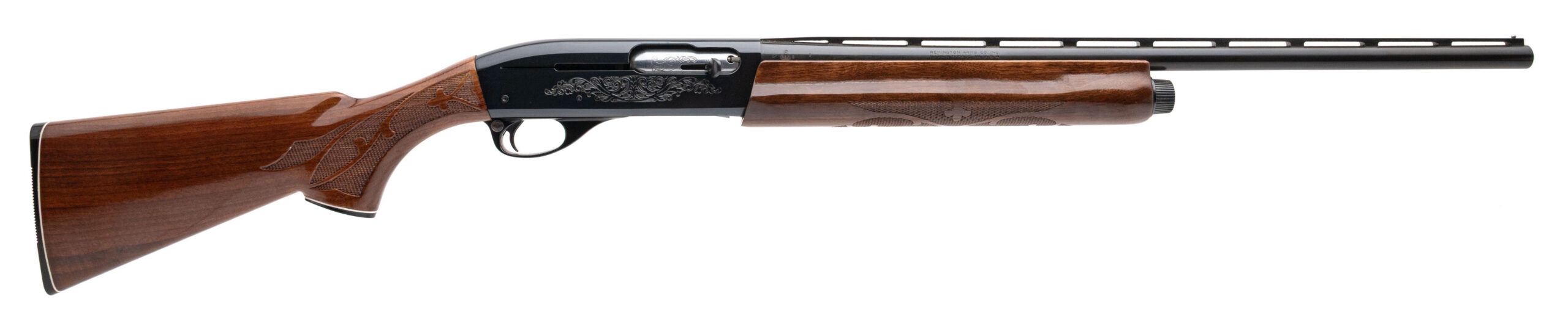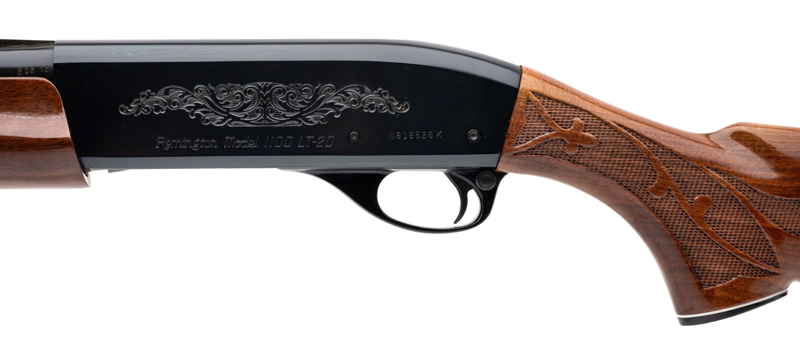 SN: N619526K, modern production 20 gauge semi-auto youth shotgun with a 23" vent rib barrel, 2 3/4" chamber and fixed IC choke. Blued metal finish, engraved receiver and high gloss checkered walnut furniture with fleur de lis checkering and a 12.5" LOP to the original butt plate. Overall in near excellent condition with very little wear.