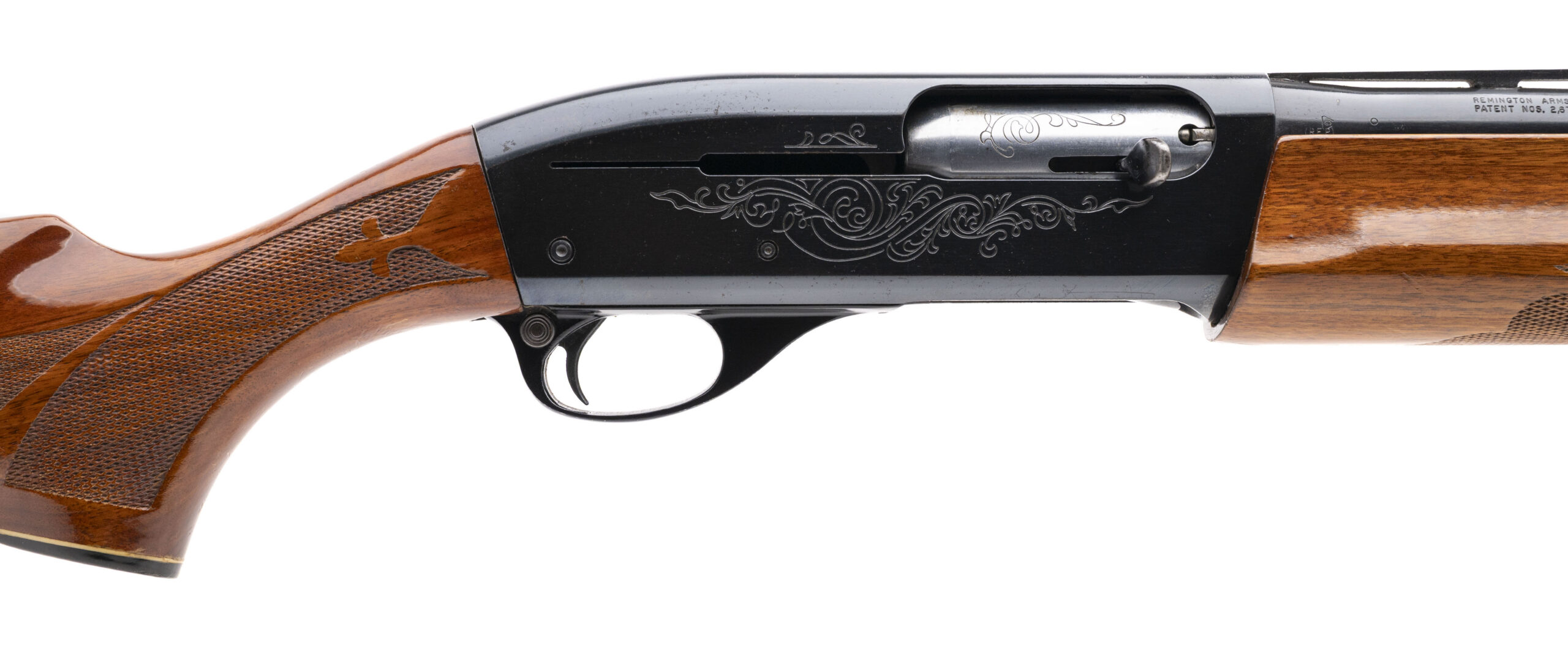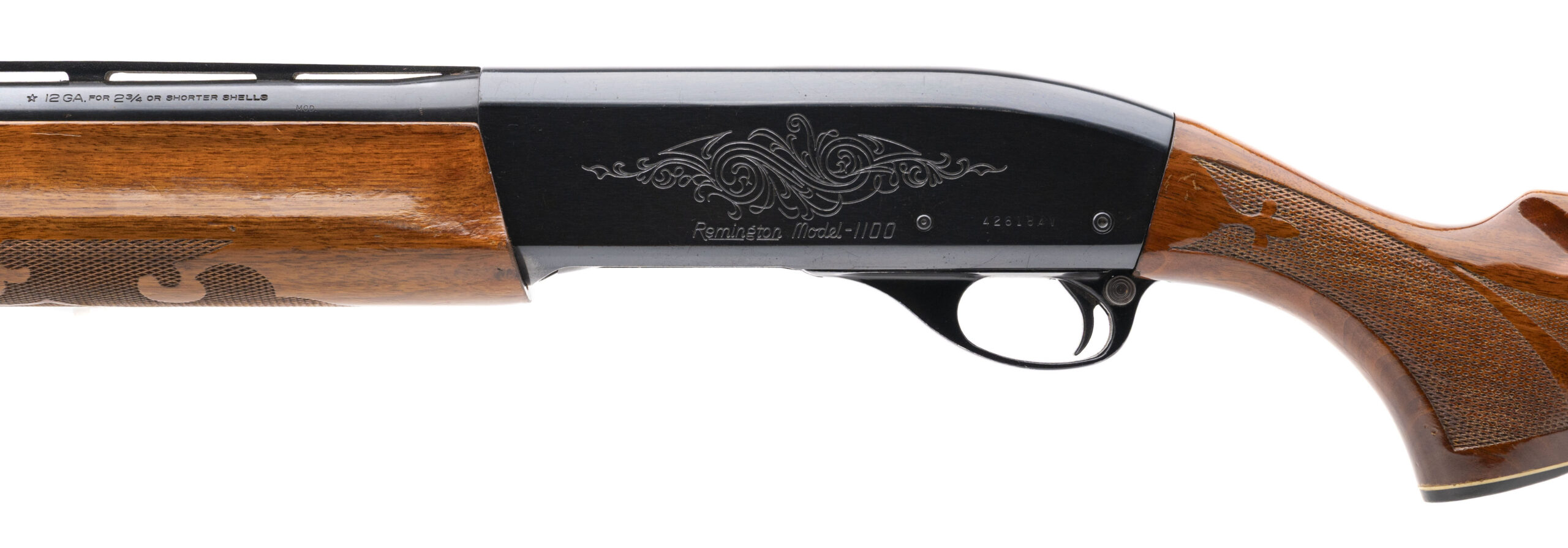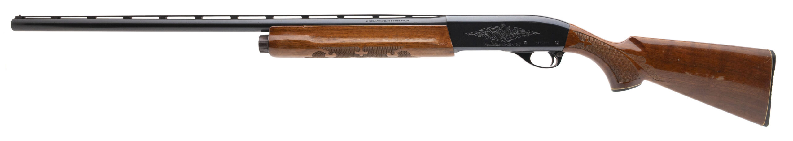 SN: 426184V, 12 gauge semi-auto field shotgun with a 28" vent rib barrel, 2 3/4" chamber and fixed MOD choke. Blued metal with engraved receiver and checkered walnut furniture with a 14" LOP to the original butt plate. Moderate handling marks on the furniture and speckled patina throughout the metal finish with an excellent bore. Overall a good solid shooter.