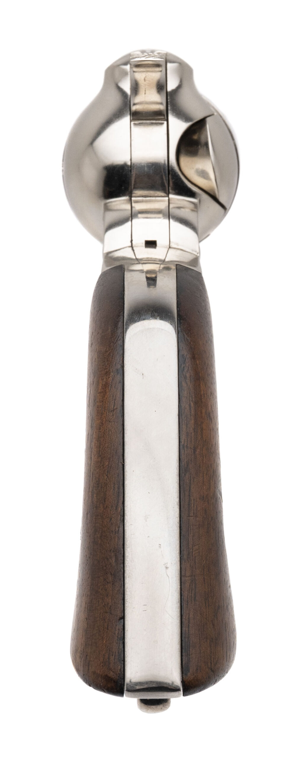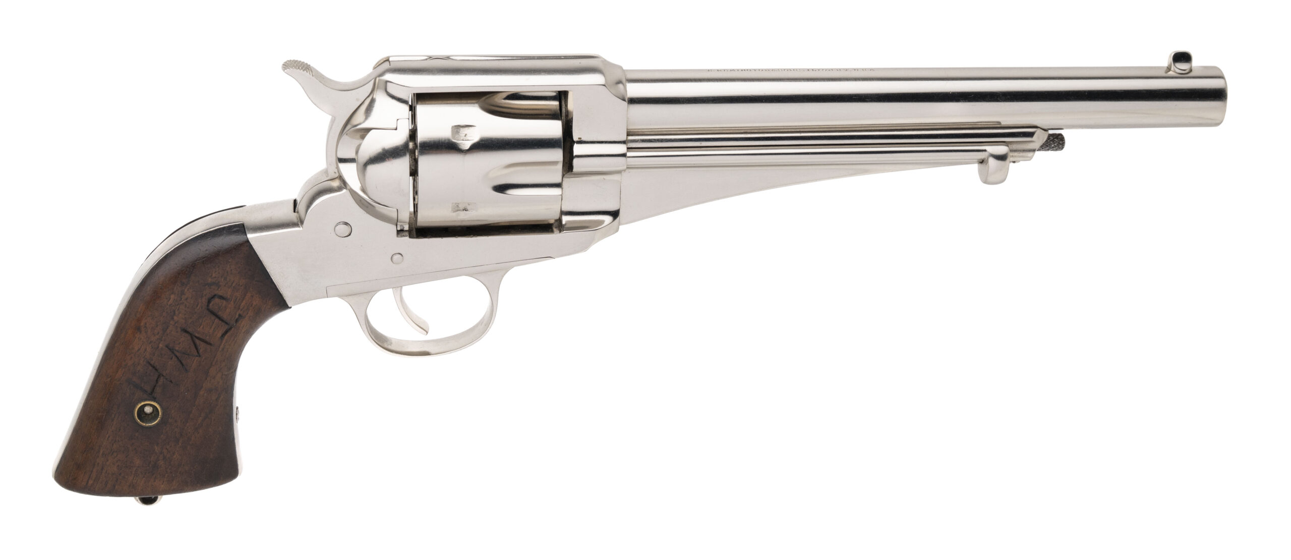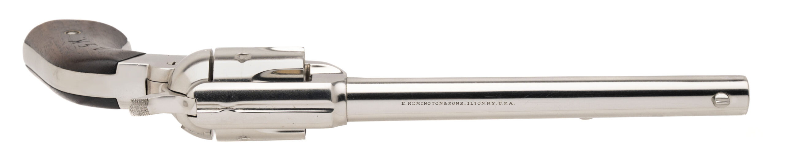 Serial number 226. 44 Remington caliber with a 7.5” barrel. This gun is in excellent condition as refinished. The grips are very good. Initials are carved in both sides of the grips. The action works properly. Very attractive example of a Remington 1875.