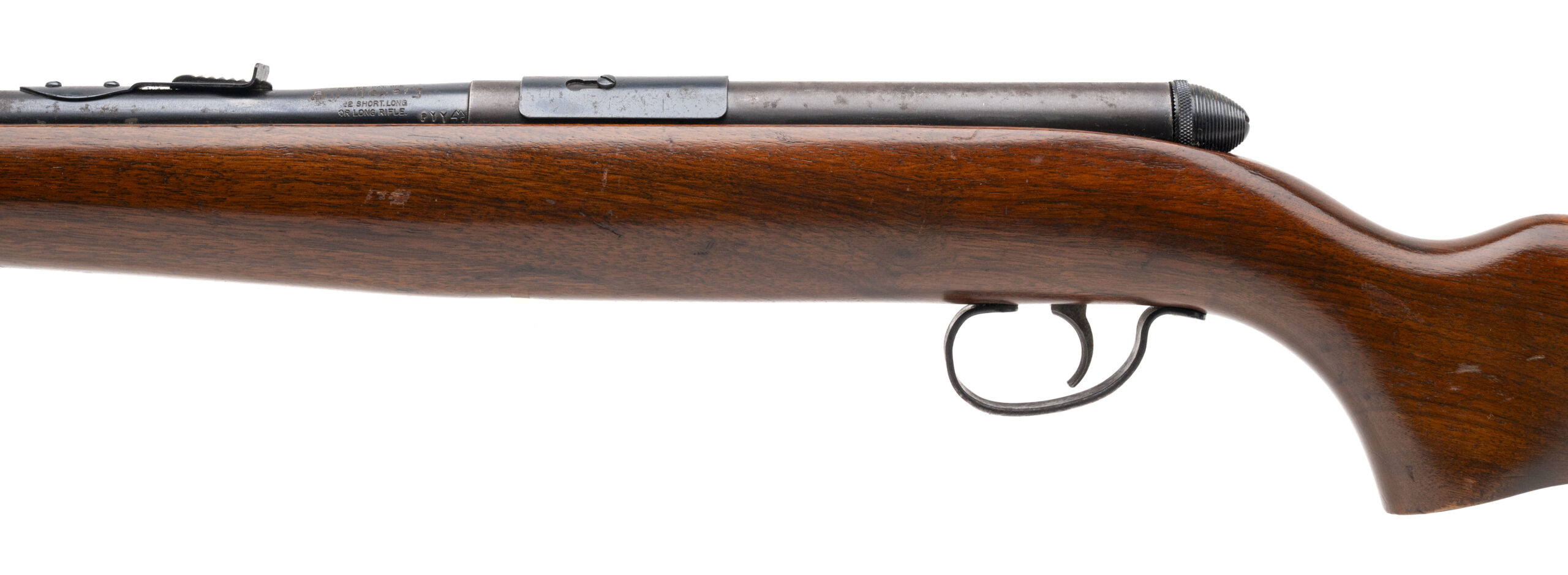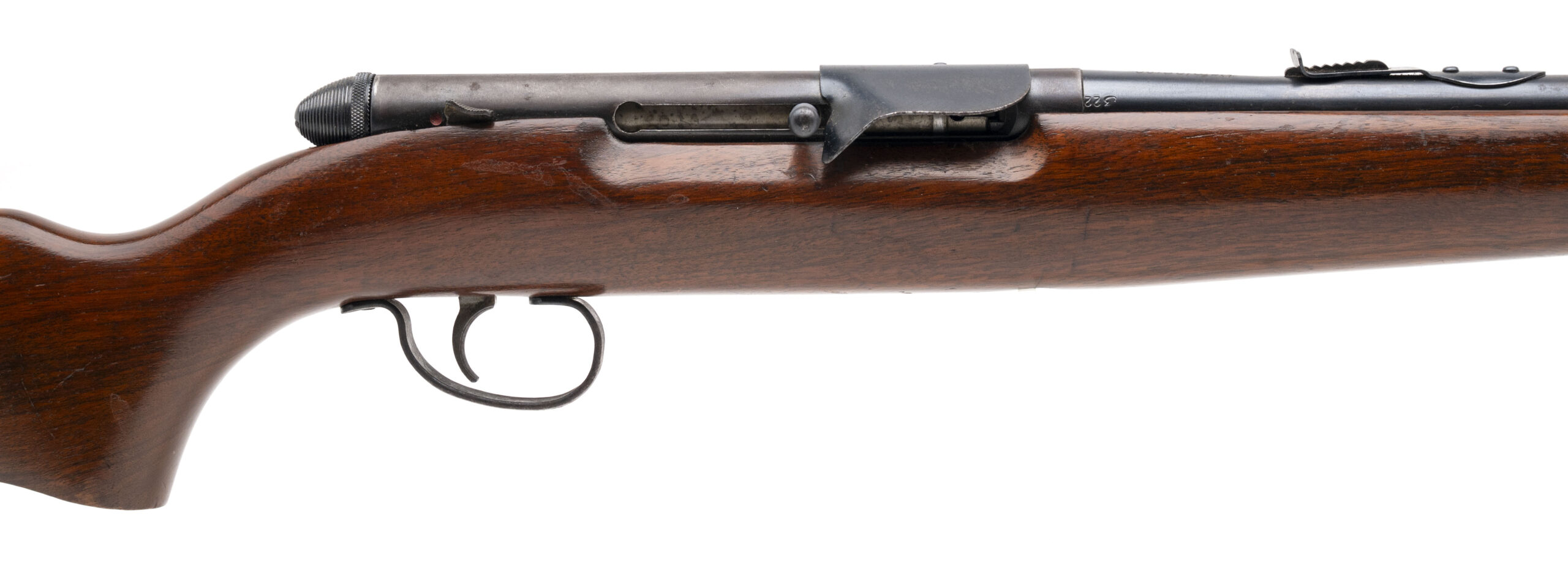 NSN made in 1952, semi auto tube fed 22 caliber rifle with a 24” barrel, iron sights, shell deflector and side safety in a walnut stock with the original butt plate. Original owners name is etched into the trigger guard and barrel. Metal finish is in fair condition with moderate to heavy wear. Furniture is in very good condition with light handling marks and bore is excellent.