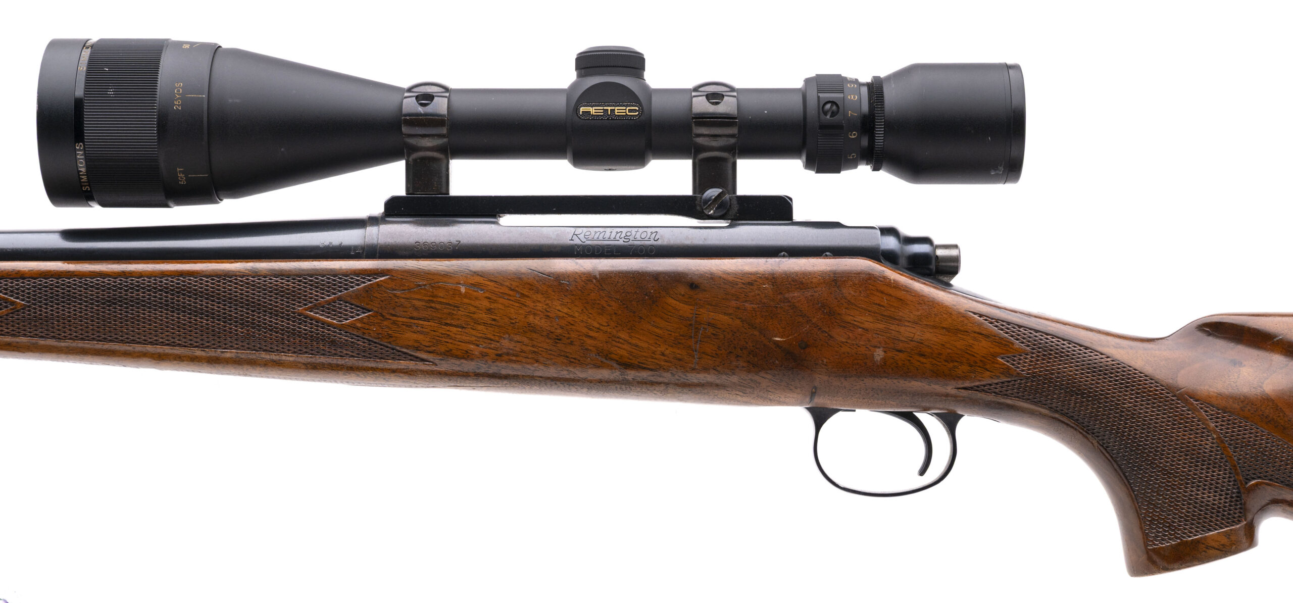 sn: 369037 made in 1968. Bolt action hunting rifle chambered in 7mm Rem Mag with a 24" round barrel in a checkered walnut stock with a White Line recoil pad and Simmons Aetec 3.8-12x44 scope. Moderate wear and handling marks, good bore with strong rifling. Overall a good solid shooter. Comes with sling.