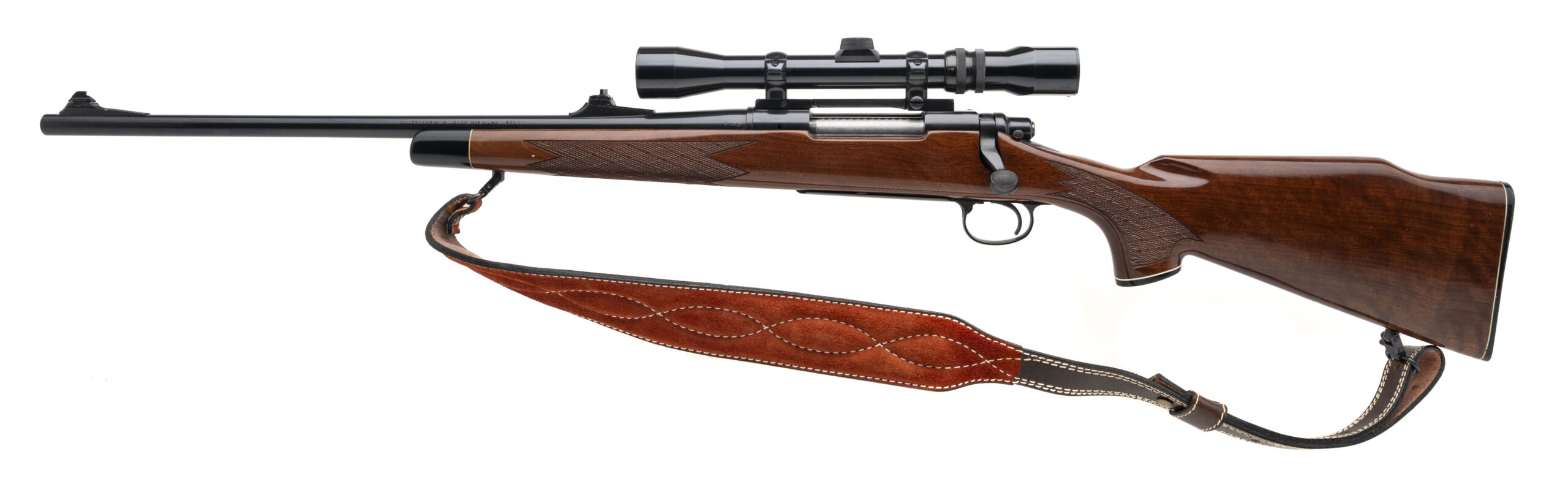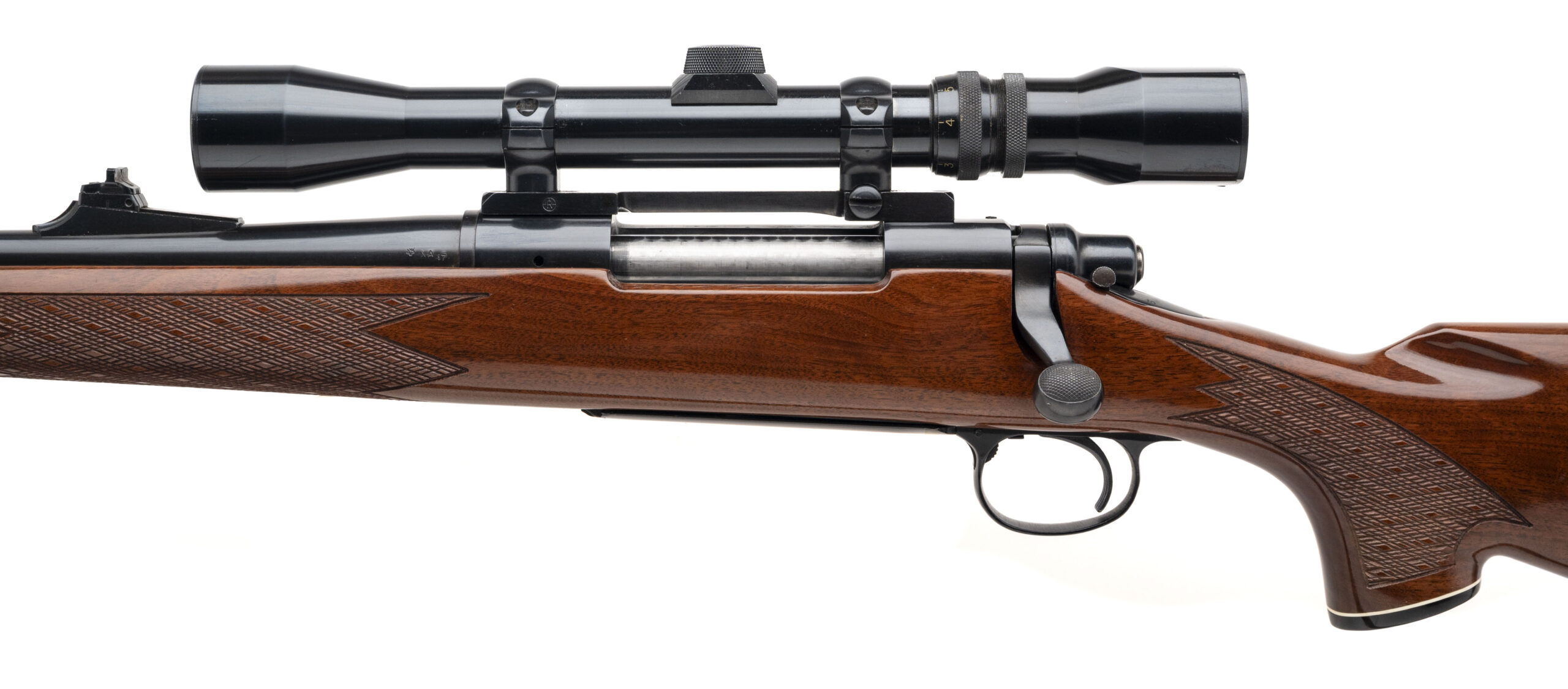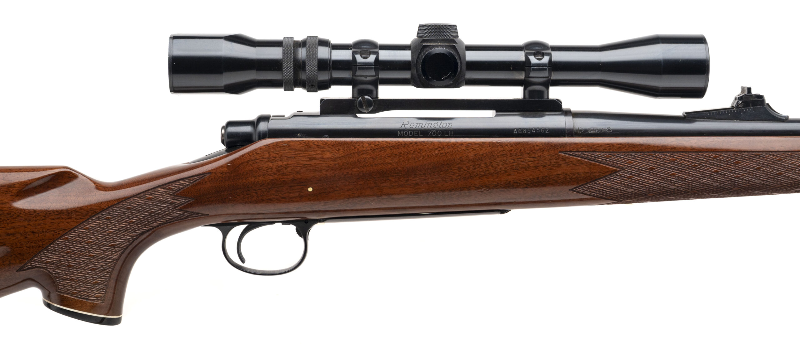 SN: A6854562 made in 1980. Left hand 270 Win bolt action hunting rifle with a 22" round barrel, ramped front sight, adjustable rear sight and Weaver V7-II scope. Blued metal finish and a high gloss checkered walnut stock with skip line checkering, grip cap and original butt plate. Overall in very good condition with an excellent bore.