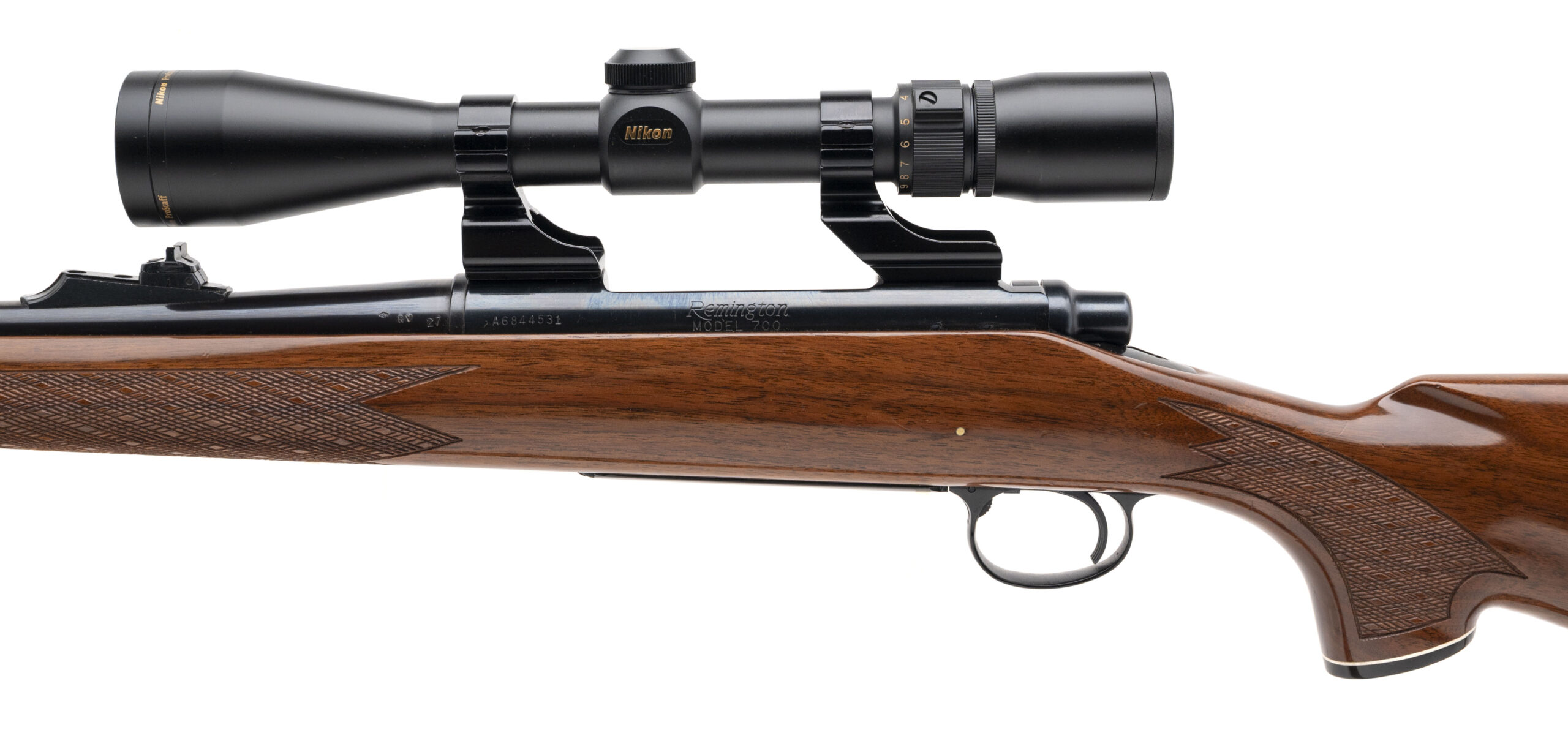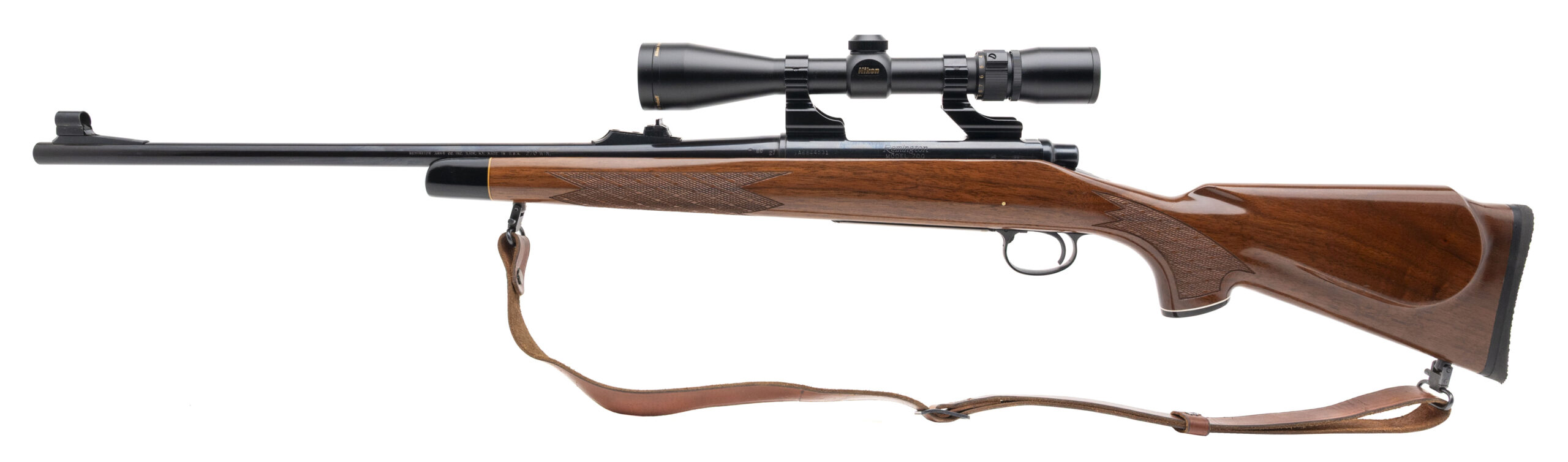 SN: A6844531. Made in 1979. Bolt action hunting rifle in 270 Win. with a 22” round barrel with iron sights and a Nikon Prostaff 3-9 scope with see-through rings in a Classic Deluxe checkered walnut stock with forend tip and grip cap, high gloss finish and a thin recoil pad. Comes with leather sling.