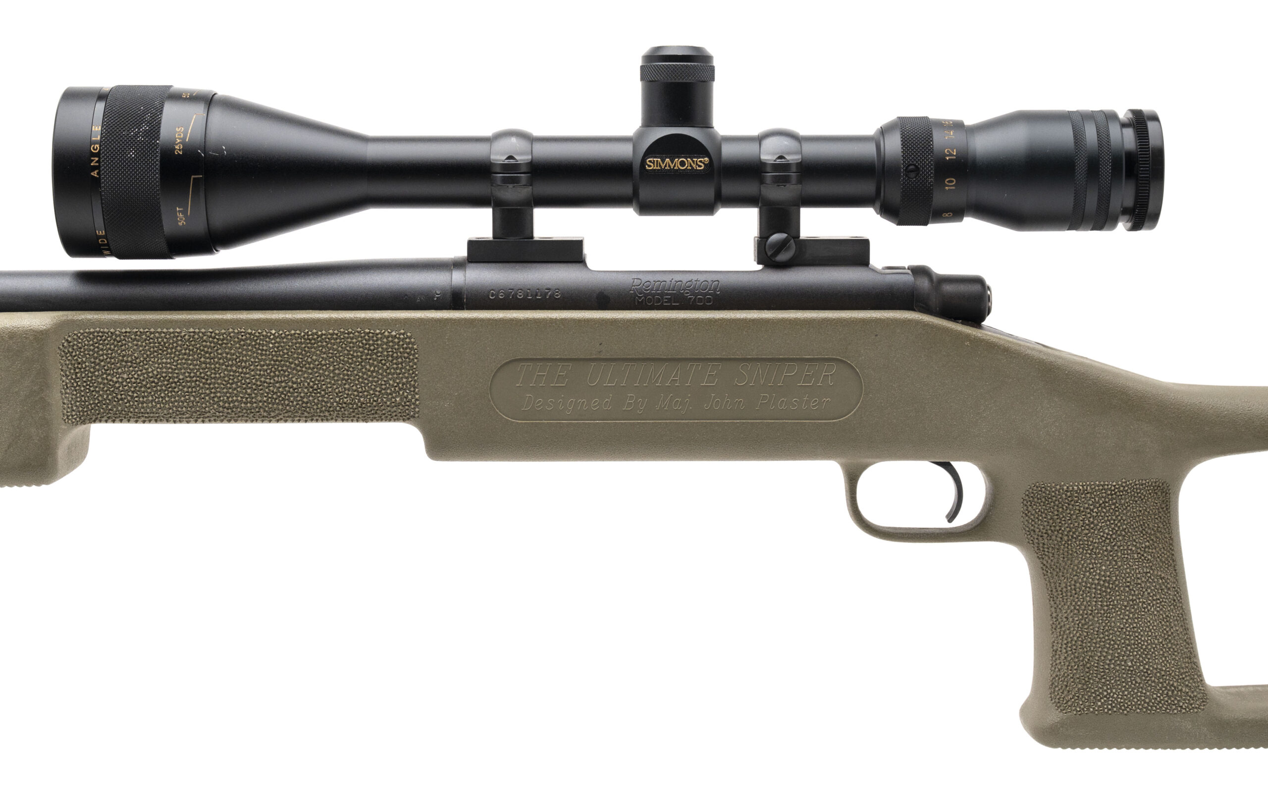 SN: C6781178. Made in 1993, .308 WIN with a 24" barrel. Bore is excellent. Bolt-action rifle with Choate Ultimate Sniper Rifle OD green stock, Simmons Wide Angle 6.5-20X44 scope, and Gibbs collapsible bipod. Stock shows handling wear with a white spot on the right side of the stock near the muzzle. Overall condition is very good.