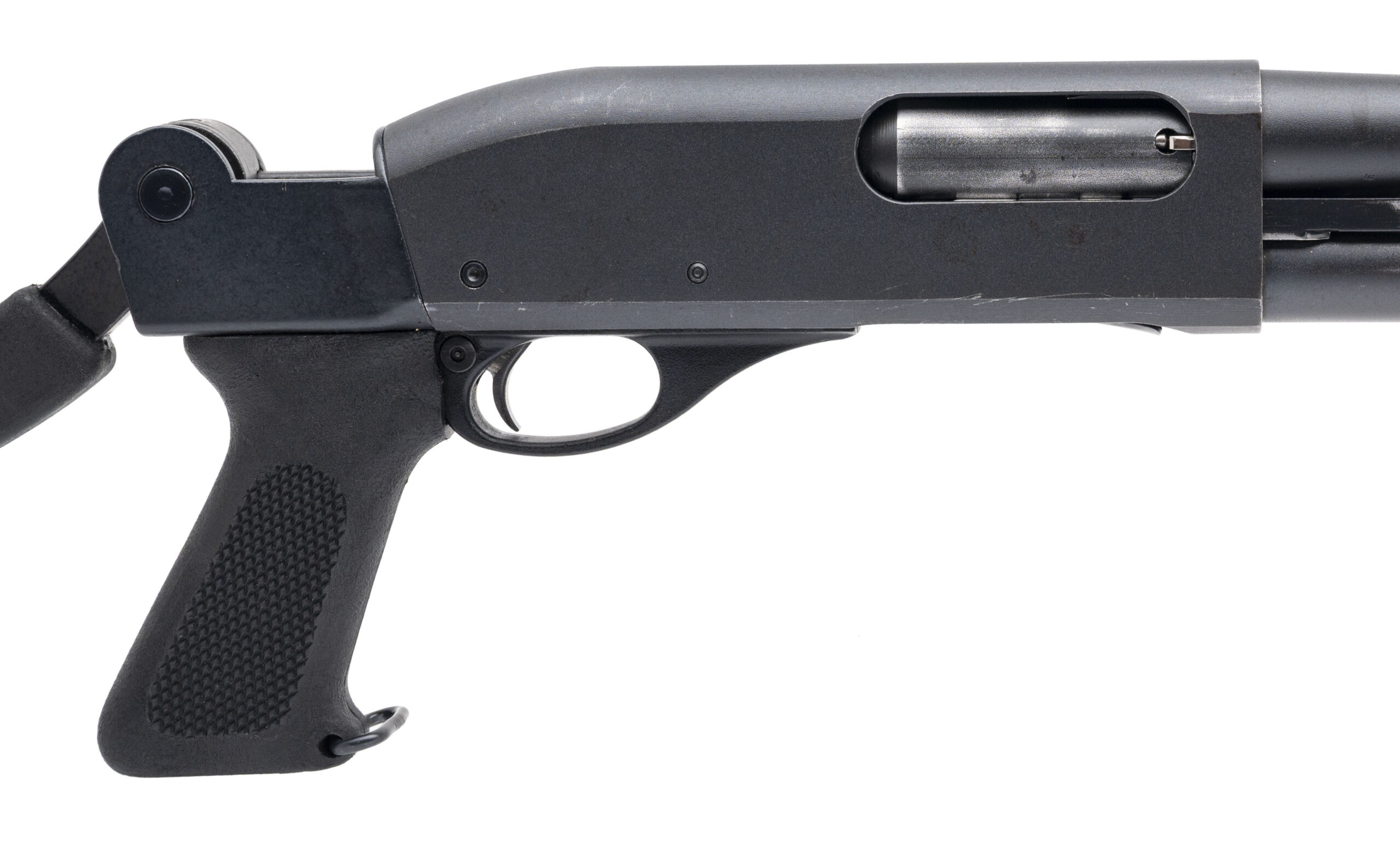 SN: D092211M. Made circa 2001, 12 Gauge with an 18.5" cylinder choke barrel. Bore is bright. Police Magnum inspired pump action shotgun with an upgraded folding stock & pistol grip. Has a 3" chamber and Magnum receiver. Metal shows handling wear and pitting in some areas on the barrel and receiver. Overall condition is good.