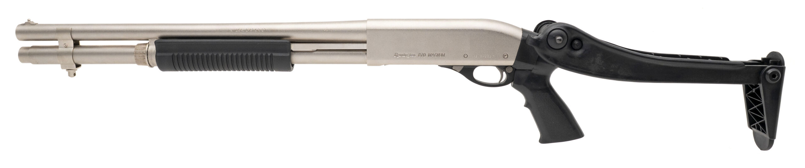 SN: AB034231M. Modern production 12ga with an 18" barrel. Marine grade pump shotgun with nickel finish and folding stock. Excellent condition.