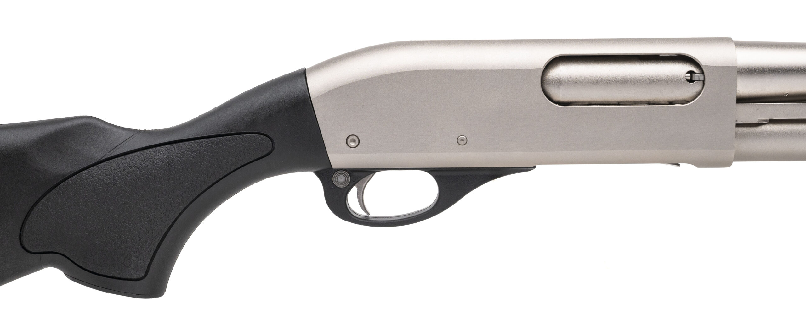 SN: RS14914R. Made circa 1999-2000, 12 gauge with an 18.5" cylinder bore barrel. Bore is bright. Pump action defense shotgun with a 3" magnum chamber, nickel finish, and a Game Winner sling. Very good condition overall.