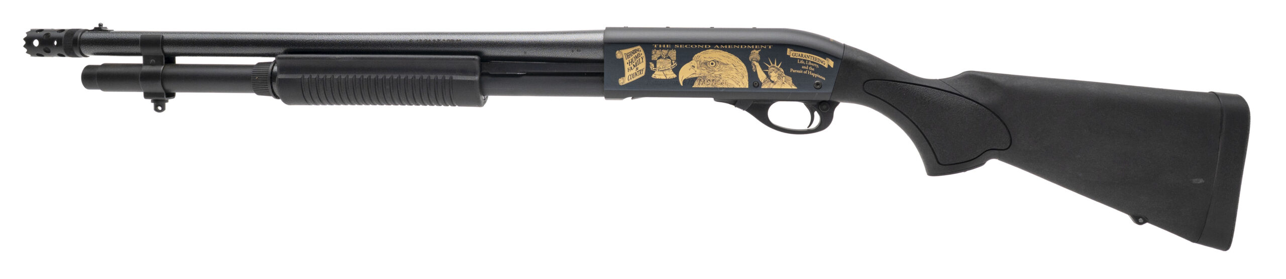 Sn: AB841309M modern production 12 gauge pump action tactical commemorative shotgun. 18.5” textured barrel with screw in breacher choke and 3” chamber. Black synthetic stock and forearm with a blued receiver with gold 2nd amendment themed scenes on both sides. Overall in excellent condition with an excellent bore.