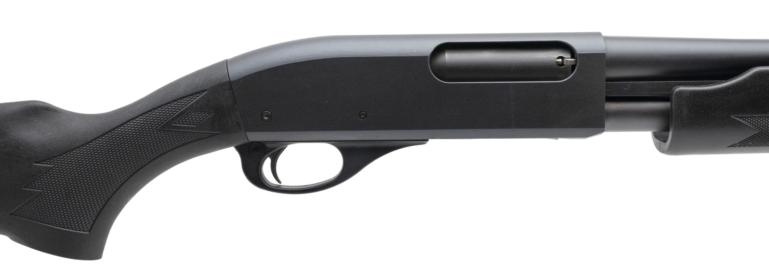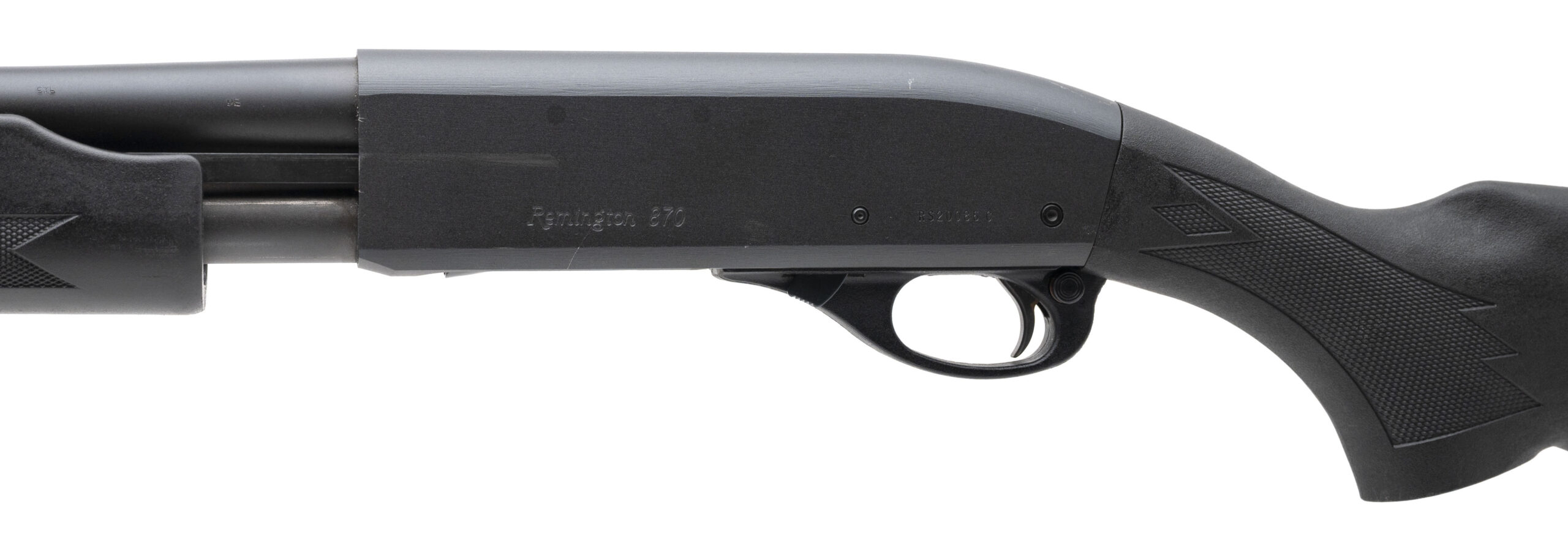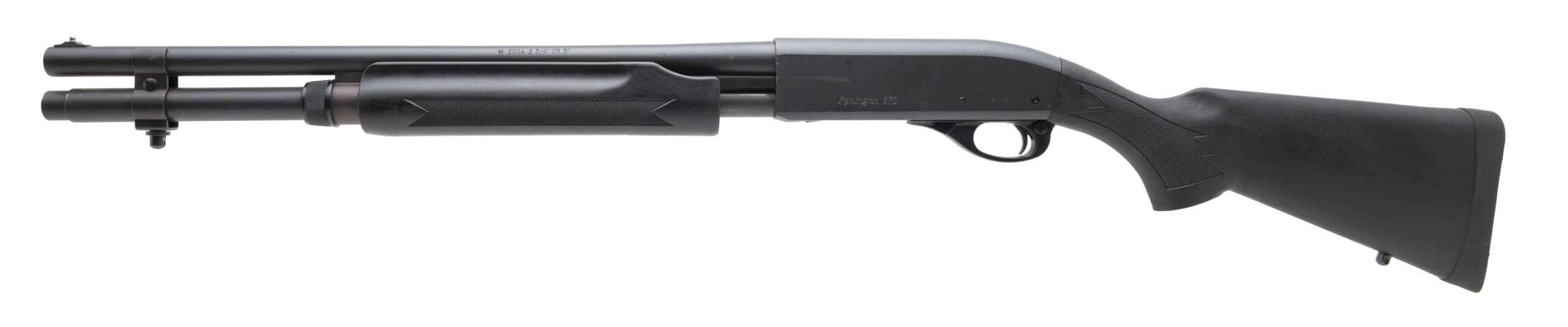 SN: RS20086C. Modern production, 20 gauge with an 18.5" barrel chambered for 2 3/4" & 3" shells. Bore is excellent. Pump-action defense shotgun with an extended magazine tube, parkerized finish, and checkered black synthetic forend & stock with a 13.75" LOP. Finish shows moderate handling marks throughout. Overall condition is very good.