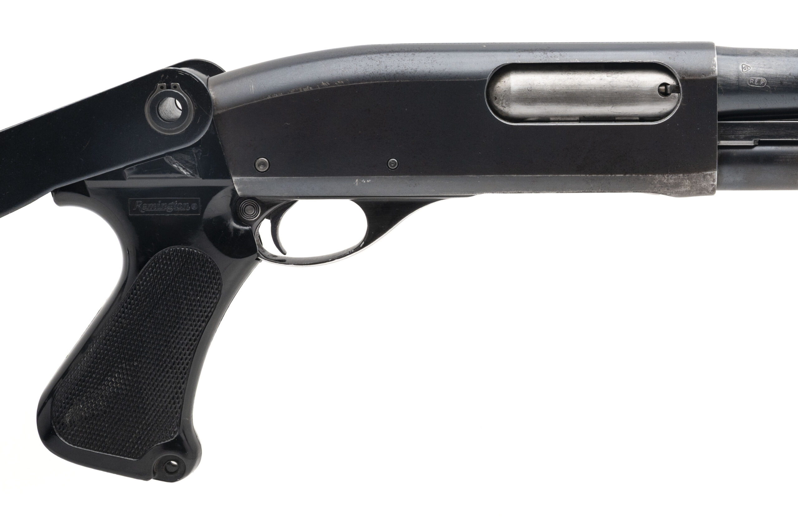 SN:163892V. Pump-action shotgun chambered for 12 Ga. 2.75" shells with a 20" barrel. Overall condition is very good with wear throughout in the form of bluing wear on the receiver, barrel and magazine tube. Handling wear is present on the folding stock which is mark For Law Enforcement Only. Folding stock and action work properly.