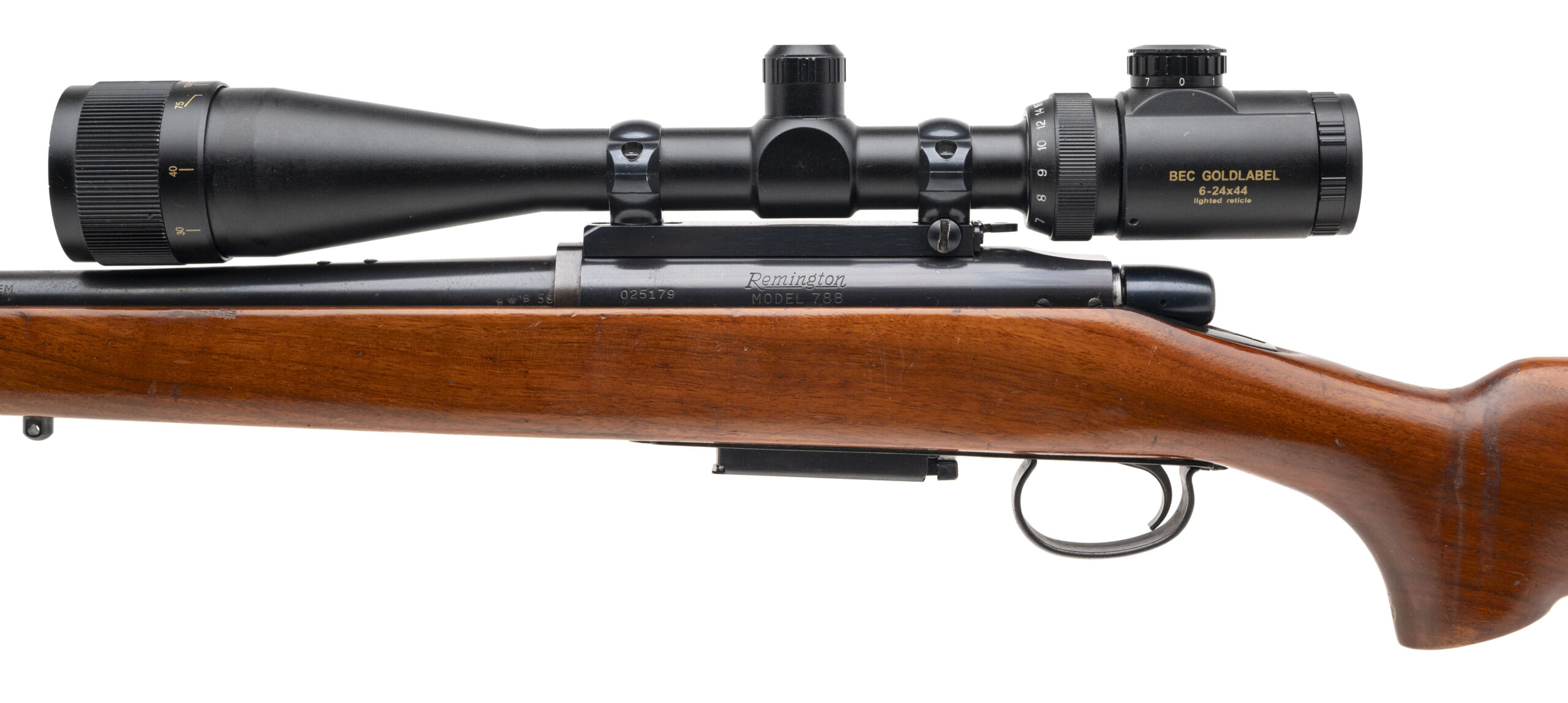 SN: 025179 made in 1967. Bolt action hunting rifle chambered in 22-250 with a 24" round medium contour barrel, detachable magazine and BEC GOLDLABEL 6-24X44 scope in a walnut stock with original butt plate. Moderate wear and handling marks on the stock, metal finish is in very good condition and bore is excellent.