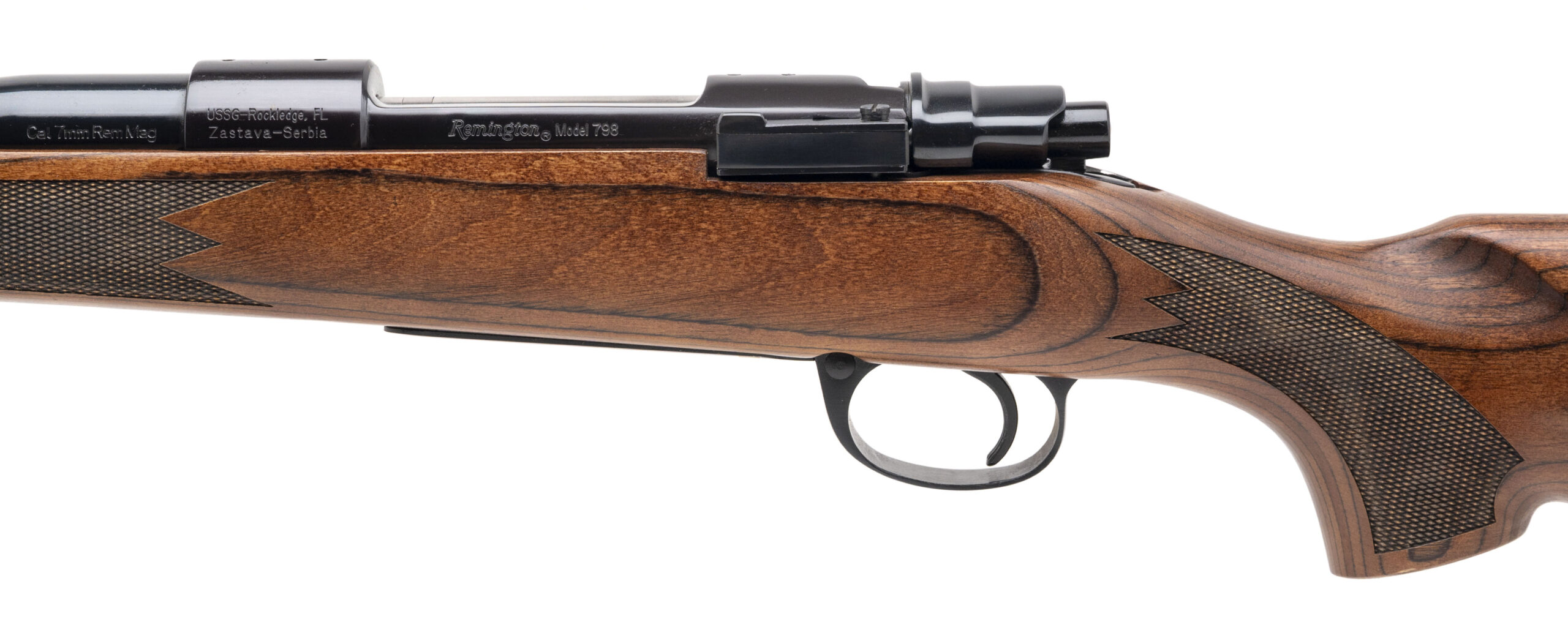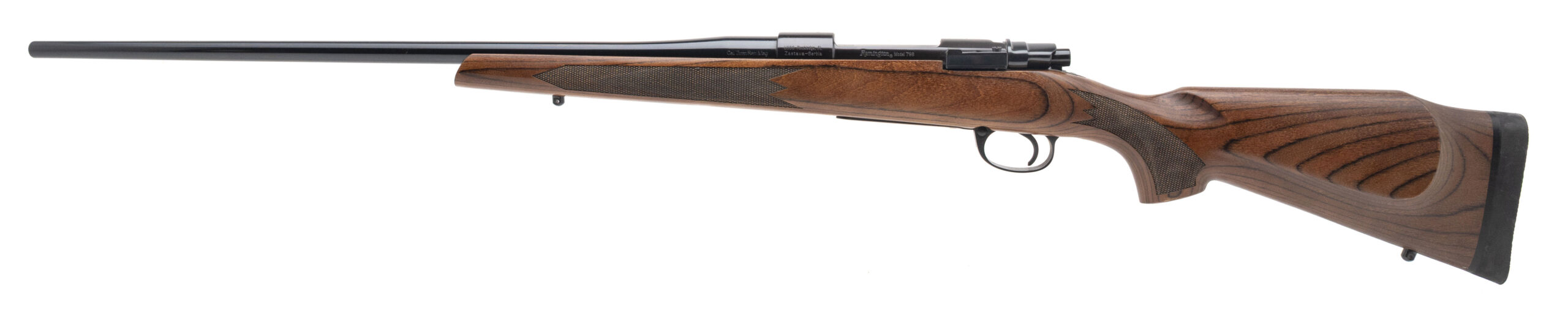 SN: ZA700601766 modern production made in Serbia. Bolt action hunting rifle with a 24” round barrel chambered in 7mm Rem Mag on a Mauser style action, control round feed with full length claw extractor, side safety, mauser style bolt release and bottom metal release located on the side of the trigger guard. High polish blued metal finish and a laminated checkered wood stock with the original rubber recoil pad. Overall in excellent condition.