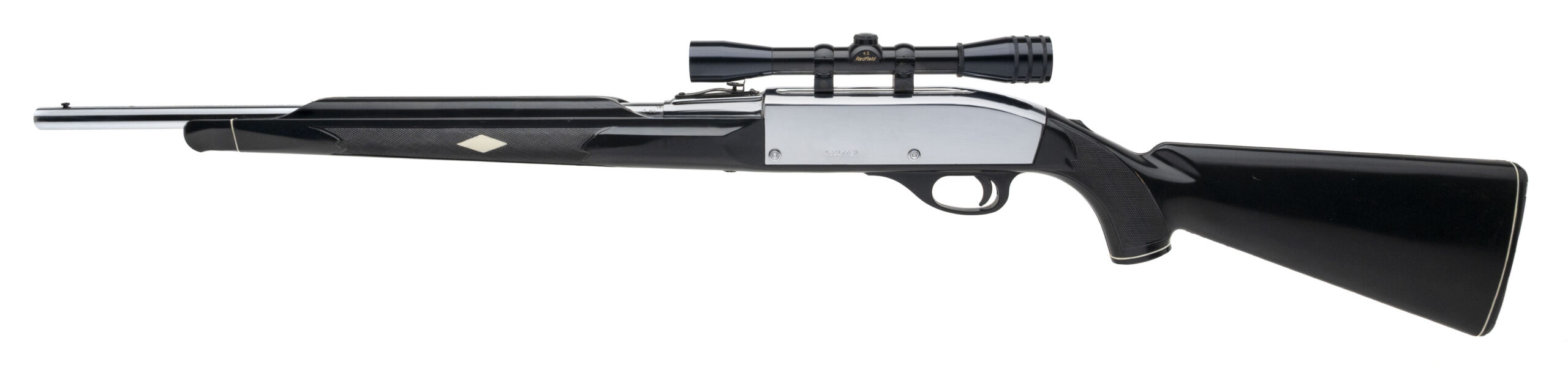 SN: A2217723. 1980 production, .22 LR with a 19.5" barrel. Bore is bright with good rifling. Scarce rimfire rifle with a 4X Redfield scope, black stock w/white inlays, and chrome polished barrel & receiver. Front sight was removed and the stock shows handling wear. Metal shows light marks but the overall condition is very good.