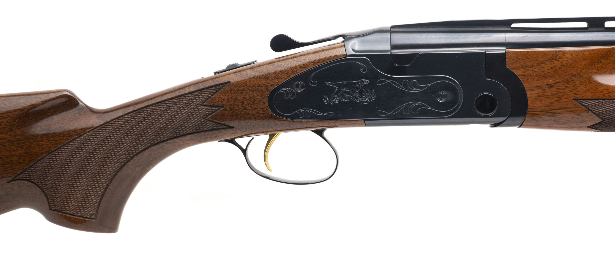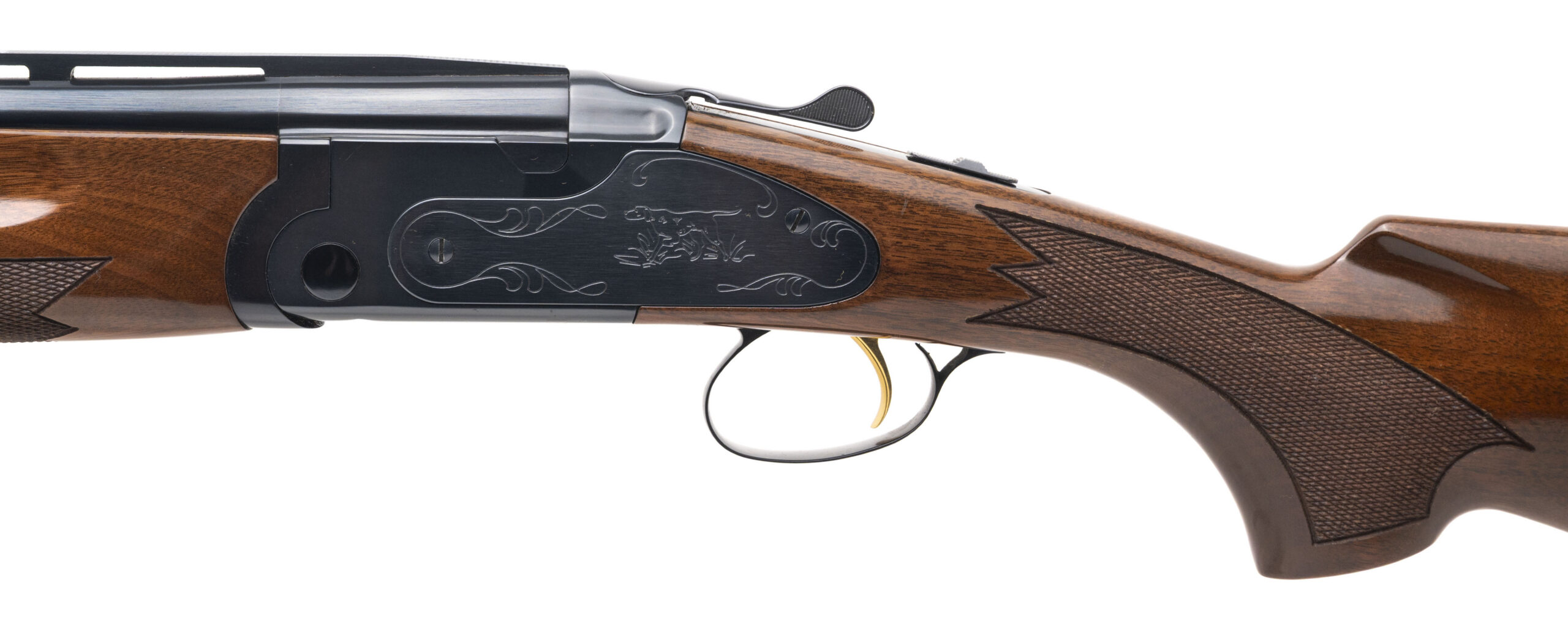 SN: RP005438, 12 Gauge over under field shotgun with 25.5" vent rib barrels, 3" chambers and screw in chokes. Engraved receiver with side plates, blued metal finish, ejectors, gold plated selective single trigger, auto safety and deluxe high gloss checkered walnut furniture with a 14.25" LOP to the original recoil pad. Overall in near excellent condition with only some very minor handling marks and excellent bores.