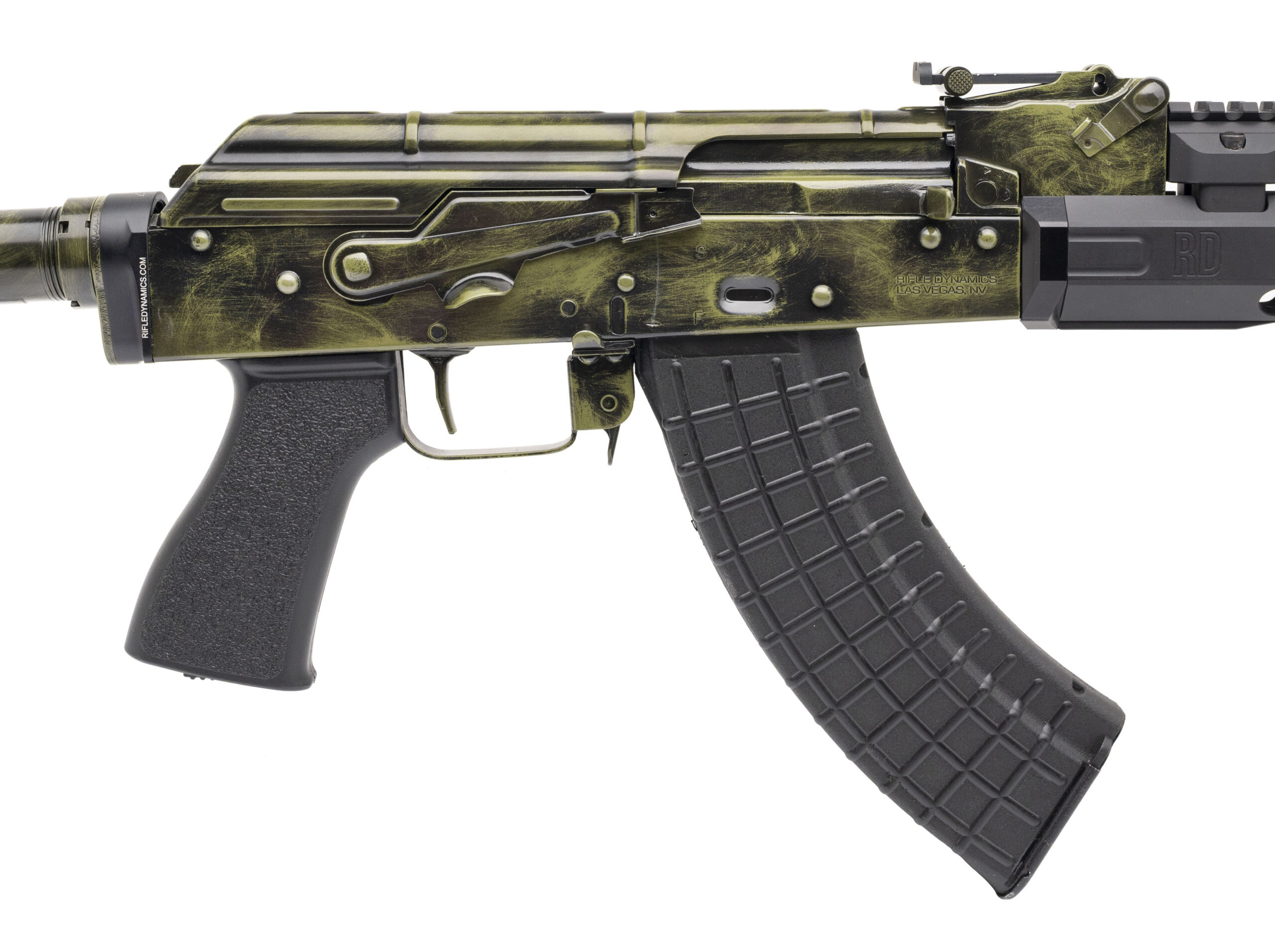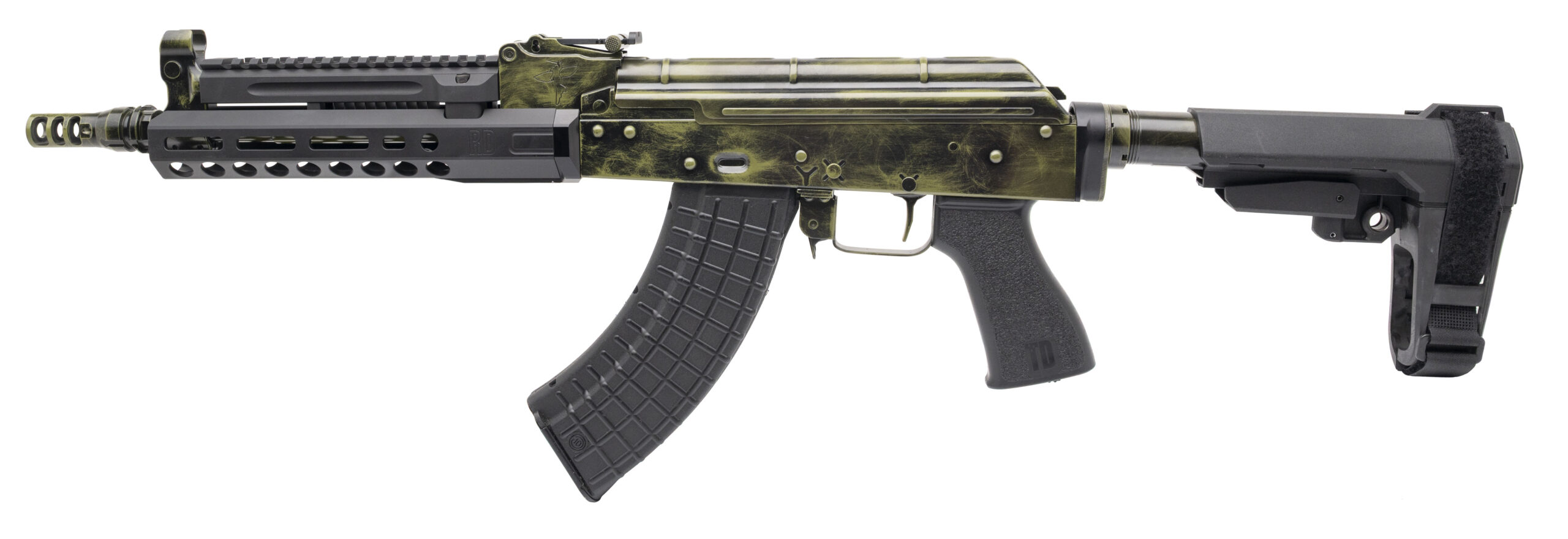 SN: RD47-1367. Modern production, 7.62x39mm with an 11.5" barrel w/Keymo muzzle brake. Semi-auto AK style pistol with custom distressed cerakote finish. Excellent condition overall.