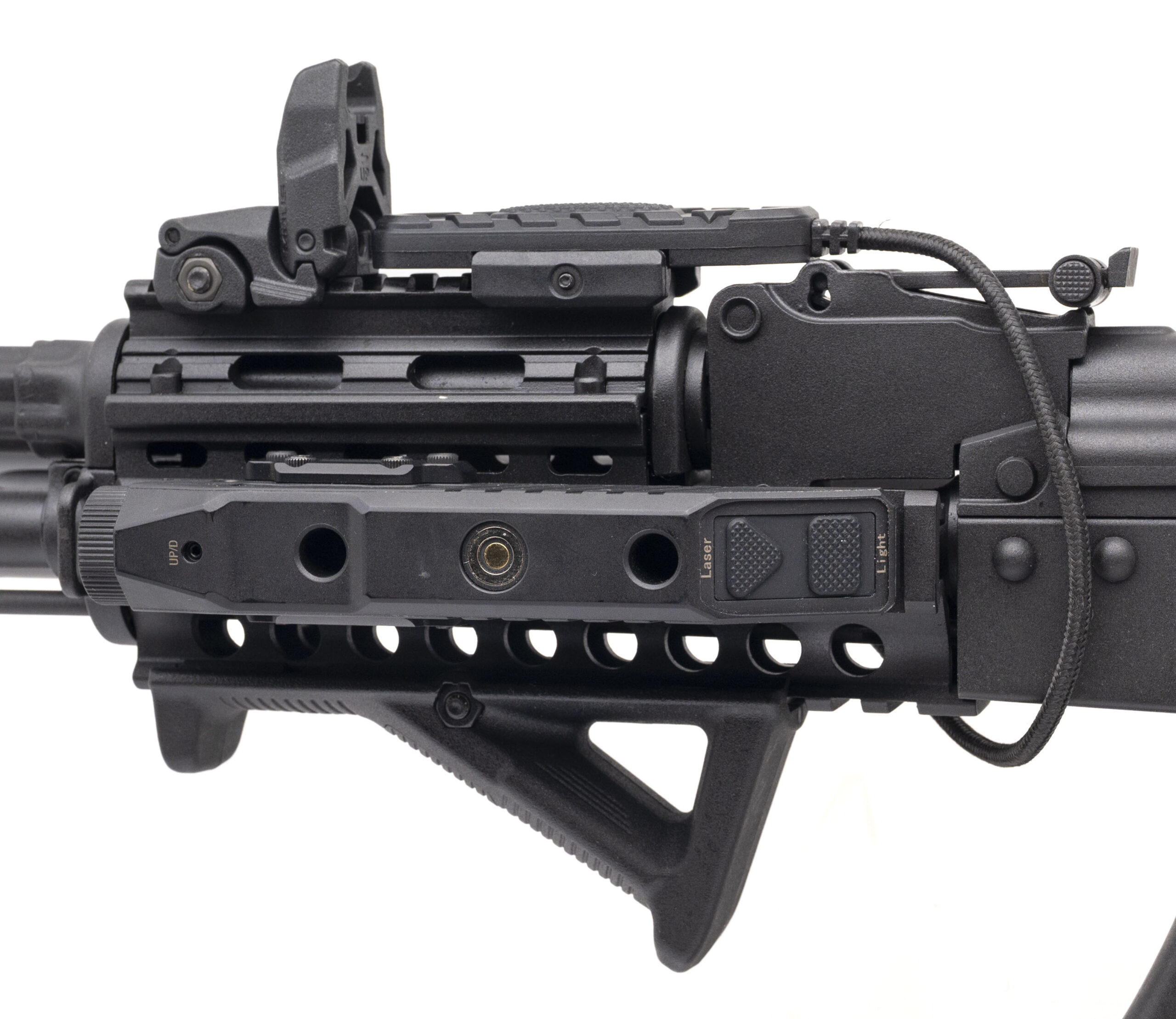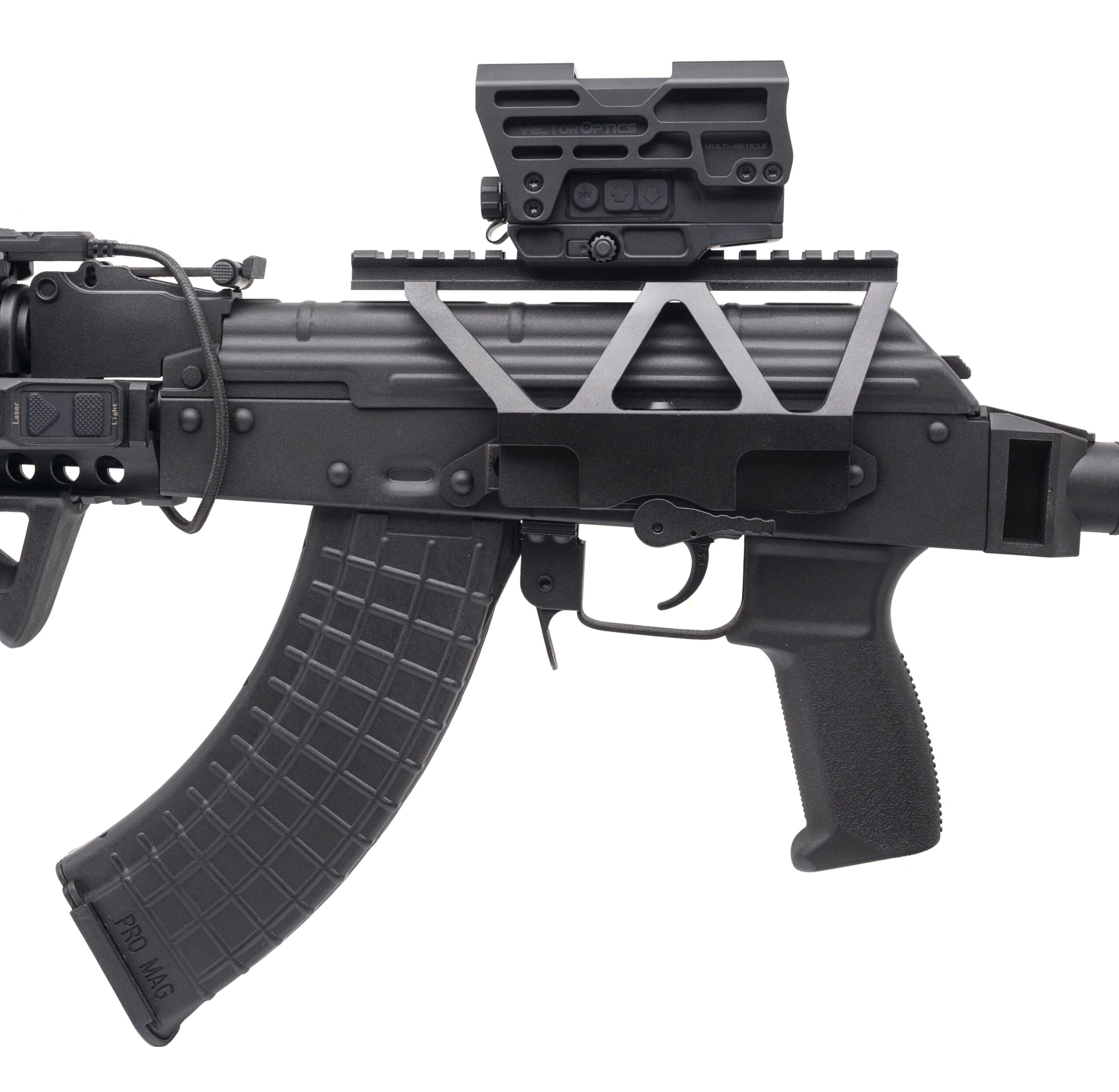 SN: B47192. Modern production, 7.62x39mm with a 16" barrel w/ an Hungarian AMD 65 Kalashinikov brake. Bore is bright with strong rifling. Semi-auto tactical AK rifle with an Frenzy Plus SCRD-67 1x31x26 red dot optic, Touchsoul TF-1133 green laser/light combo, GoPlant GP-FL01 red laser/light combo w/pressure switch, XTS one-point sling, and a Magpul angle grip. Overall condition is very good.