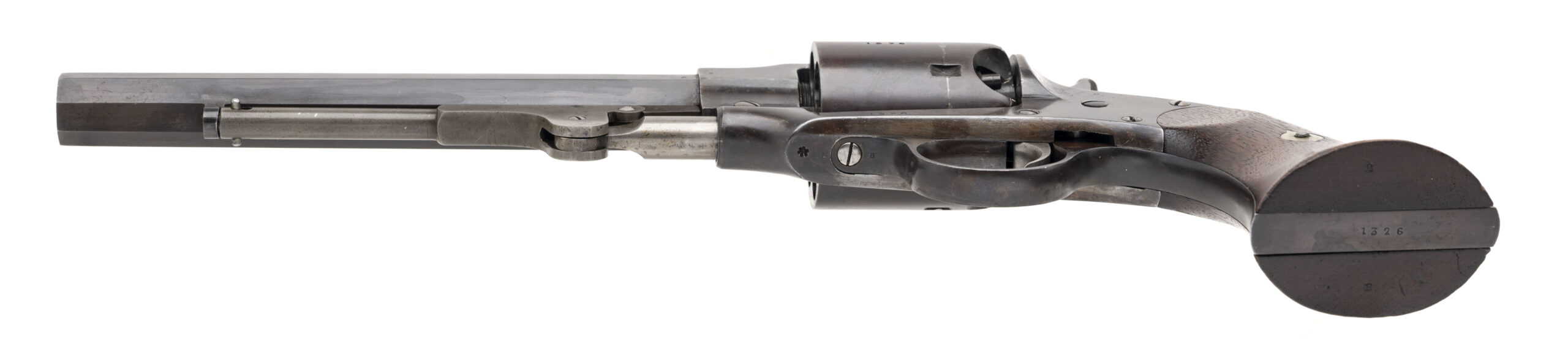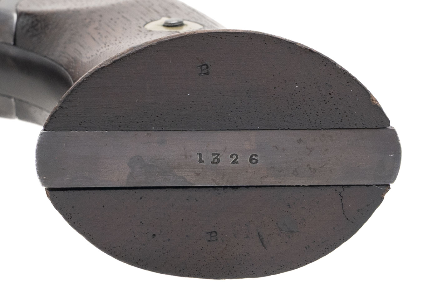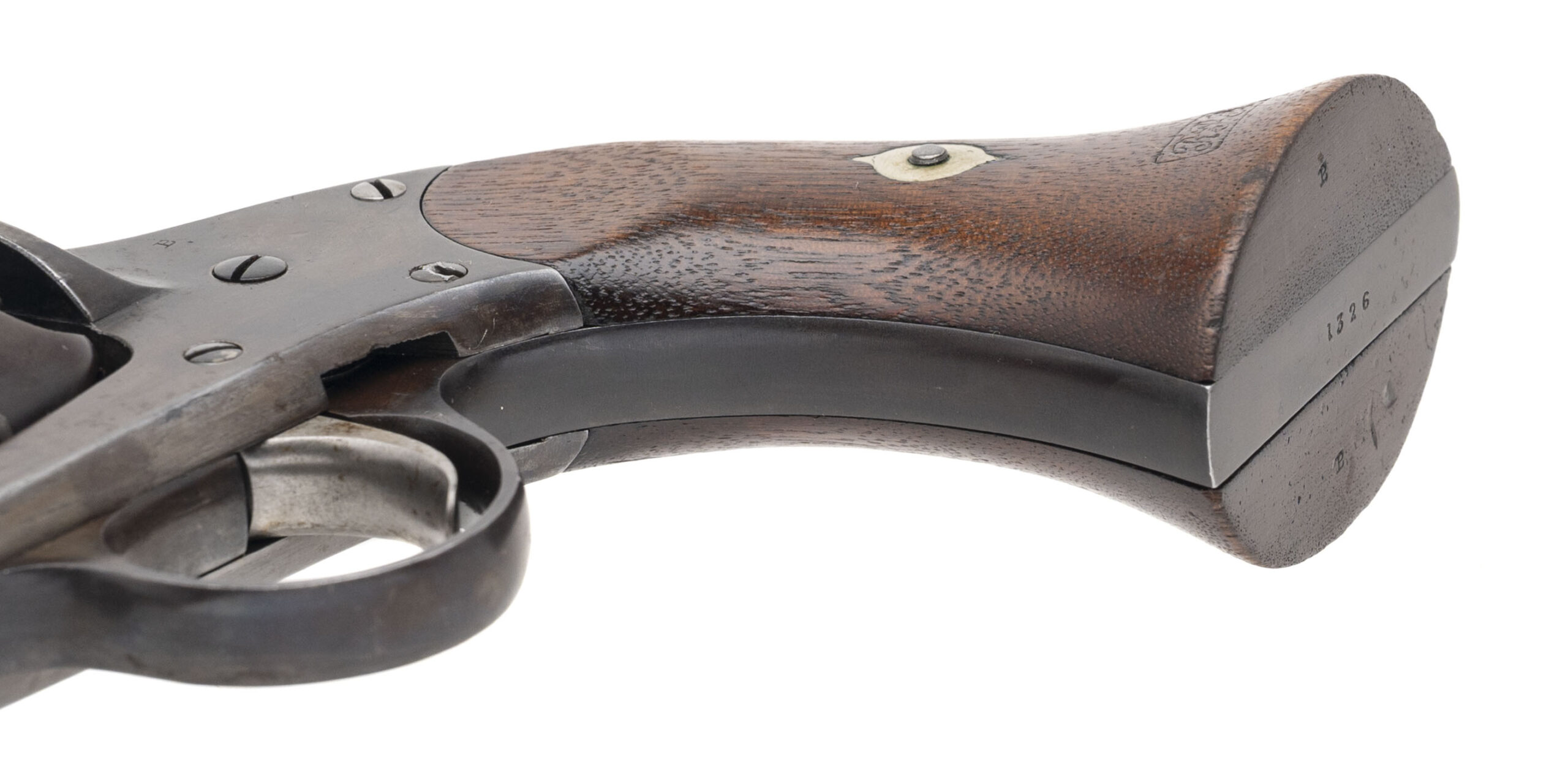 Serial number 1326. Made in 1865. 44 caliber with a 7.5” barrel. The metal has mostly plum patina. The gun shows no wear, but the blue finish has turned to a a patina. The grips are like new with perfect cartouches. These guns were made for the civil war, but were delivered and inspected after the war ended. These gun are extremely well made.