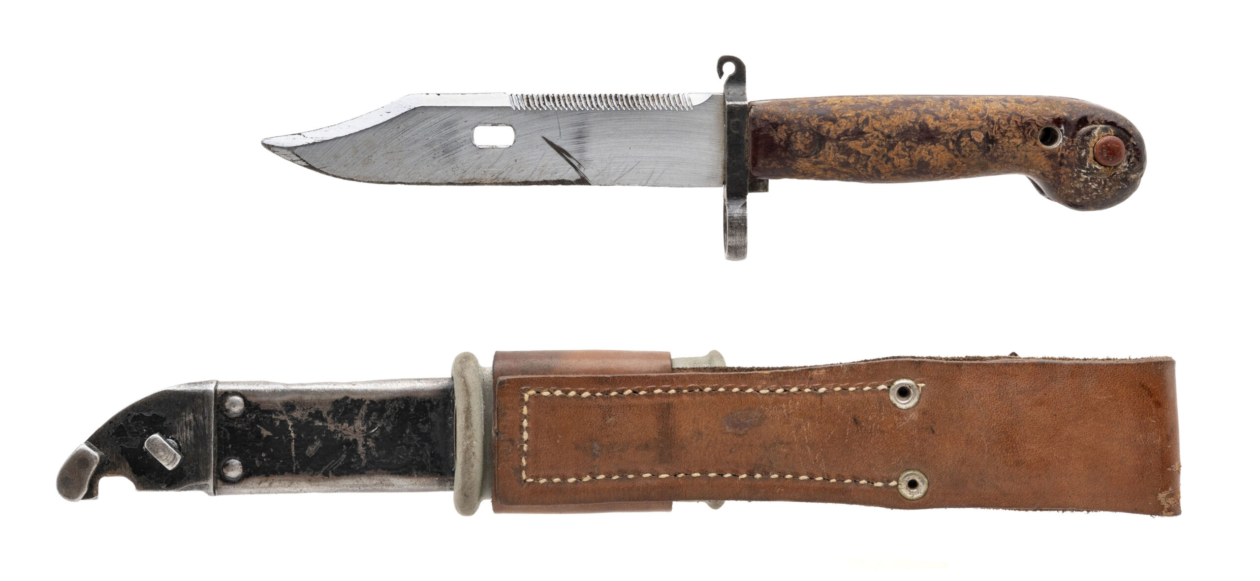 Romanian Md63 AKM knife bayonet with scabbard & leather frog. Overall length is 11-inches & the blade length is 5.75-inches. This is an Eastern Bloc military surplus bayonet & the well-worn condition is consistent with that situation.
