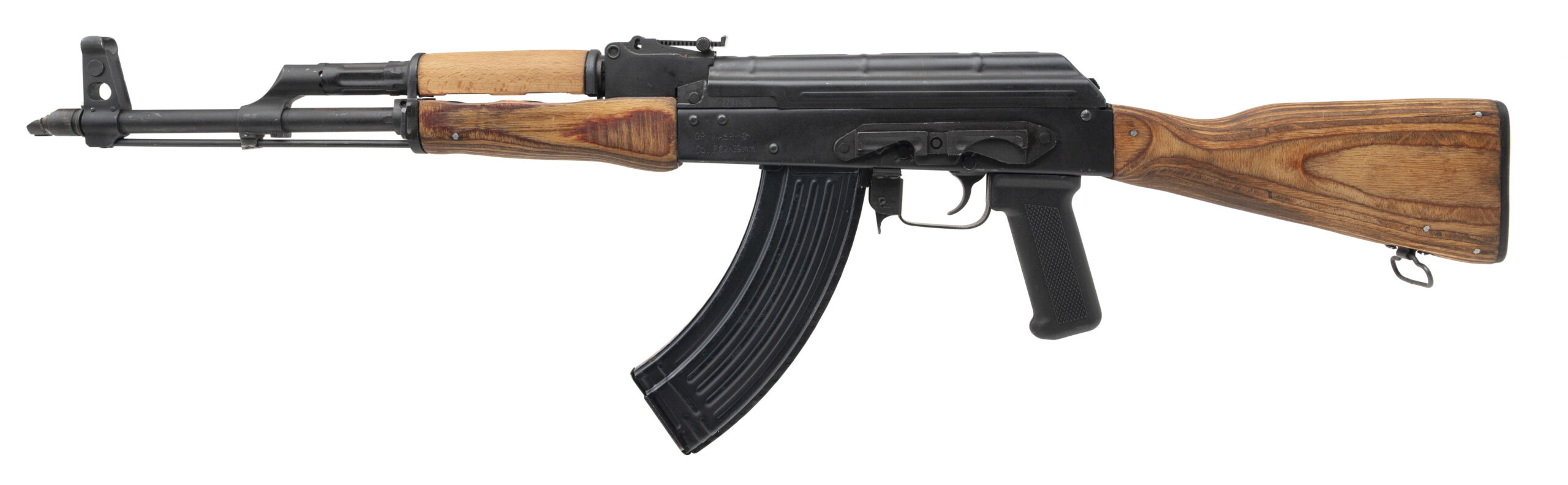SN: BM-2791-86. 1980s production, 7.62x39mm with a 16" chrome lined barrel. Bore is bright with strong rifling. Century Arms imported Romanian AKM pattern rifle with laminate wood furniture, side-mount rail adapter, bayonet lug adapter, and cleaning rod. Very good condition overall.