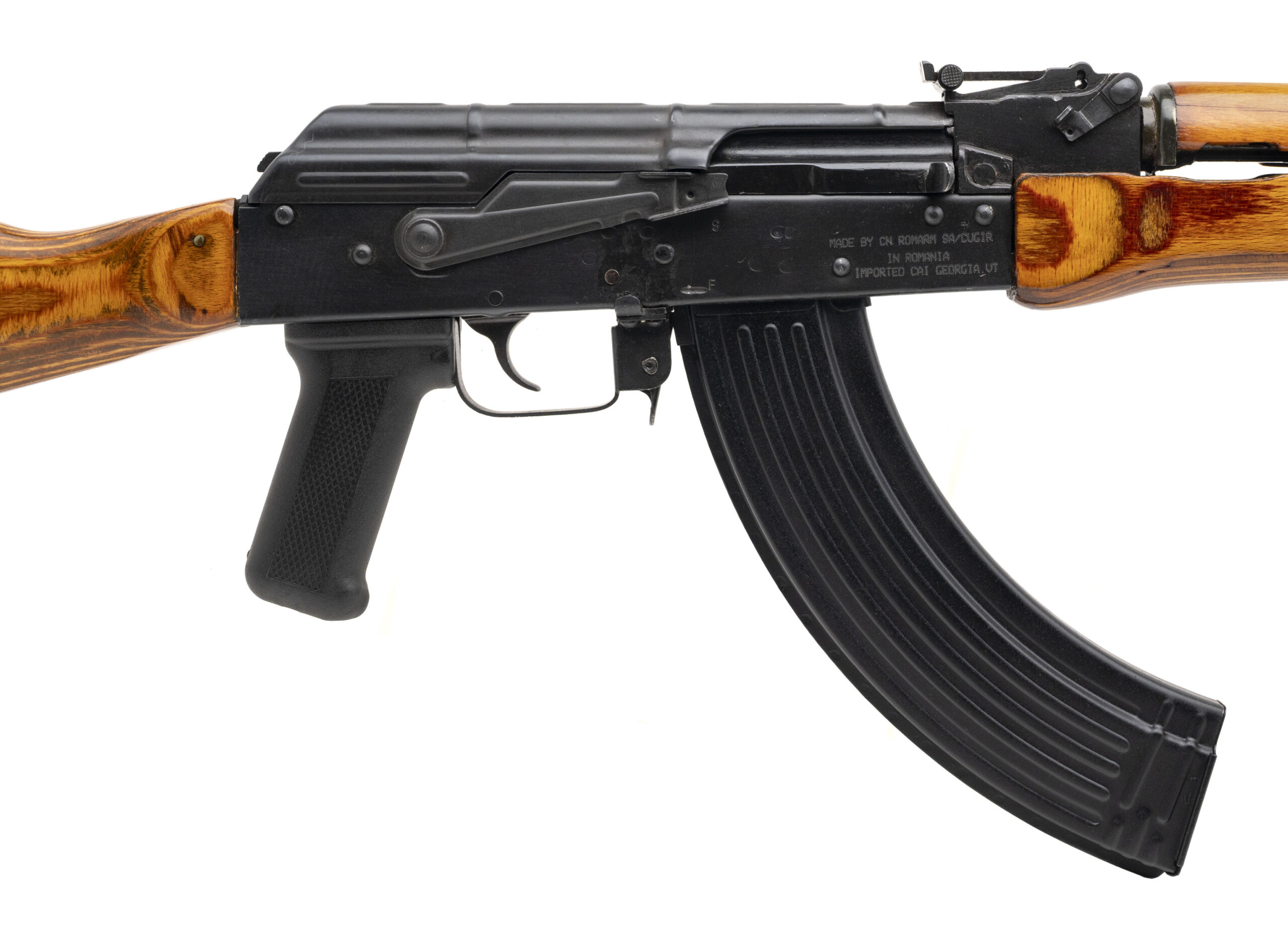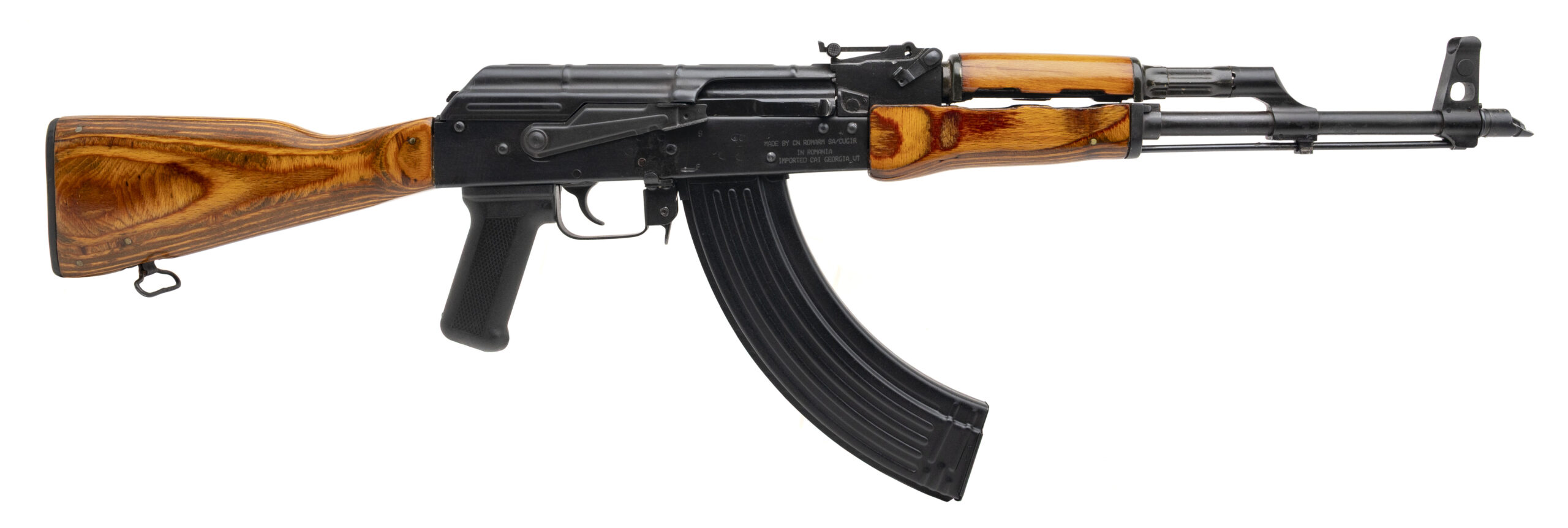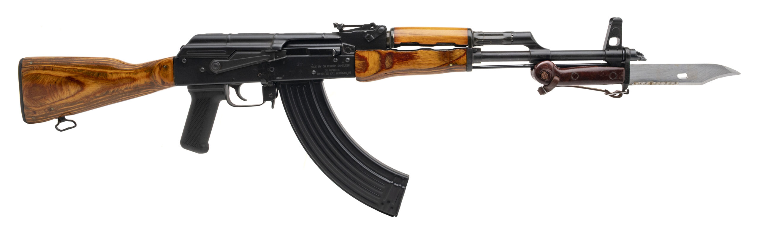 Serial number HA-1822-77. Made with an original Romanian 16.3-inch chrome-lined barrel that has a bright bore with strong visible rifling. This rifle is a combination of modern & 1977 production in so far as it was assembled using components from a mostly-matching 1977-dated Romanian PM md.63 Kalashnikov parts kit & US made 922(r) compliant parts including the pistol grip, gas piston & the receiver. Gun is equipped with a slant muzzle brake, a siderail, a U.S. made TapCo G2 trigger & U.S. made laminated hard wood furniture. Comes with a Romanian 40-round magazine & a Romanian bayonet with scabbard & leather frog.