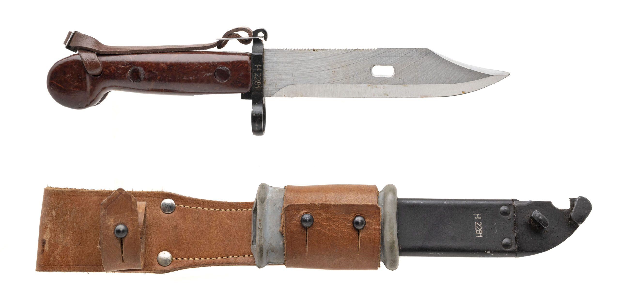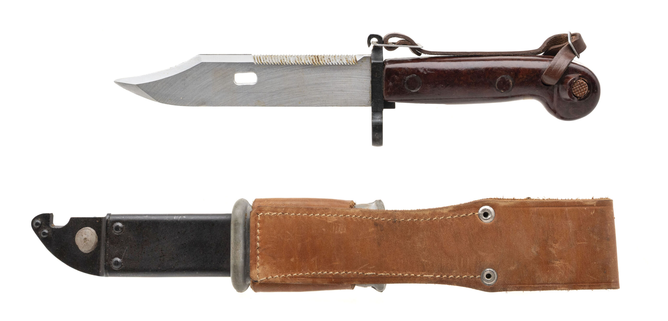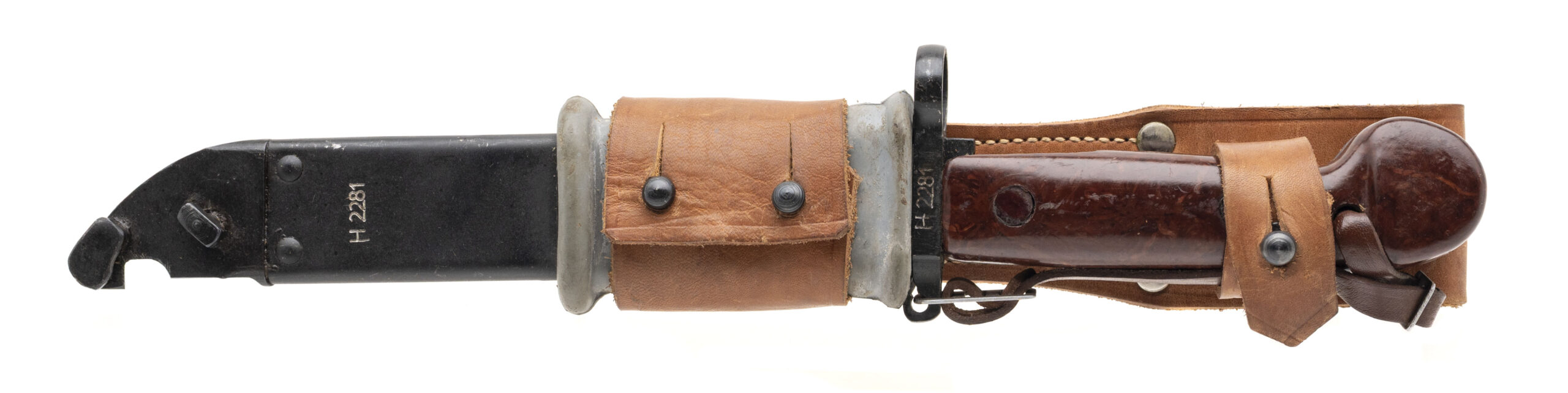 Serial number HA-1822-77. Made with an original Romanian 16.3-inch chrome-lined barrel that has a bright bore with strong visible rifling. This rifle is a combination of modern & 1977 production in so far as it was assembled using components from a mostly-matching 1977-dated Romanian PM md.63 Kalashnikov parts kit & US made 922(r) compliant parts including the pistol grip, gas piston & the receiver. Gun is equipped with a slant muzzle brake, a siderail, a U.S. made TapCo G2 trigger & U.S. made laminated hard wood furniture. Comes with a Romanian 40-round magazine & a Romanian bayonet with scabbard & leather frog.