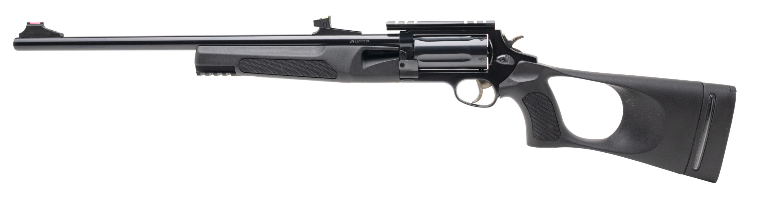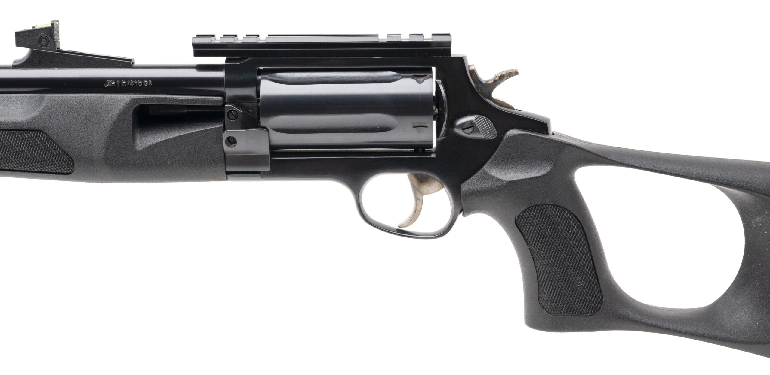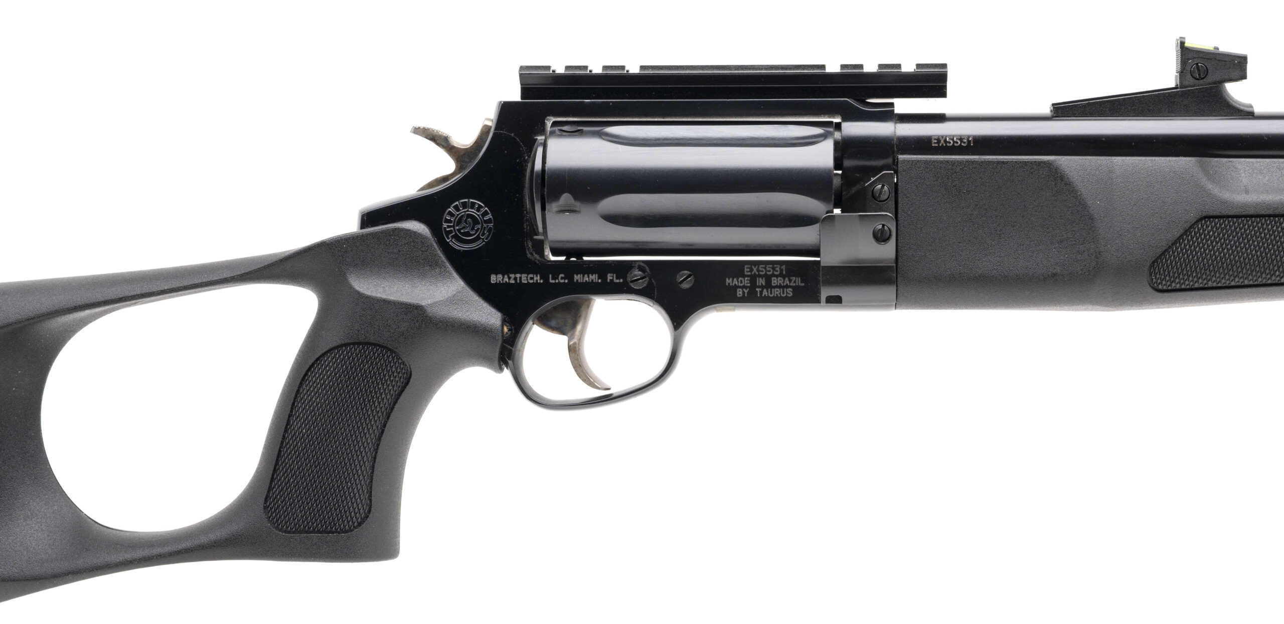 SN: EX5531. Modern production, .45 Colt/.410 Gauge with an 18.5" barrel chambered for 3" shells. Bore is excellent. Double-action revolving hybrid rifle with a fiber-optic front & rear sight, 5rd cylinder, picatinny optic rail, blued finish, and black checkered thumbhole synthetic stock w/integrated picatinny accessory rail. Stock shows minor marks. Includes original box. Overall condition is near excellent.