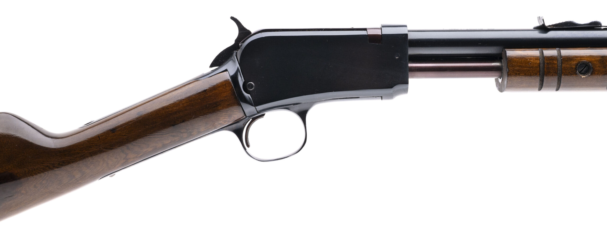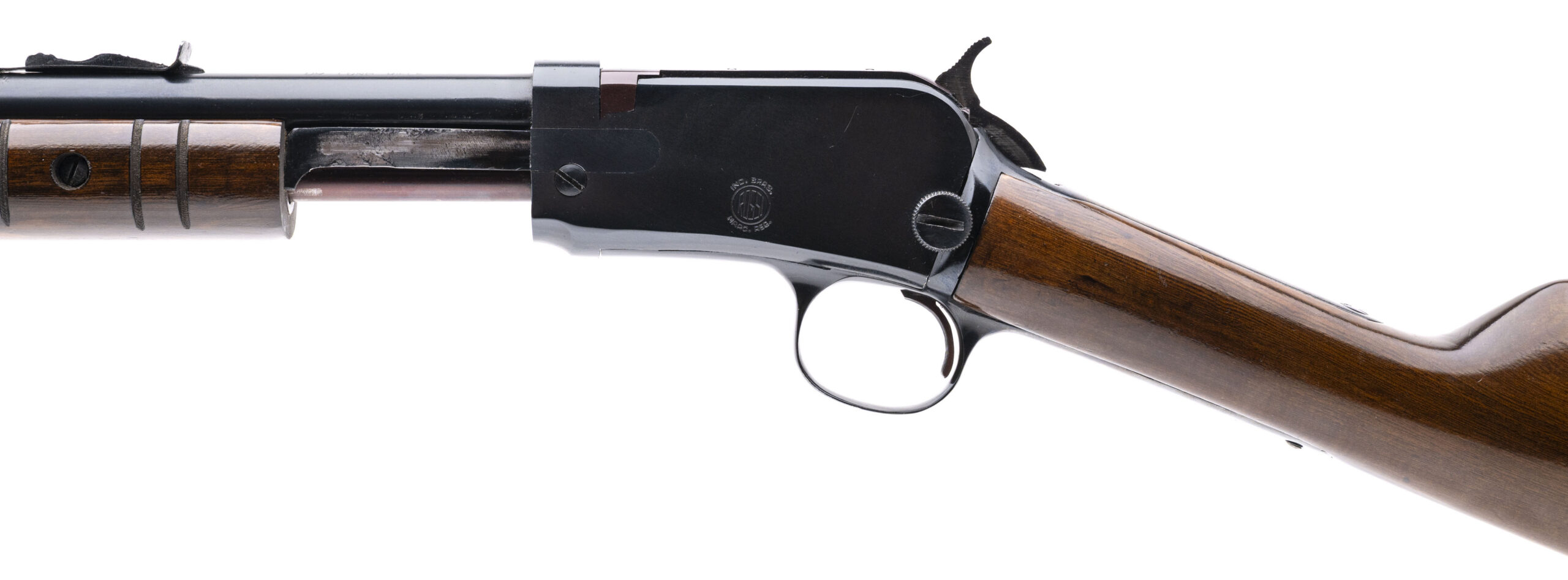 SN: G88881 made in Brazil circa 1970's. 22 caliber takedown pump action rifle with a 26" round barrel, iron sights, blued metal finish and walnut furniture with the original butt plate. Some discoloration in the stock and the breech block and mag tube have turned a plumb blue, overall in good solid condition with an excellent bore.