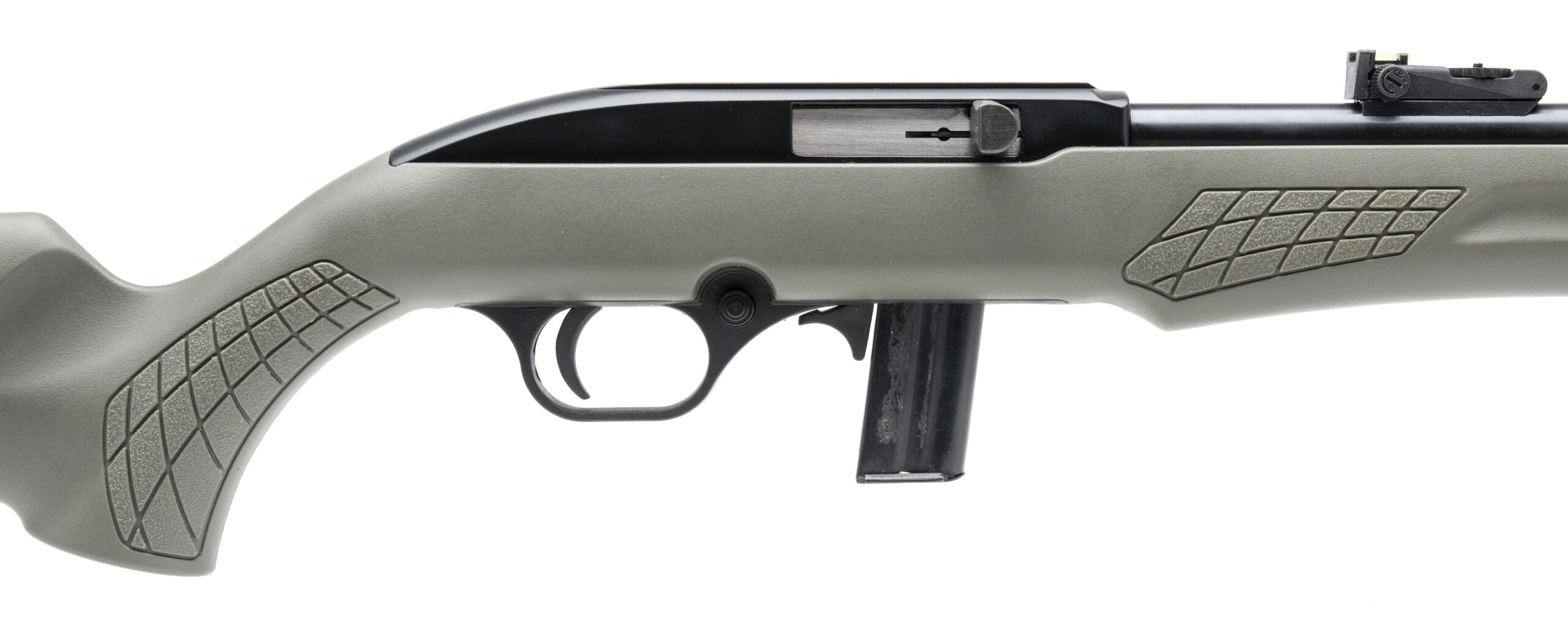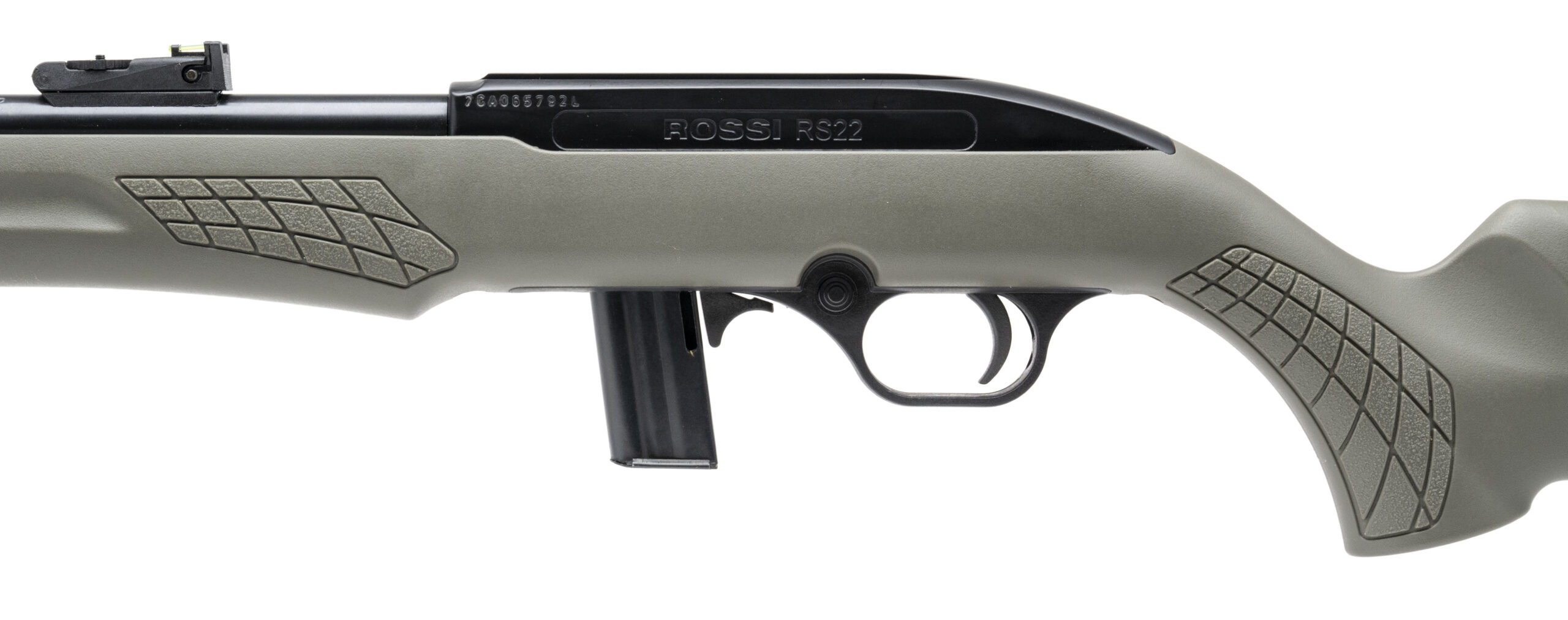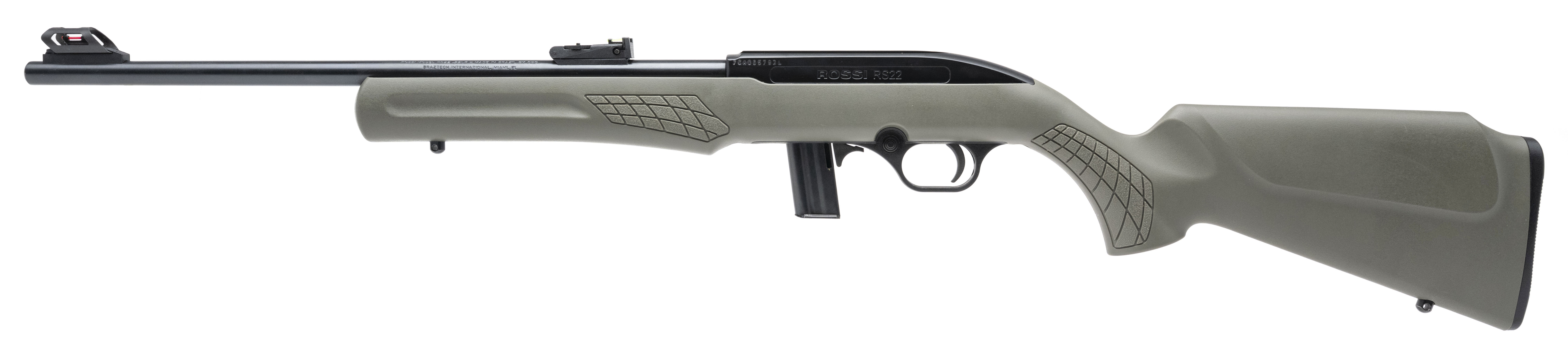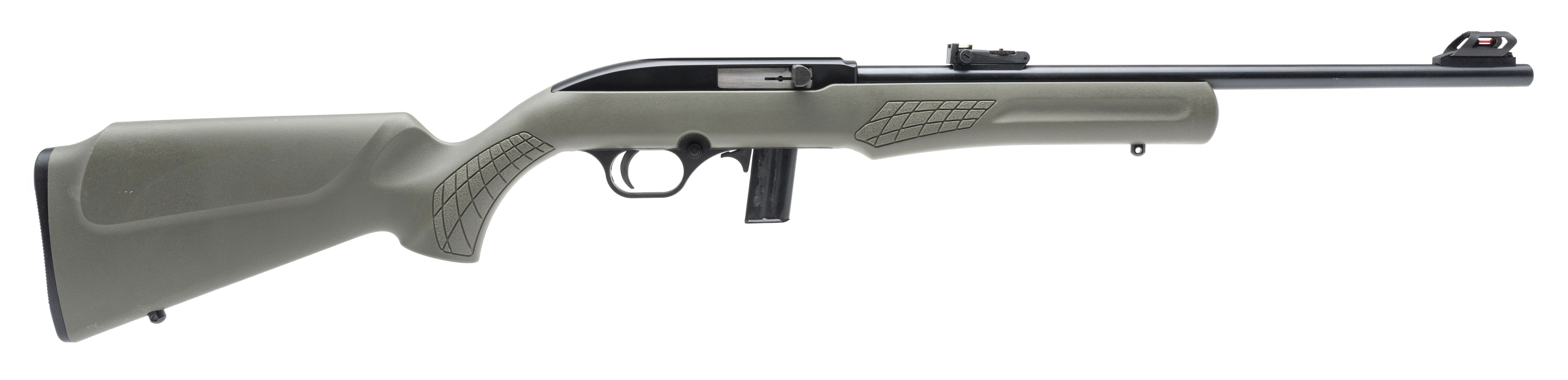 SN: 7CA065792L. Modern production. Semi-automatic rimfire rifle made by Rossi. 18" barrel chambered for .22LR. Excellent condition. Black metal finish with green polymer stock. Features fiber-optic adjustable sights and extended charging handle. Comes with magazine.