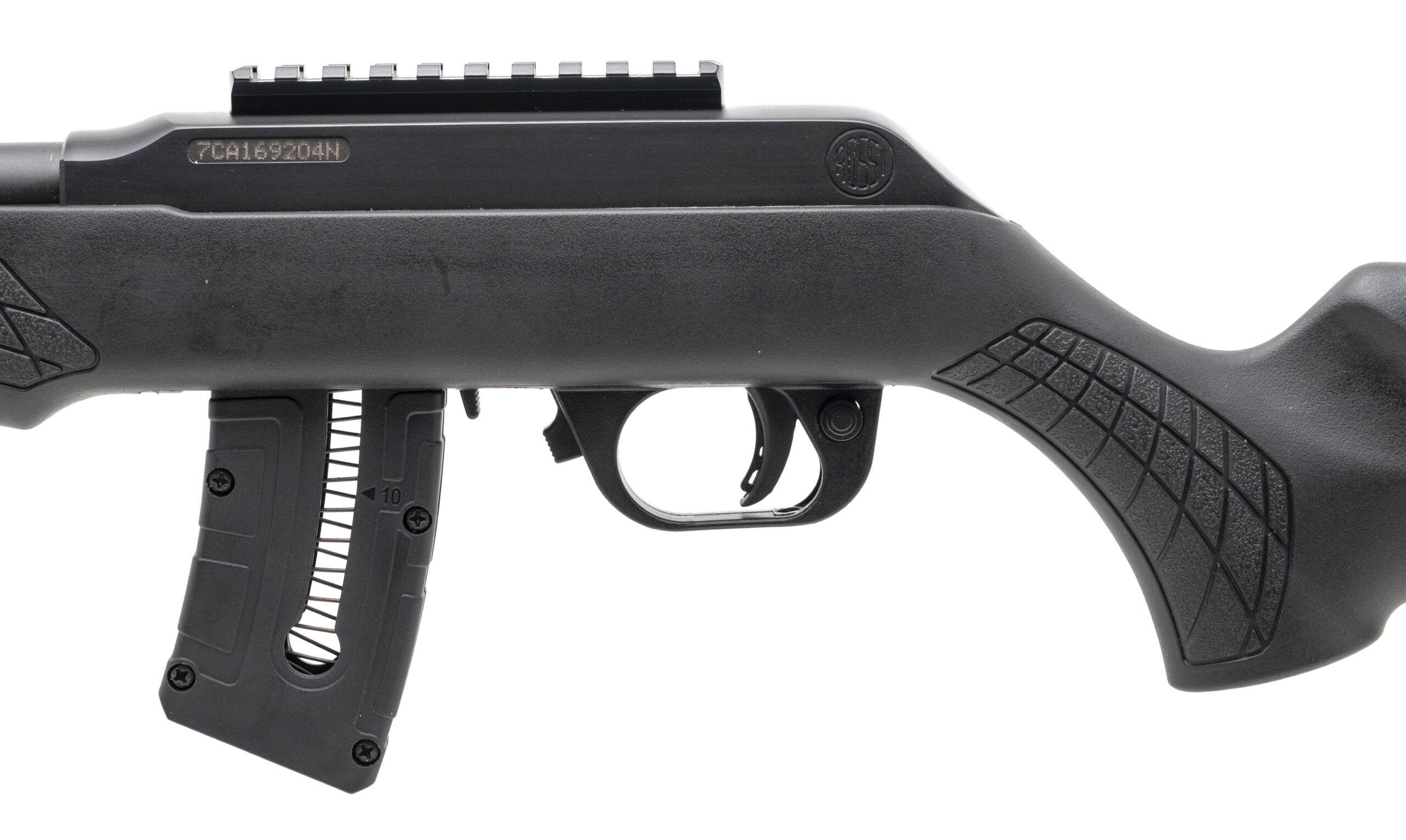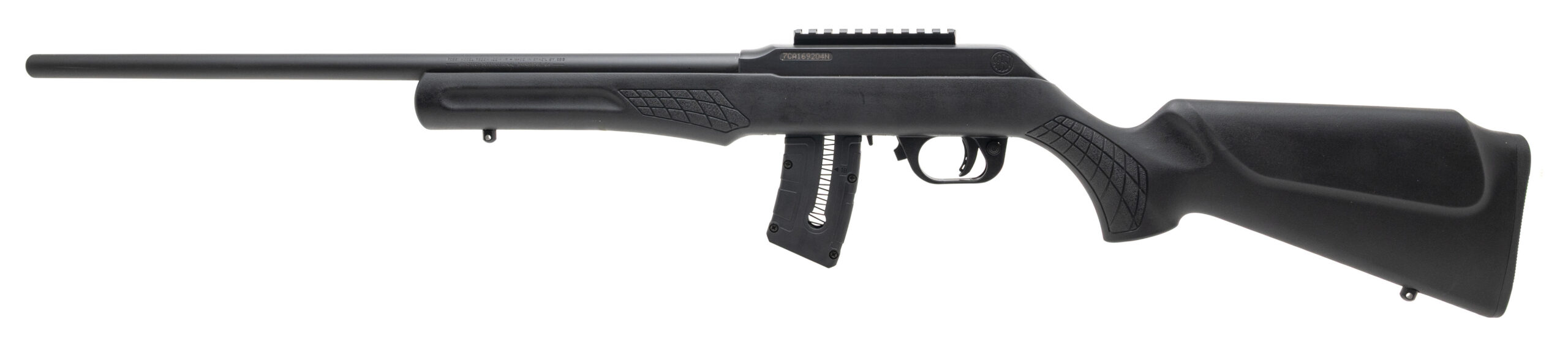 SN: 7CA169204N. Modern production, .22 MAG. with a 21" barrel. Bore is excellent. Semi-auto rimfire rifle with a picatinny optic rail, matte blued finish, and black textured synthetic stock. Finish shows light marks. Overall condition is very good.