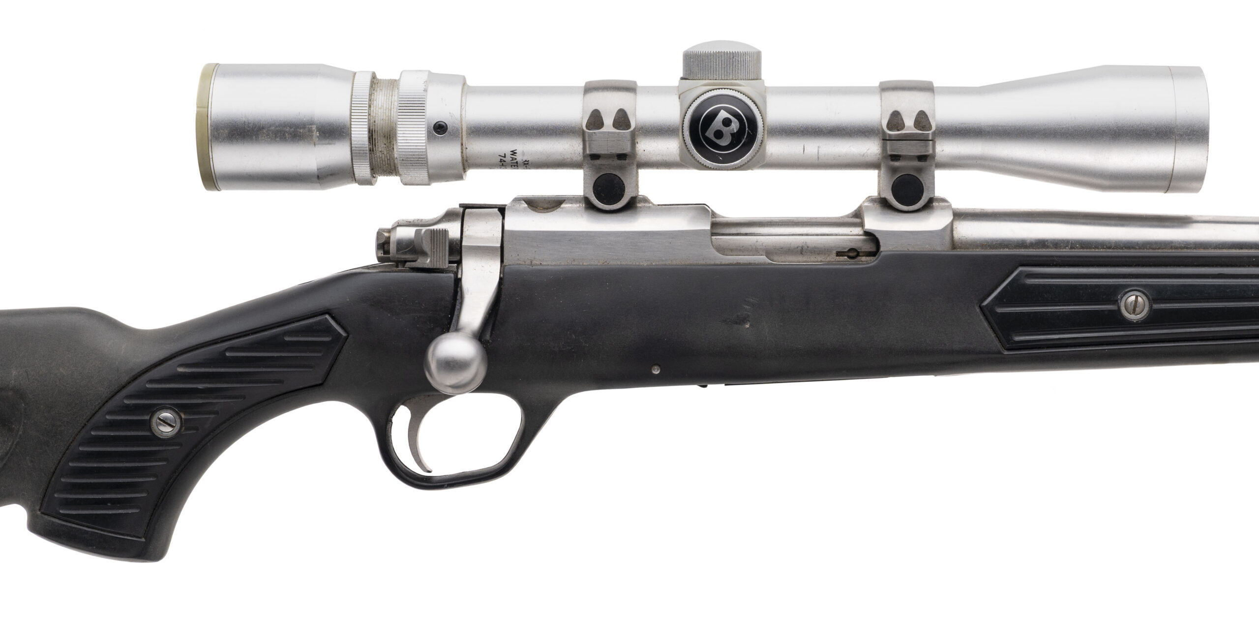 SN: 701-81330 modern production stainless steel bolt action rifle chambered in 22 Win Mag RF with a 20" round barrel, Bushnell Sportview 3-9 scope, 10 round detachable rotary magazine in a synthetic stock. Some light wear and handling marks on the stock, overall in very good condition with an excellent bore. Comes with sling.