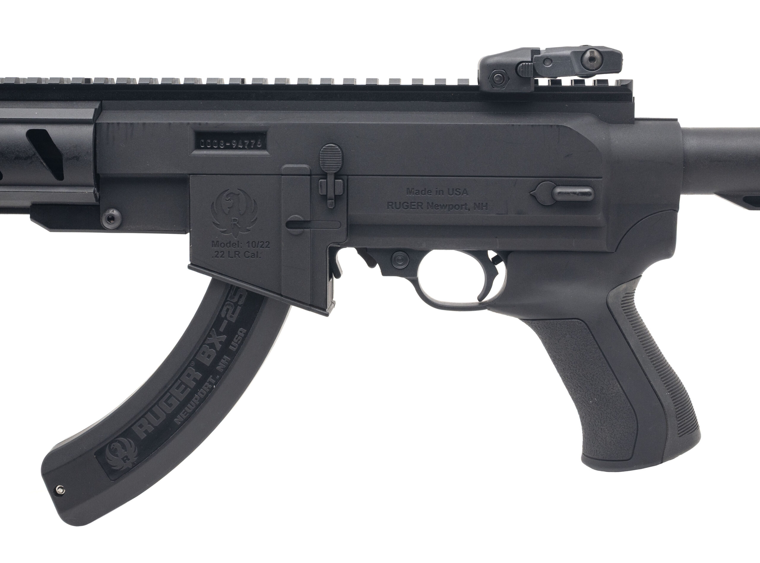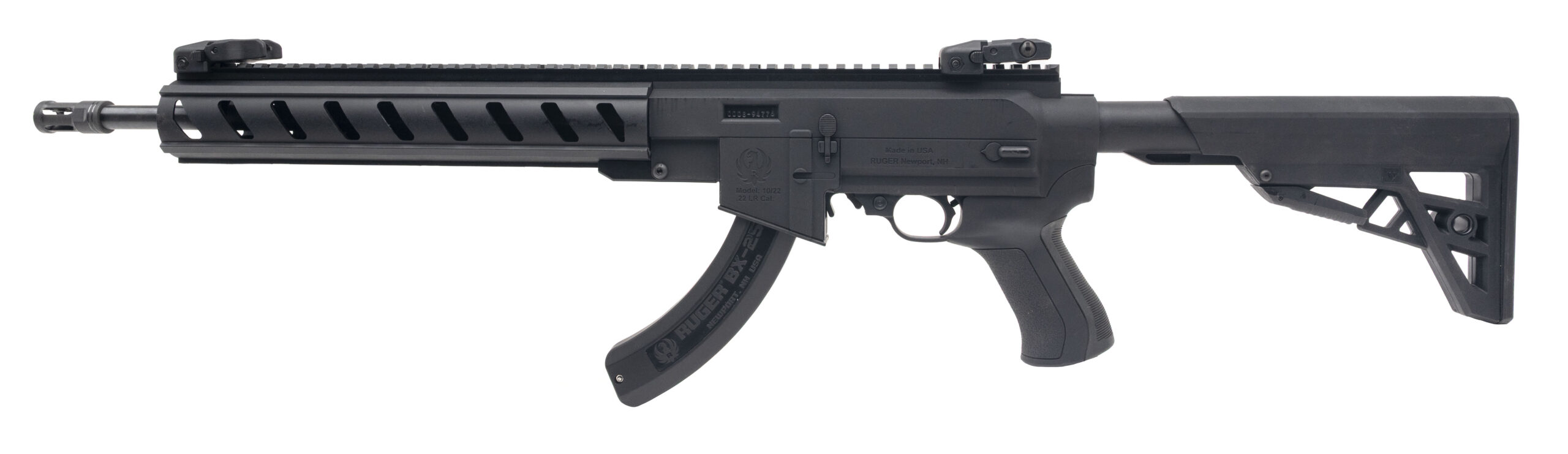 Serial number 0008-94776. Made in 2017 with a 16-inch free-floated barrel that is threaded 1/2x28 & has a Ruger proprietary birdcage style flash suppressor mounted on the muzzle. Condition overall is excellent with a bright bore that has strong visible rifling. This 10/22 comes in the ATI AR-22 "Tactical" chassis assembly that provides a full length monolithic top rail & a 5-position length-of-pull adjustable butt stock. Comes with a 25-round BX-25 detachable box magazine & Ruger Rapid Deploy flip-up adjustable front/rear sights.