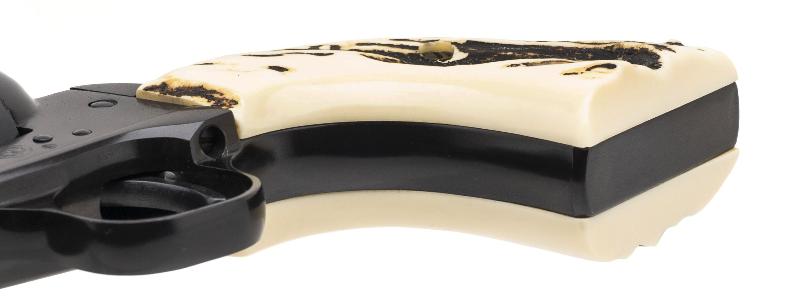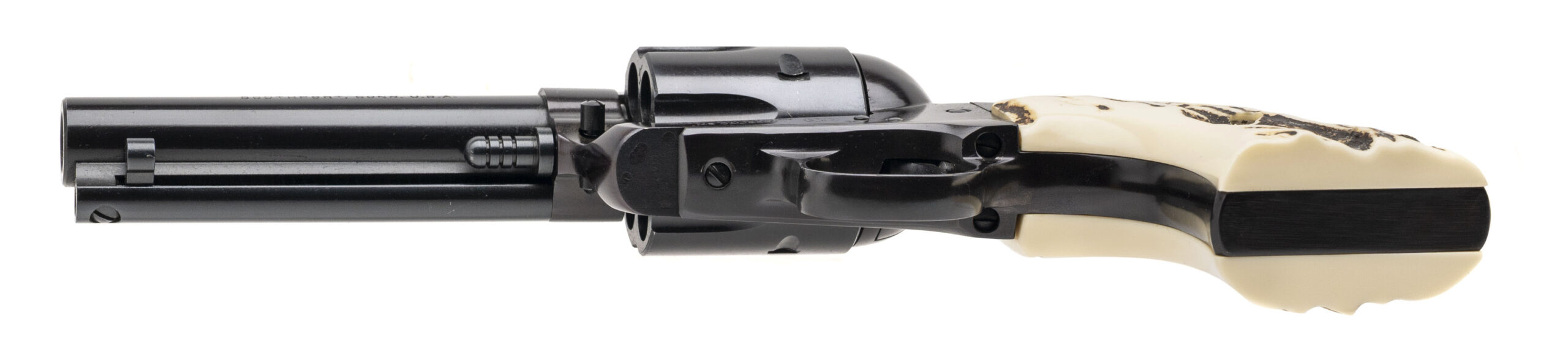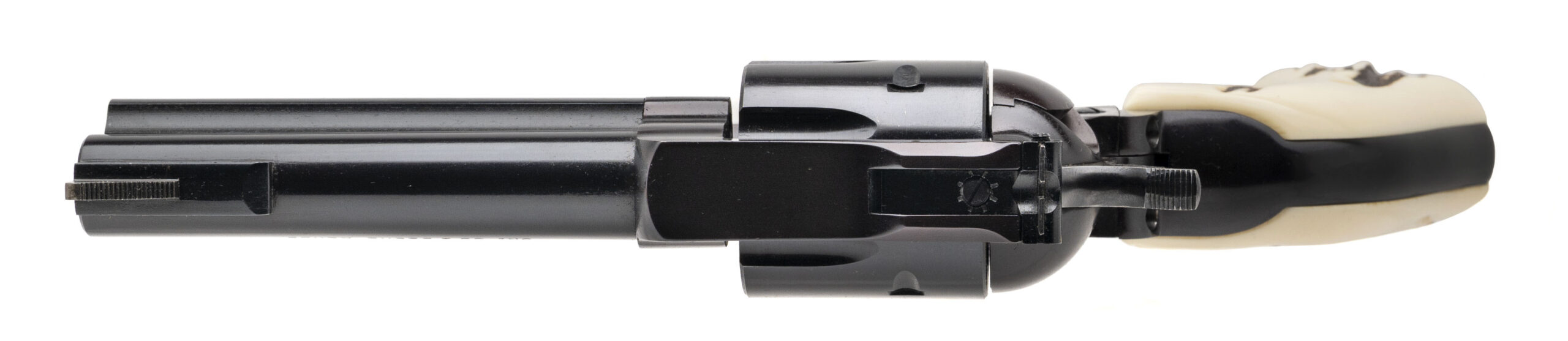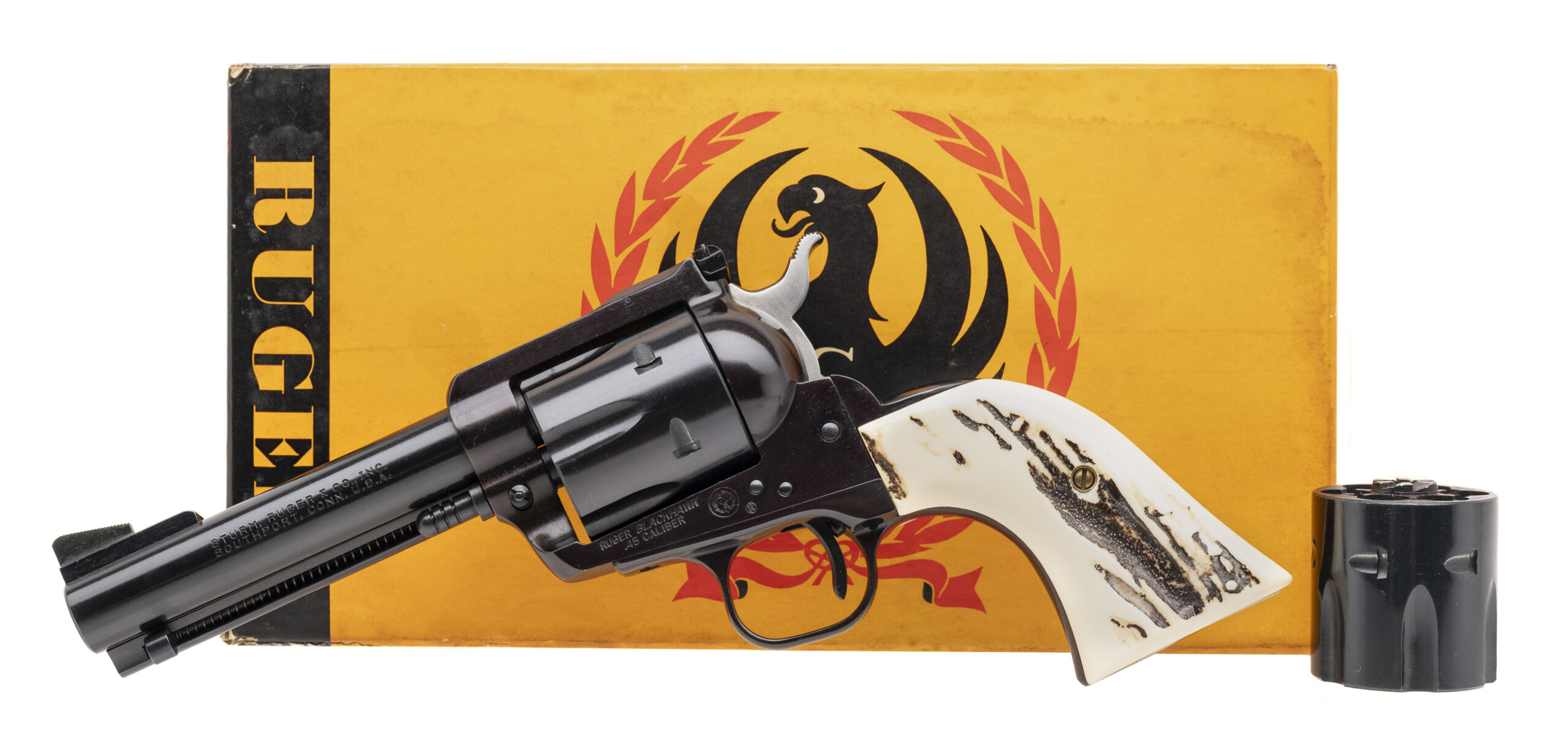 SN: 45-08655. Made in 1981, .45 Colt/.45 ACP with a 4.6" barrel. Bore is very good. Single-action only revolver with an adjustable rear sight, 6rd cylinder, blue finished frame, and staghorn grips. Metal shows light marks. Overall condition is near excellent. Includes additional 6rd .45 ACP cylinder, and original box.