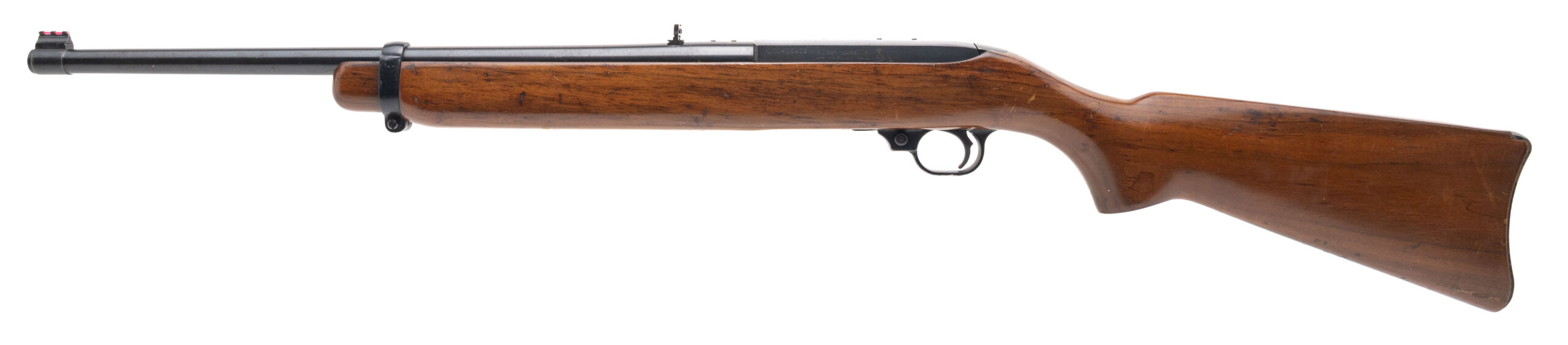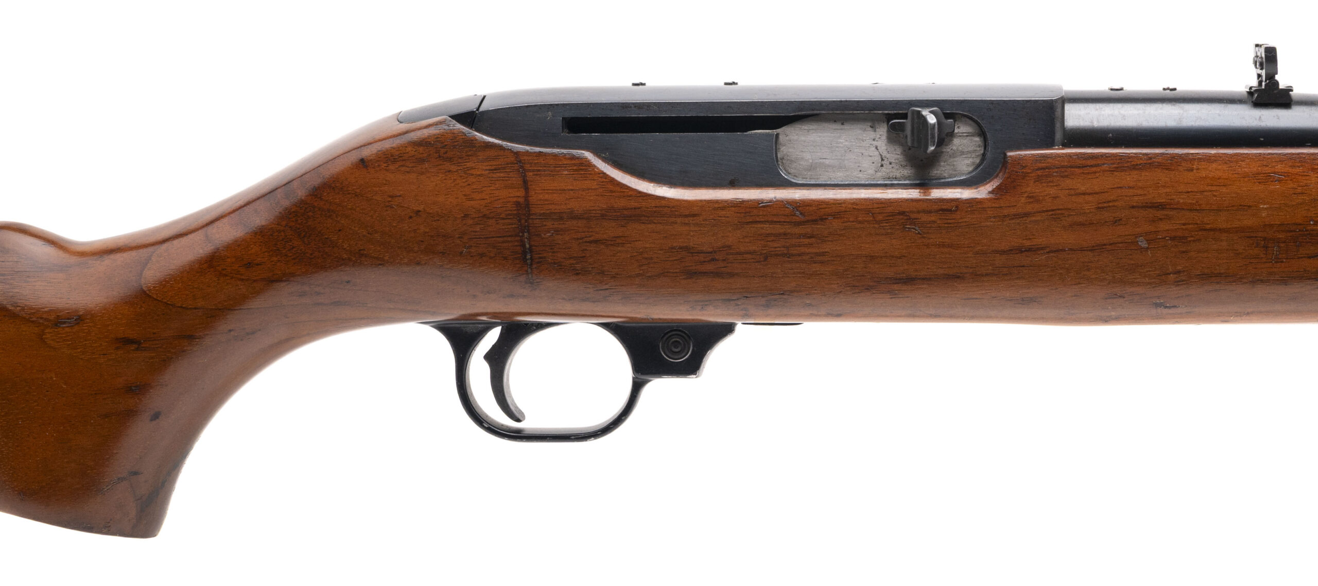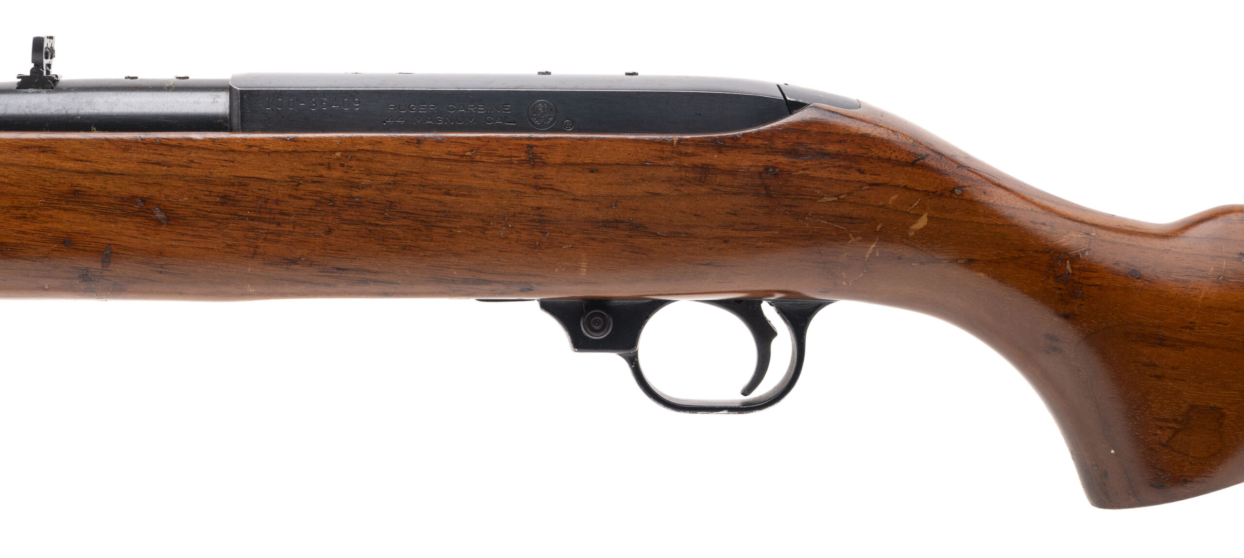 SN: 100-36409 made in 1972. Semi-auto tube fed 44 magnum with an 18" round barrel, banded fiber optic front sight and flip up rear sight with filler screws in the receiver for scope mounts. Blued metal finish and walnut stock with original metal curved butt plate. Moderate wear and handling marks with some finish loss and light speckling, most of the original bluing still visible, no cracks or damage and the bore is excellent.