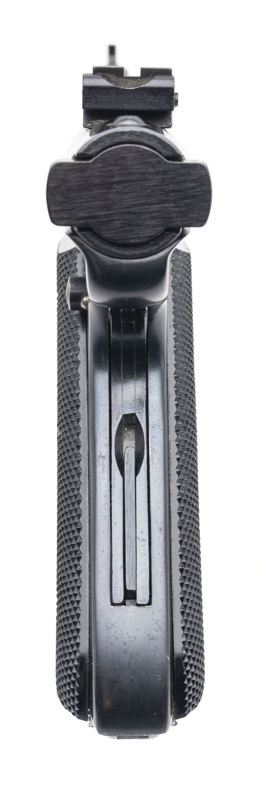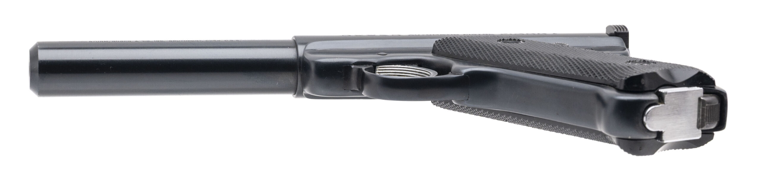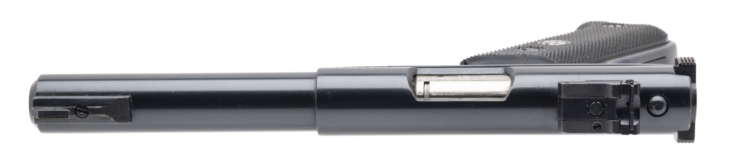 SN: 14-92157 made in 1979. Semi-auto 22lr target pistol with a 5.5" bull barrel, adjustable target sights, original black checkered medallion grips and original stainless base magazine. Metal has been professionally reblued and is in very good overall condition with an excellent bore.