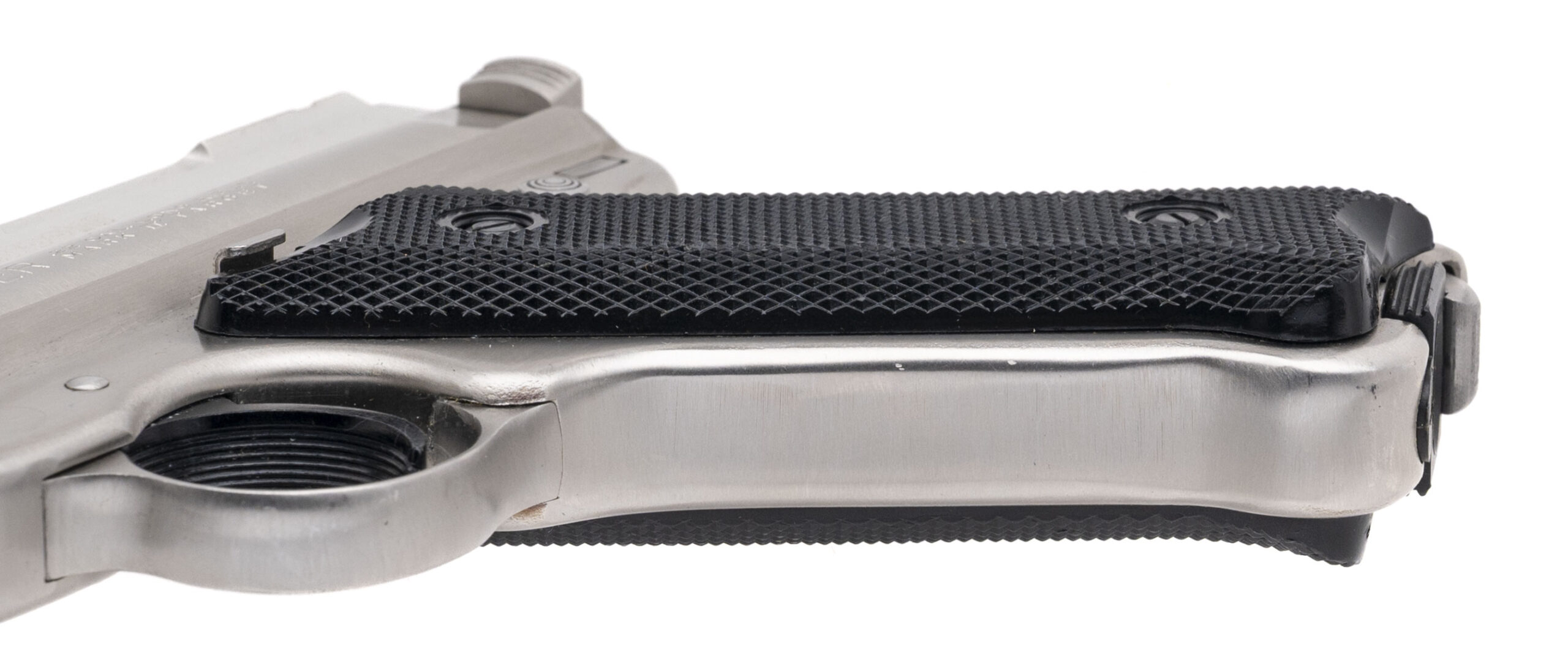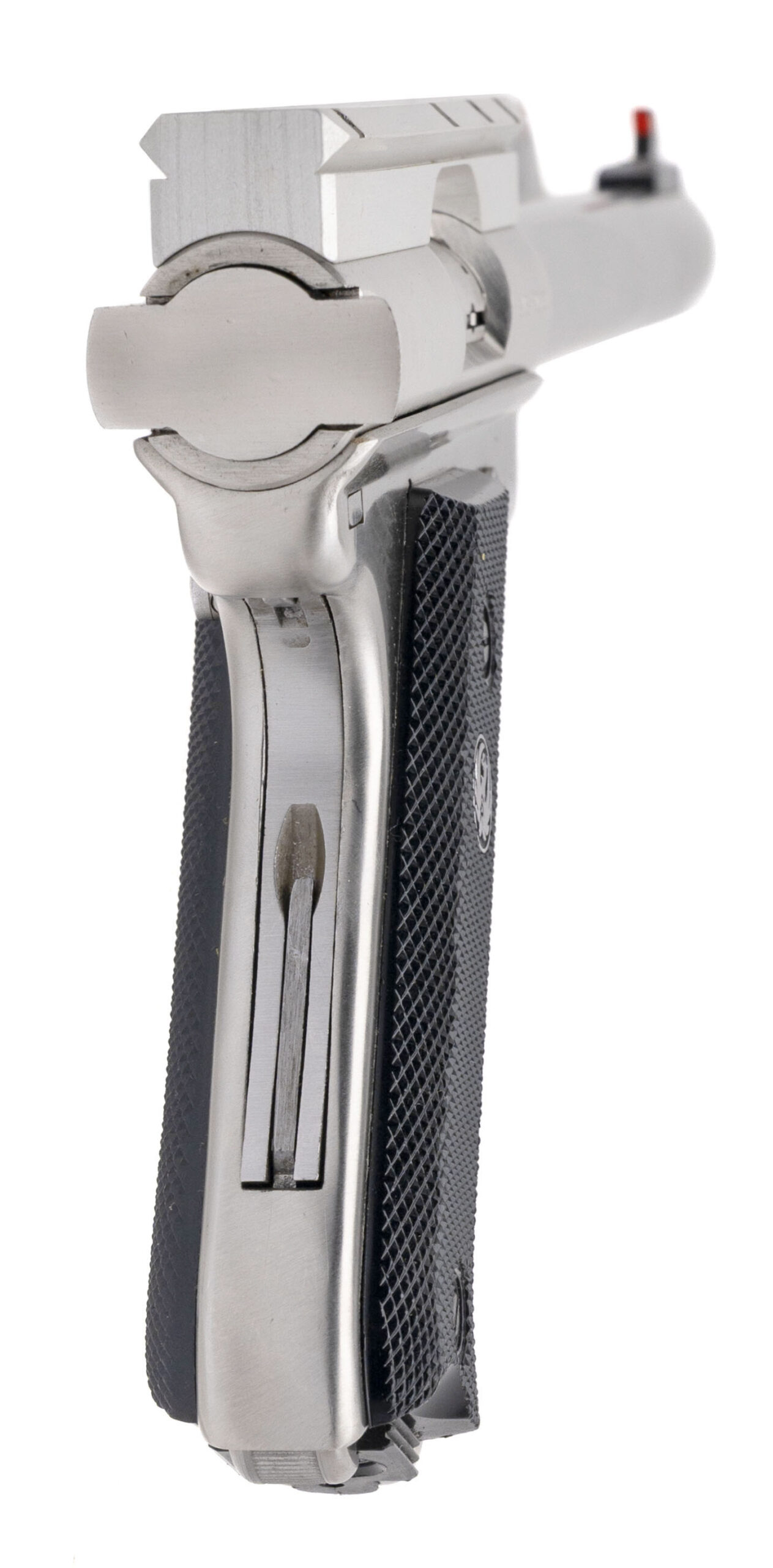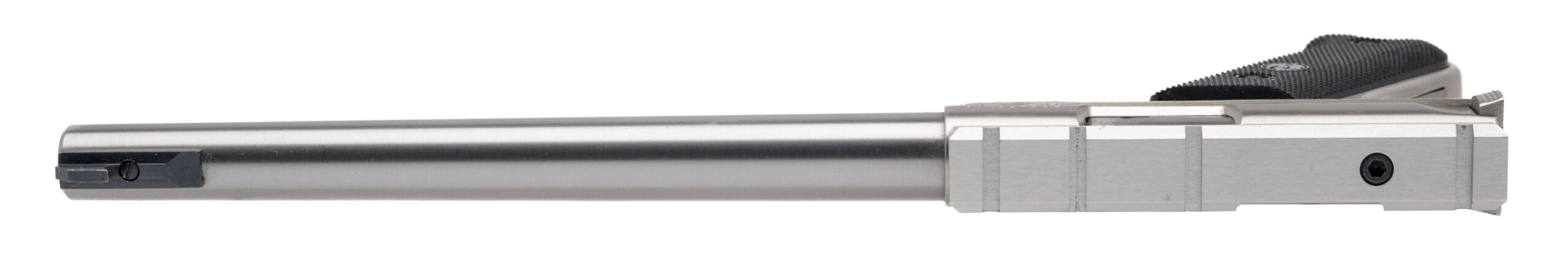 SN: 215-79109. Made in 1990, .22LR with a 10" barrel. Bore is excellent. Scarce stainless steel rimfire target pistol with an Aimpoint scope mounting rail, bladed front sight, manual thumb-safety, and checkered plastic grips. Metal shows moderate handling marks throughout, most notably to the underside of the barrel. Overall condition is very good.